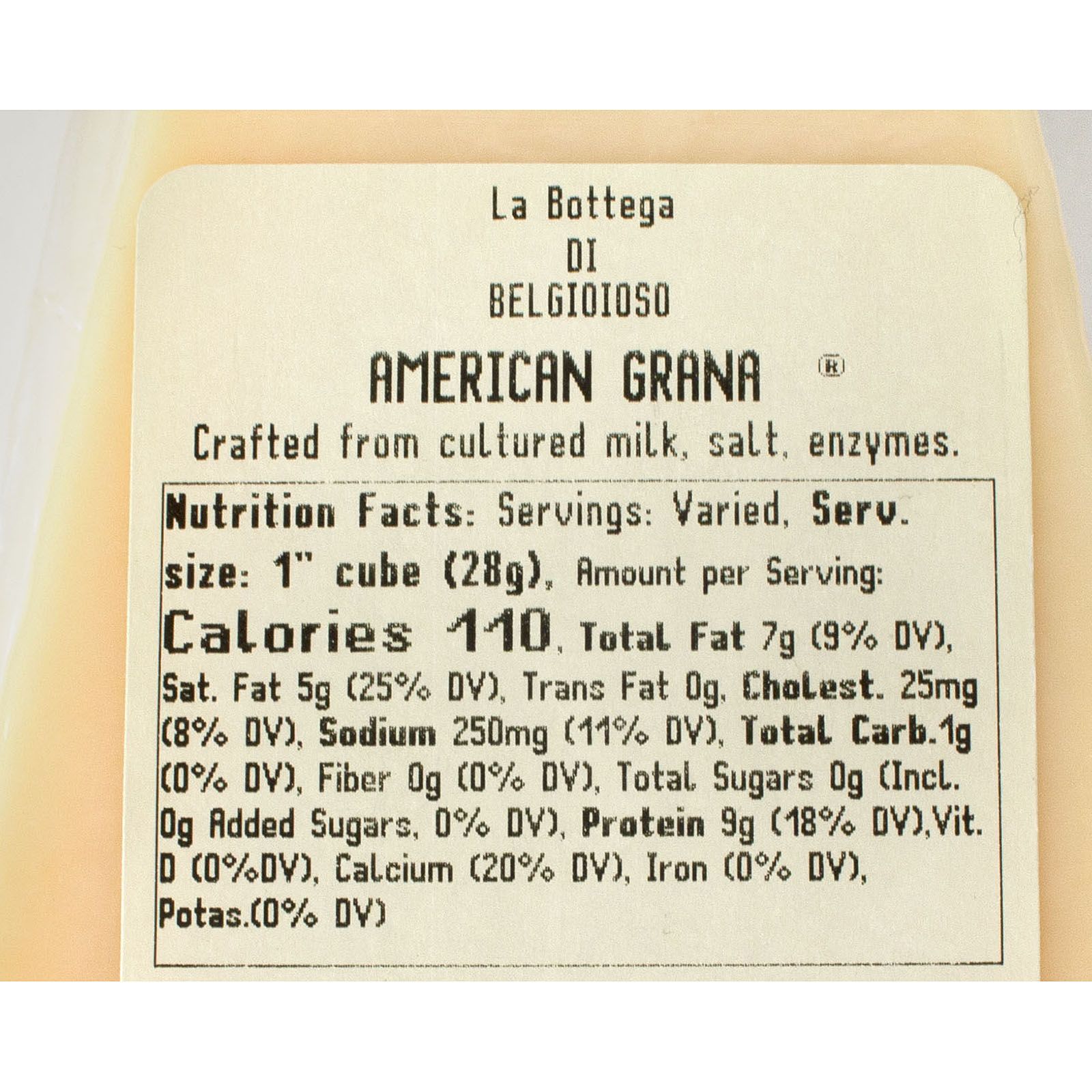 Extra aged Parmesan cheese with a nutty full-bodied flavor All natural ingredients Crafted from raw cow's milk in Wisconsin Aged a minimum of 18 months rBST free Gluten free Product of Wisconsin, USA Includes 1 lb. wedge of Belgioioso American Grana Parmesan cheese