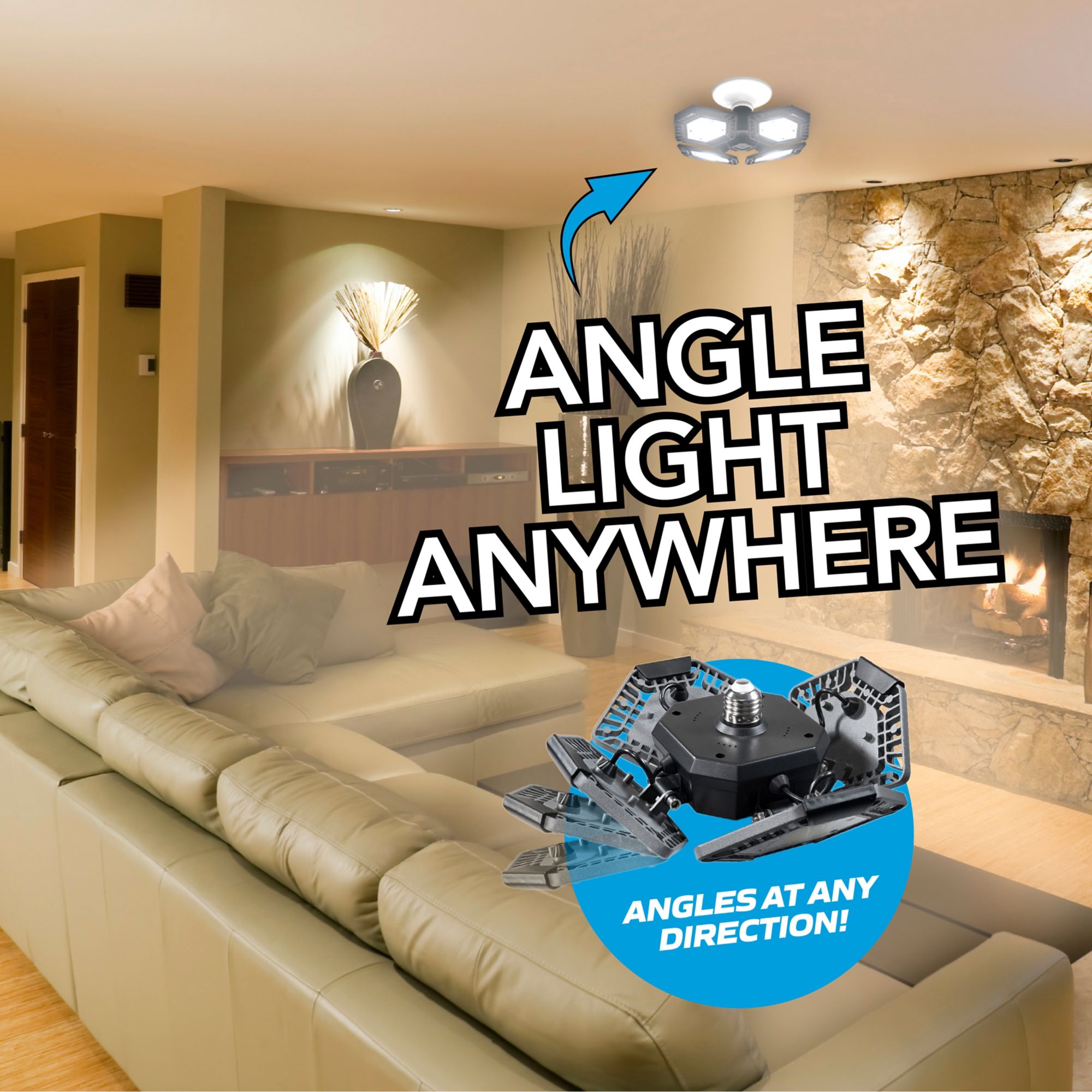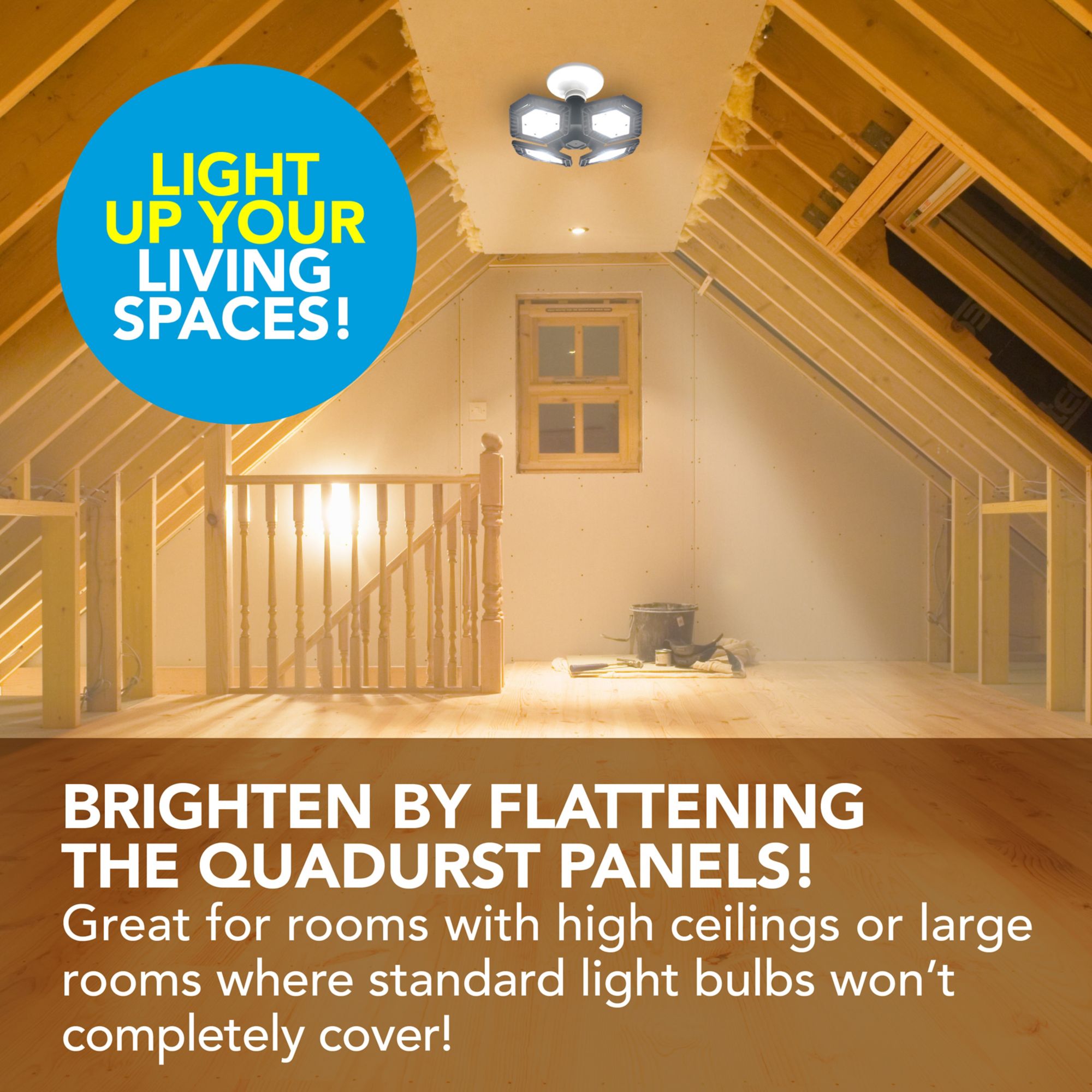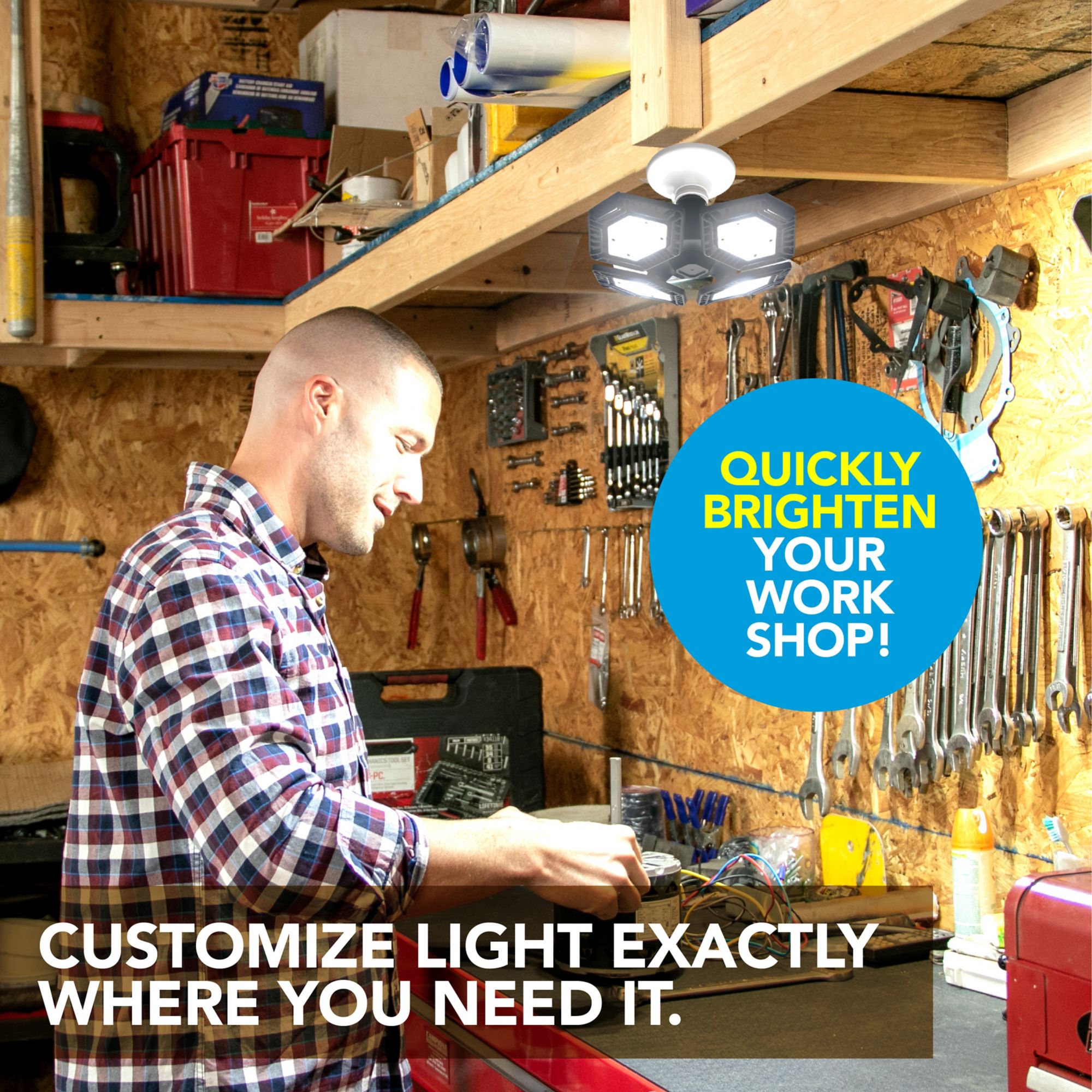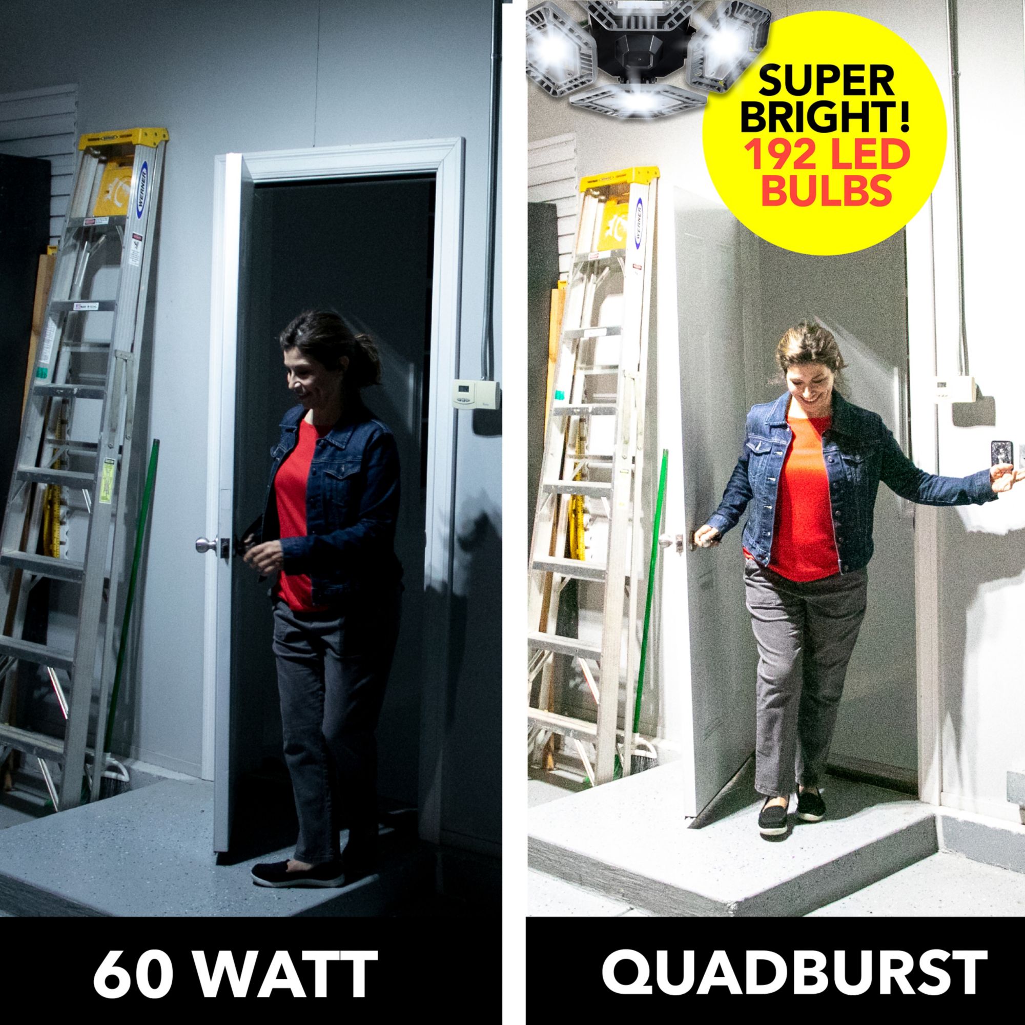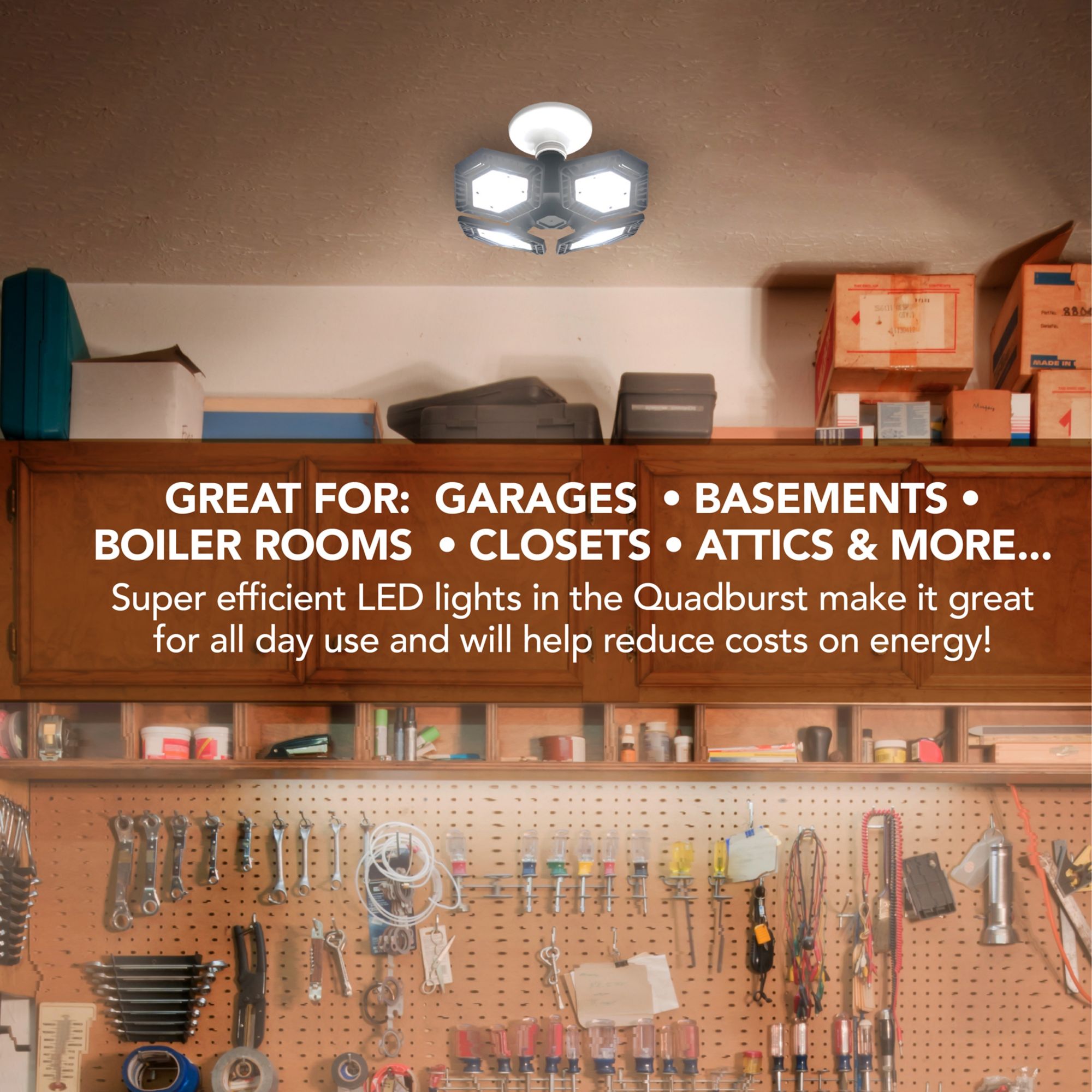 What better way to light up attics, basements, garages, and so much more than with Quad Burst by Bell + Howell. Quad Burst is the newest innovation in adjustable garage lights. Replace your typical, everyday light bulb to shower your space with light. Quad Burst is 5x brighter than the standard 60W bulb. It features four multi-directional hinged panels that are fully adjustable, giving the user 360 degrees of illumination. The hinged panels give you the power to direct the light where you need it most. Made with four LED light panels and a total of 192 high-intensity LED bulbs. It's super easy to use, with no assembly required. Quad Burst can quickly and easily be screwed into any standard E26 / E27 light socket base. With a whopping 5500 Lumens and 6500 Kelvin bright white light, you will never be left in the dark with Quad Burst.