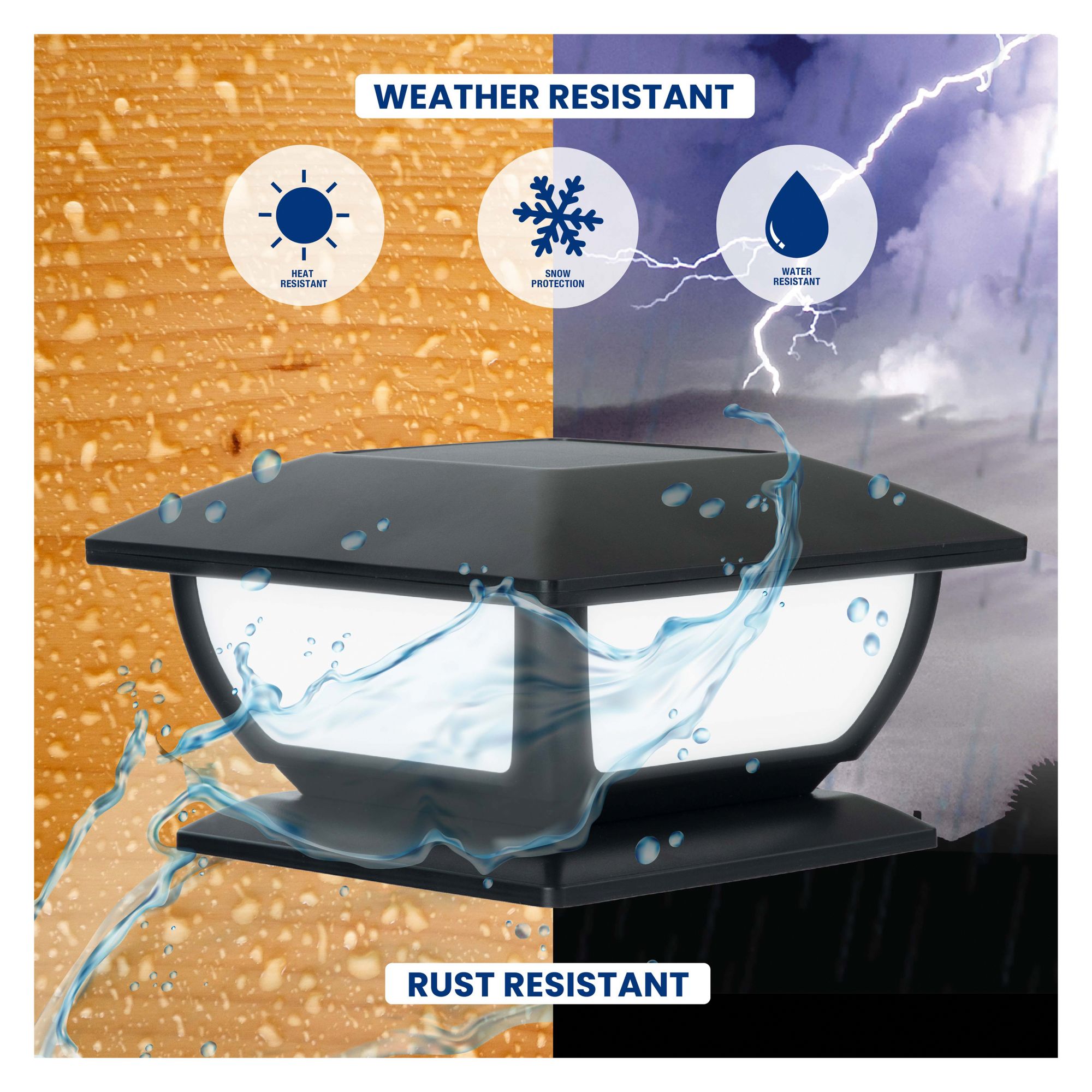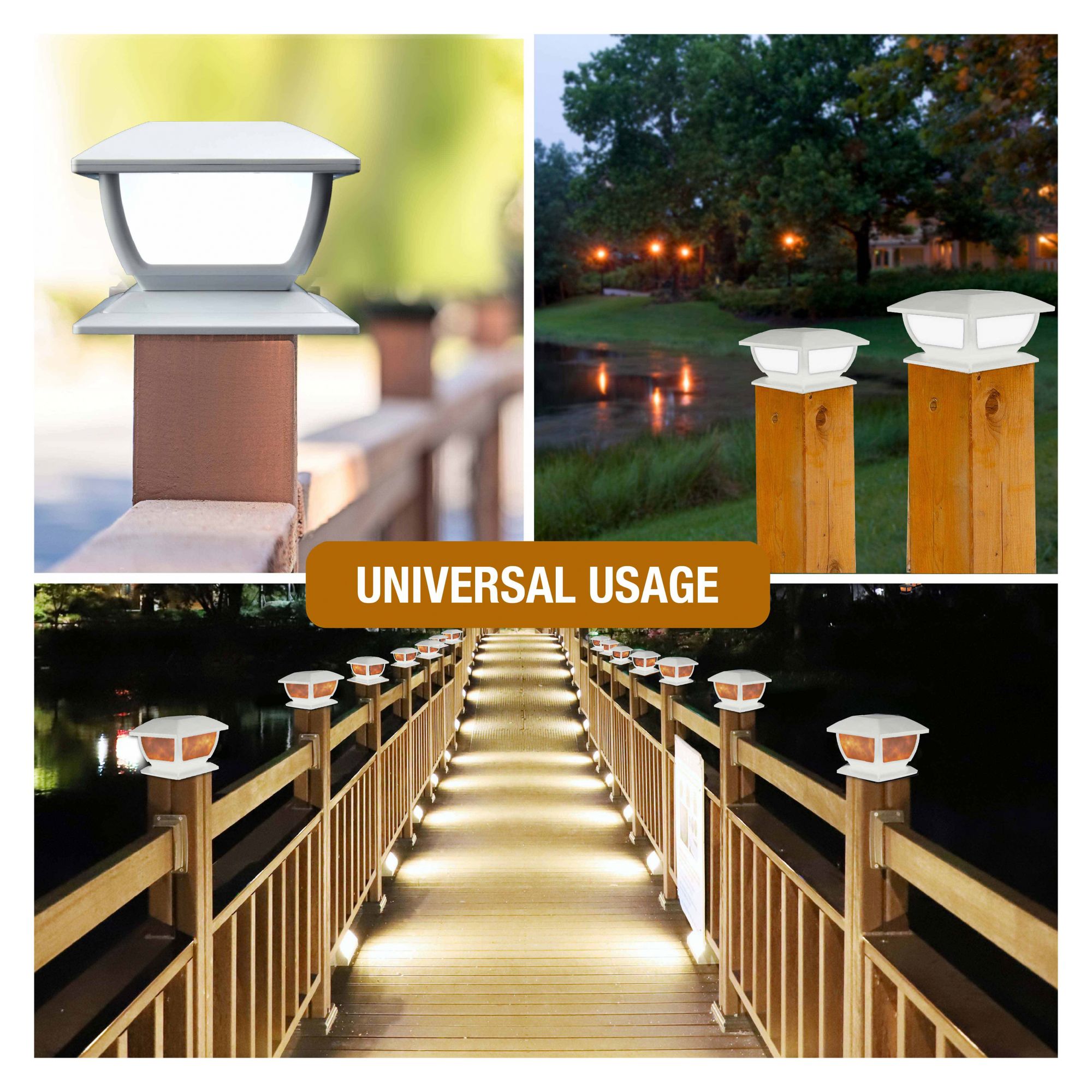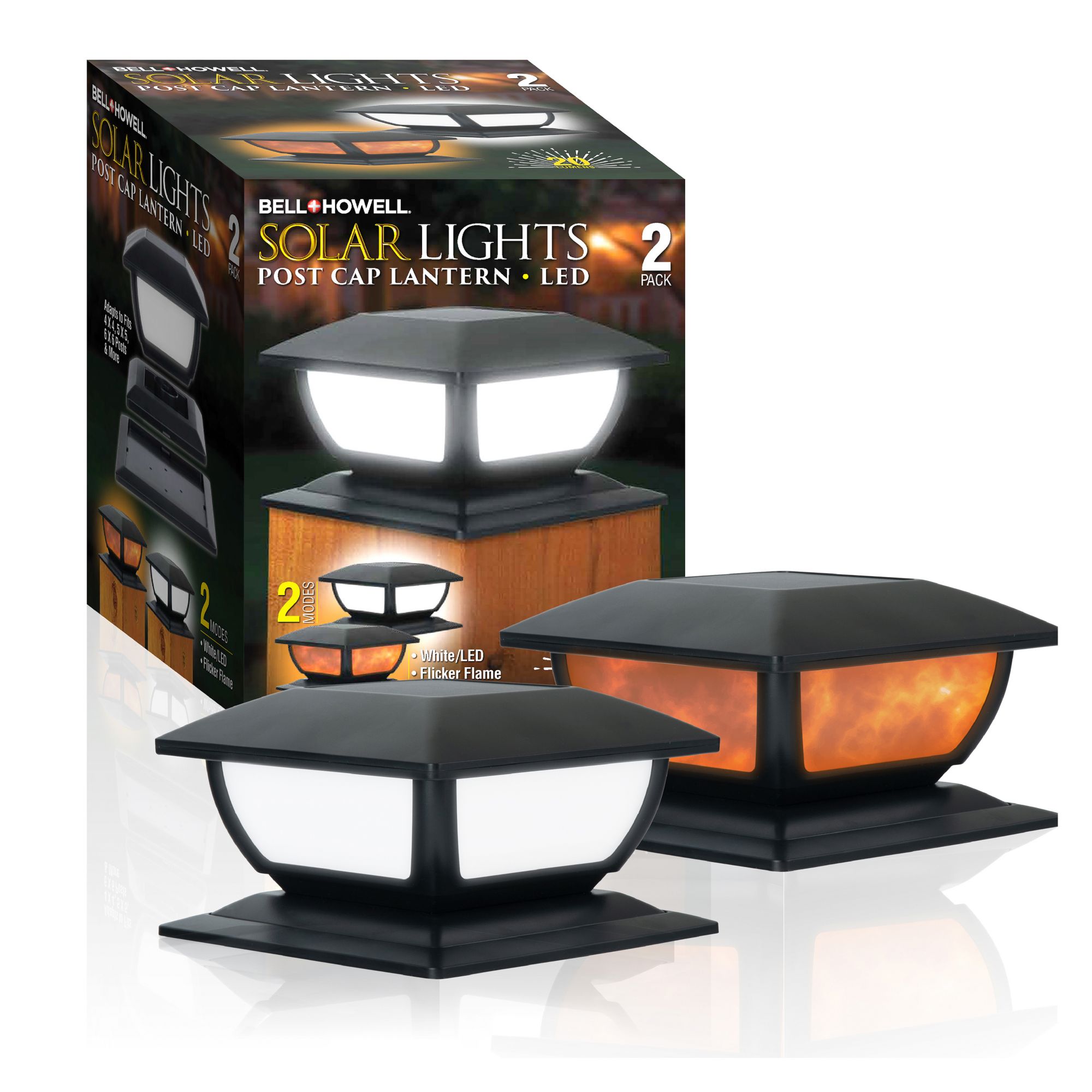 Transform your fence, deck, patio and more with these beautiful post-cap lanterns. This set of two lights are adjustable and can fit post up to 6.15" by 6.15". Post Cap Lights are solar powered which means no messy wires are necessary. Simply set the lights where they can soak up the sun and the dusk-to-dawn sensor ensures they instantly illuminate at night. Choose from two modes: flickering flame or white, solid light. Change modes using the switch at the base of each light. Post Cap Lights use LED technology with a lifespan of 50,000 hours. IP65 rated, these lights are designed to use all weather and all year round. Easy to set up and install on post caps from 4" to 6.15". Use as a tabletop ambient light or as a pathway light using the in-ground stakes included. Set the ambiance with Post Cap Lights by Bell + Howell.