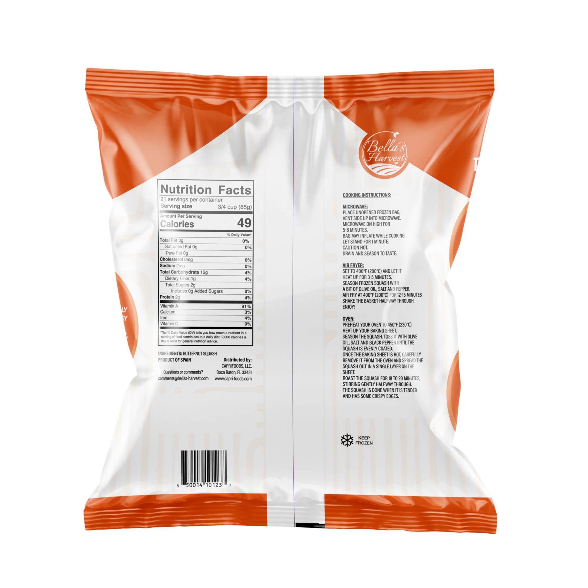 Bella's Harvest Diced Butternut Squash are carefully ripened, carefully selected and diced which makes it easy for meal prep. Bella's Harvest Diced Butternut Squash is ideal for stews, casseroles, and more. They offer a convenient and nutritious side dish to your meals. Bella's Harvest Diced Butternut Squash is gluten free and vegan. Bella's Harvest Diced Butternut Squash is easy to prepare. You can prepare it In an air fryer, microwave or roast it in an oven. Bella's Harvest Diced Butternut Squash is grown in Spain is very healthy and has no sugar added, is fat free and cholesterol free.