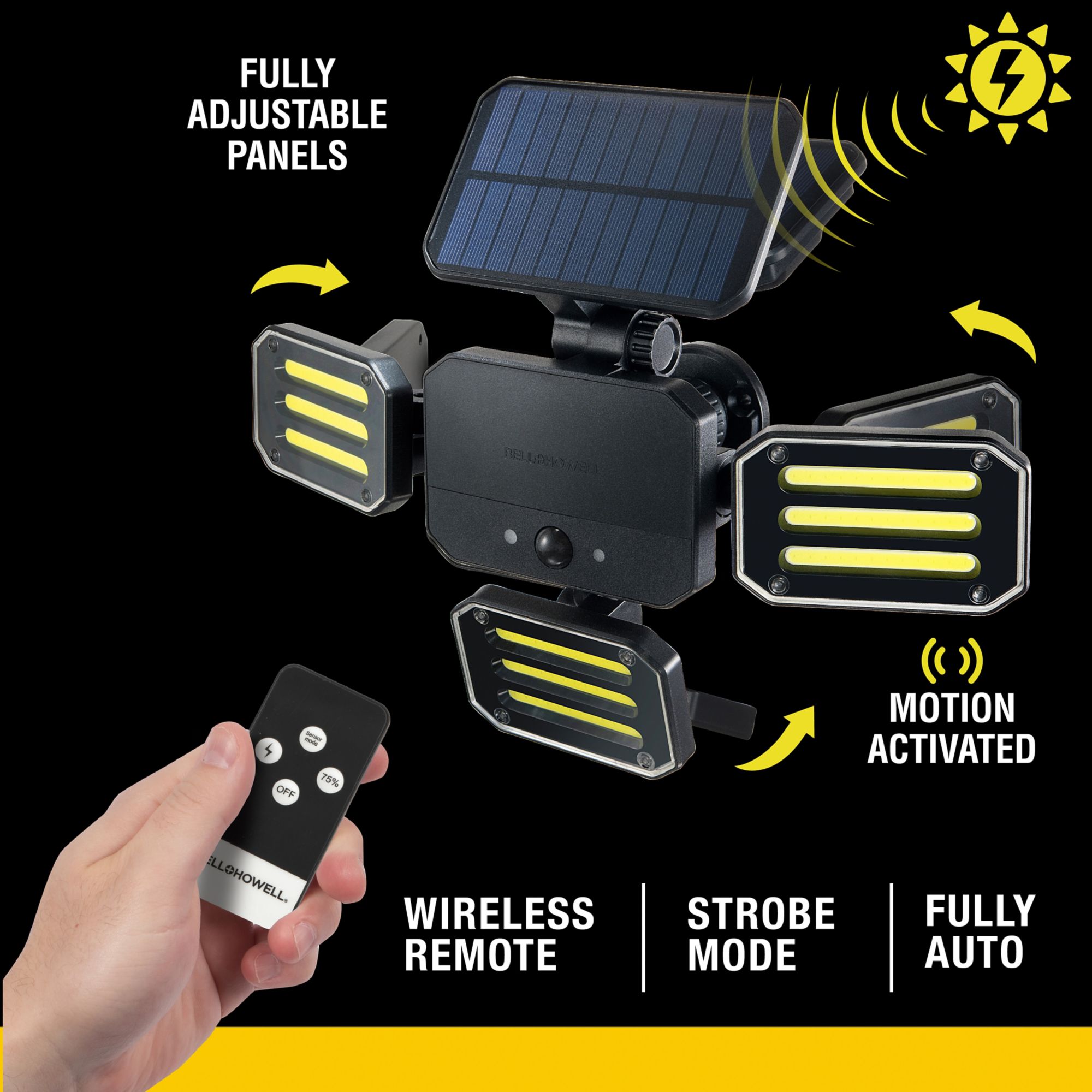 Bionic Floodlight by Bell + Howell is the solar-powered motion-activated, multi-directional floodlight. It absorbs the sun all day by using the onboard solar panel so that at night it will shower a span of light. No wiring or difficult installation is needed. Easy to mount with hardware or use bonus stake to place in-ground. Each panel is adjustable so you get light where you need it most. Easy to operate with the wireless remote control. The remote control allows you to turn the motion sensor function on and off, turn on strobe mode or turn down the brightness.