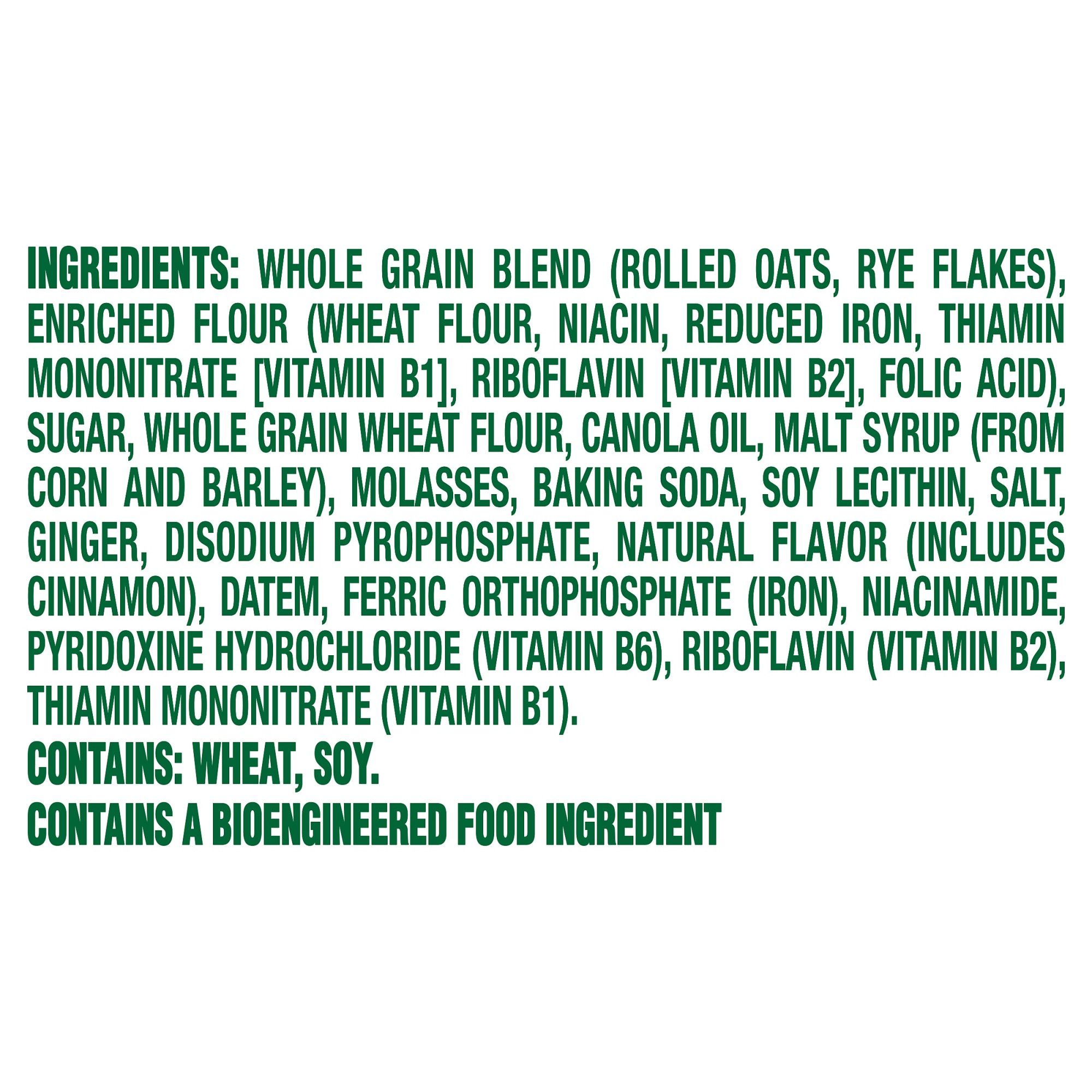 Ingredients: Whole Grain Blend (Rolled Oats, Rye Flakes), Enriched Flour (Wheat Flour, Niacin, Reduced Iron, Thiamin Mononitrate [Vitamin B1], Riboflavin [Vitamin B2], Folic Acid), Sugar, Whole Grain Wheat Flour, Canola Oil, Malt Syrup (From Corn And Barley), Molasses, Baking Soda, Soy Lecithin, Salt, Ginger, Disodium Pyrophosphate, Natural Flavor (Includes Cinnamon), Datem, Ferric Orthophosphate (Iron), Niacinamide, Pyridoxine Hydrochloride (Vitamin B6), Riboflavin (Vitamin B2), Thiamin Mononitrate (Vitamin B1). Contains: Wheat, Soy.
