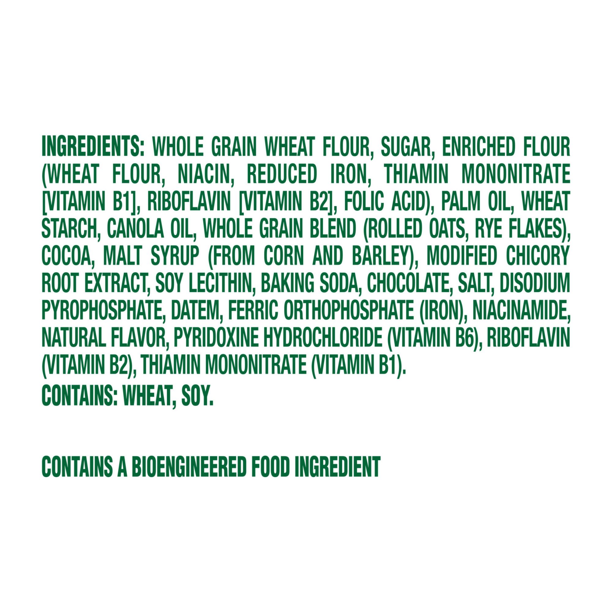 Ingredients: Whole Grain Wheat Flour, Sugar, Enriched Flour (Wheat Flour, Niacin, Reduced Iron, Thiamin Mononitrate [Vitamin B1], Riboflavin [Vitamin B2], Folic Acid), Palm Oil, Cornstarch, Canola Oil, Whole Grain Blend (Rolled Oats, Rye Flakes), Cocoa, Malt Syrup (From Corn And Barley), Modified Chicory Root Extract, Soy Lecithin, Baking Soda, Chocolate, Salt, Disodium Pyrophosphate, Datem, Ferric Orthophosphate (Iron), Niacinamide, Natural Flavor, Pyridoxine Hydrochloride (Vitamin B6), Riboflavin (Vitamin B2), Thiamin Mononitrate (Vitamin B1).contains: Wheat, Soy.
