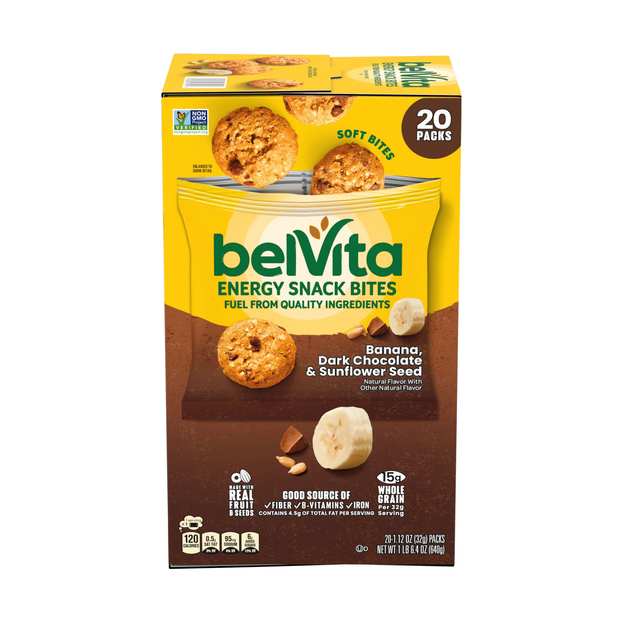 BelVita Energy Snack Bites, Banana, Dark Chocolate and Sunflower Seed are a delicious mid-morning snack to help fuel your day ahead. Made with real fruit, seeds, and dark chocolate bits, these soft, tasty snack bites have a delightful, fulfilling flavor combination and texture. Each snack pack contains 15 grams of whole grains and 4.5 grams of total fat, and it’s a good source of fiber, iron, and B vitamins. Made from wholesome grains and other quality ingredients, these delicious energy snack bites contain no high fructose corn syrup and no artificial flavors, colors, or sweeteners. They’re also kosher and Non-GMO Project Verified, making them a great alternative to traditional breakfast snacks and breakfast bars. This 20-pack box contains 1.12 oz. individually wrapped snack packs that are great for enjoying at home, at work, or on the go. Experience the fuel from quality ingredients with tasty, satisfying energy snack bites wherever you need a boost.