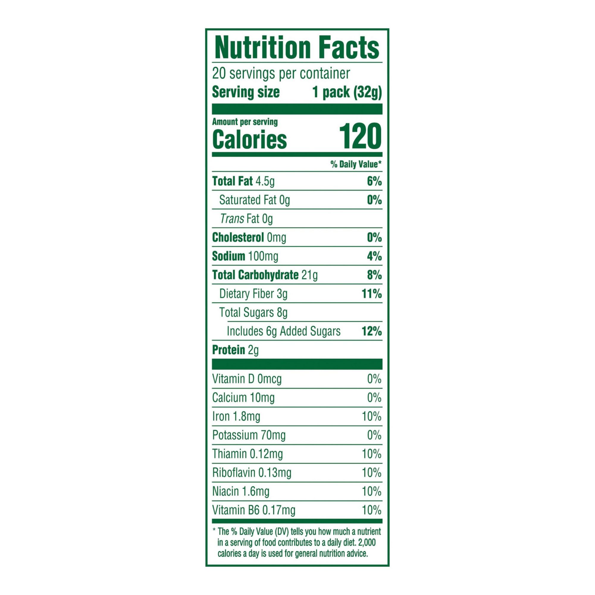Each after-breakfast snack pack contains 14 grams of whole grains per serving and is a good source of fiber, iron, and B vitamins