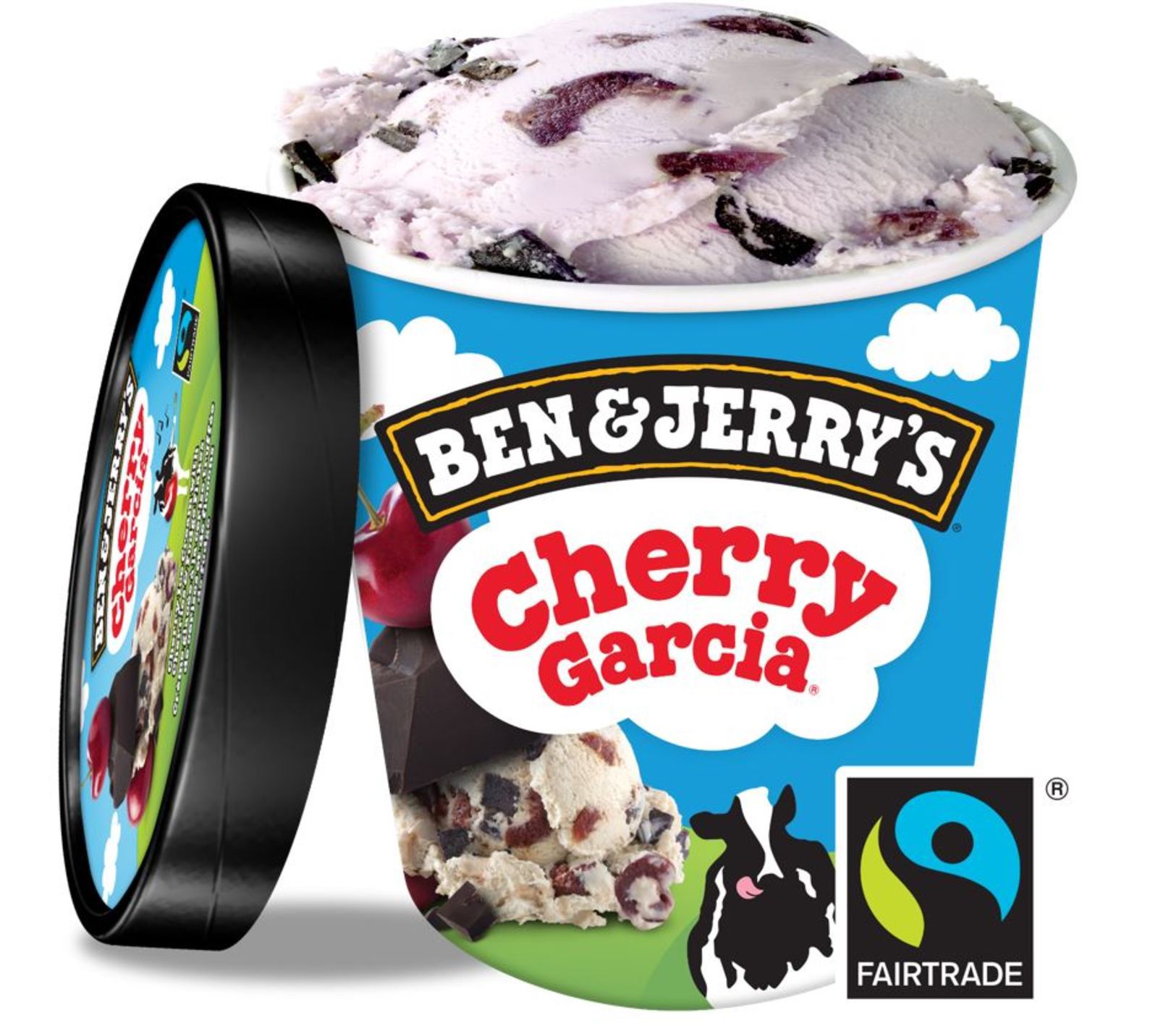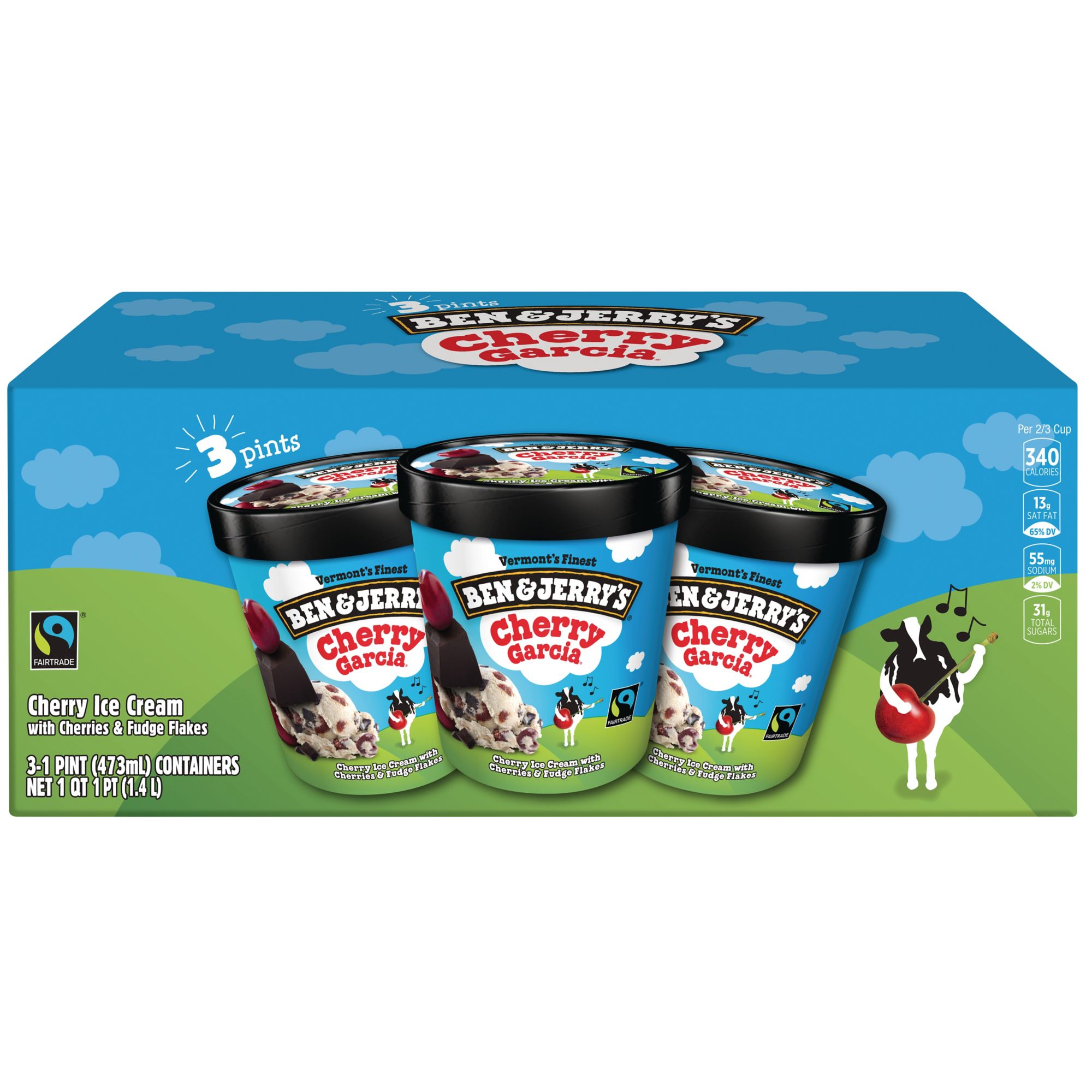 Ben & Jerry's Cherry Garcia ice cream pint Cherry ice cream with cherries and fudge flakes All of Ben & Jerry’s ice cream is made with non GMO sourced ingredients and cage-free eggs Cherry Garcia ice cream includes Fairtrade certified cocoa and sugar Kosher certified dairy Ben & Jerry’s uses responsibly sourced packaging Includes (3) 16 oz. pints of Ben & Jerry's Garcia Ice Cream
