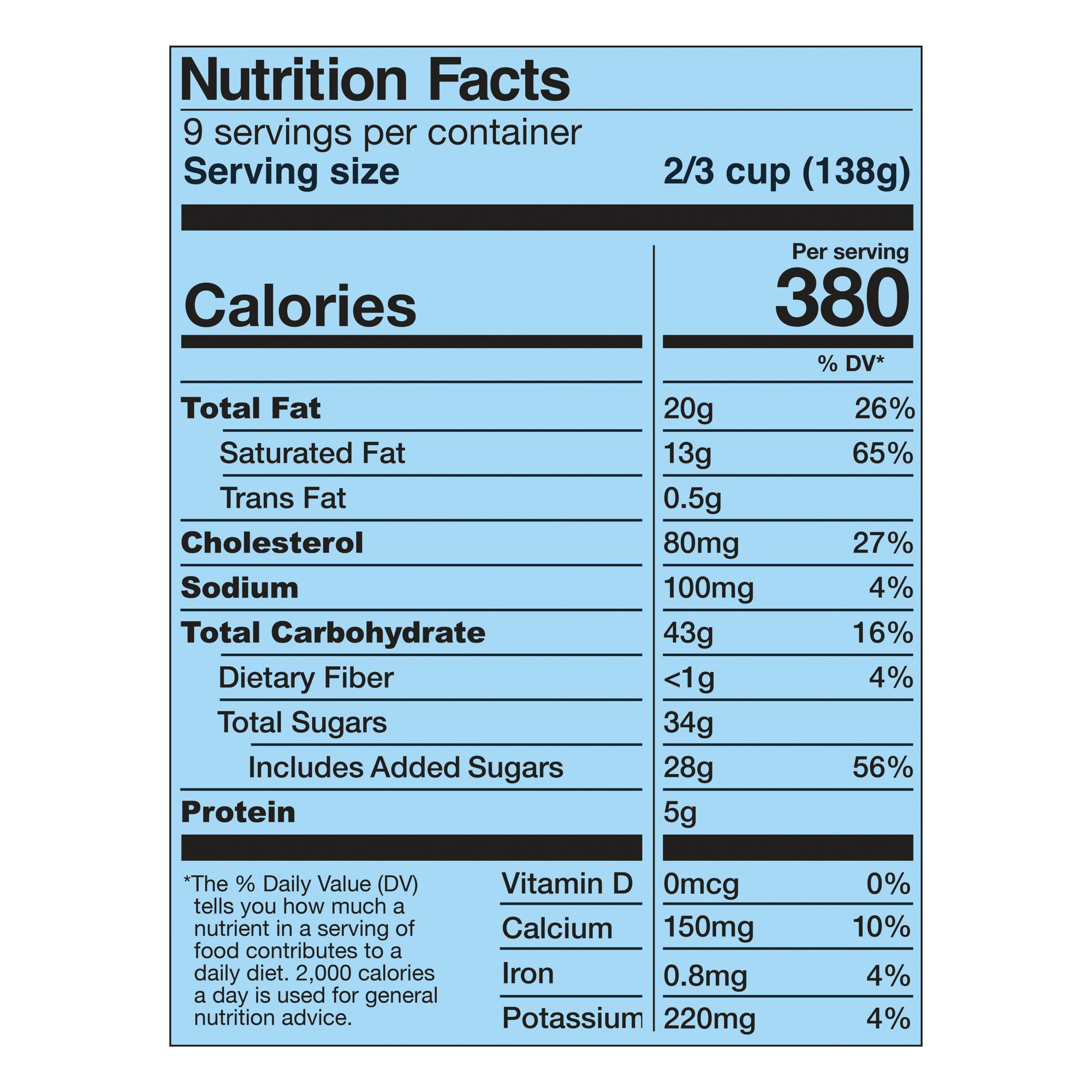 Active Ingredients: Cream, Skim Milk, Liquid Sugar (Sugar, Water), Water, Wheat Flour, Sugar, Brown Sugar, Egg Yolks, Butter (Cream, Salt), Expeller Pressed Soybean Oil, Eggs, Coconut Oil, Chocolate Liquor, Cocoa (Processed With Alkali) Cocoa, Molasses, Guar Gum, Salt, Vanilla Extract, Natural Flavor, Cocoa Butter, Invert Sugar, Carrageenan, Milk Fat, Tapioca Flour, Soy Lecithin, Annatto Extract (For Color), Turmeric Extract (For Color), Milk. Contains Eggs, Milk, Soy And Wheat.