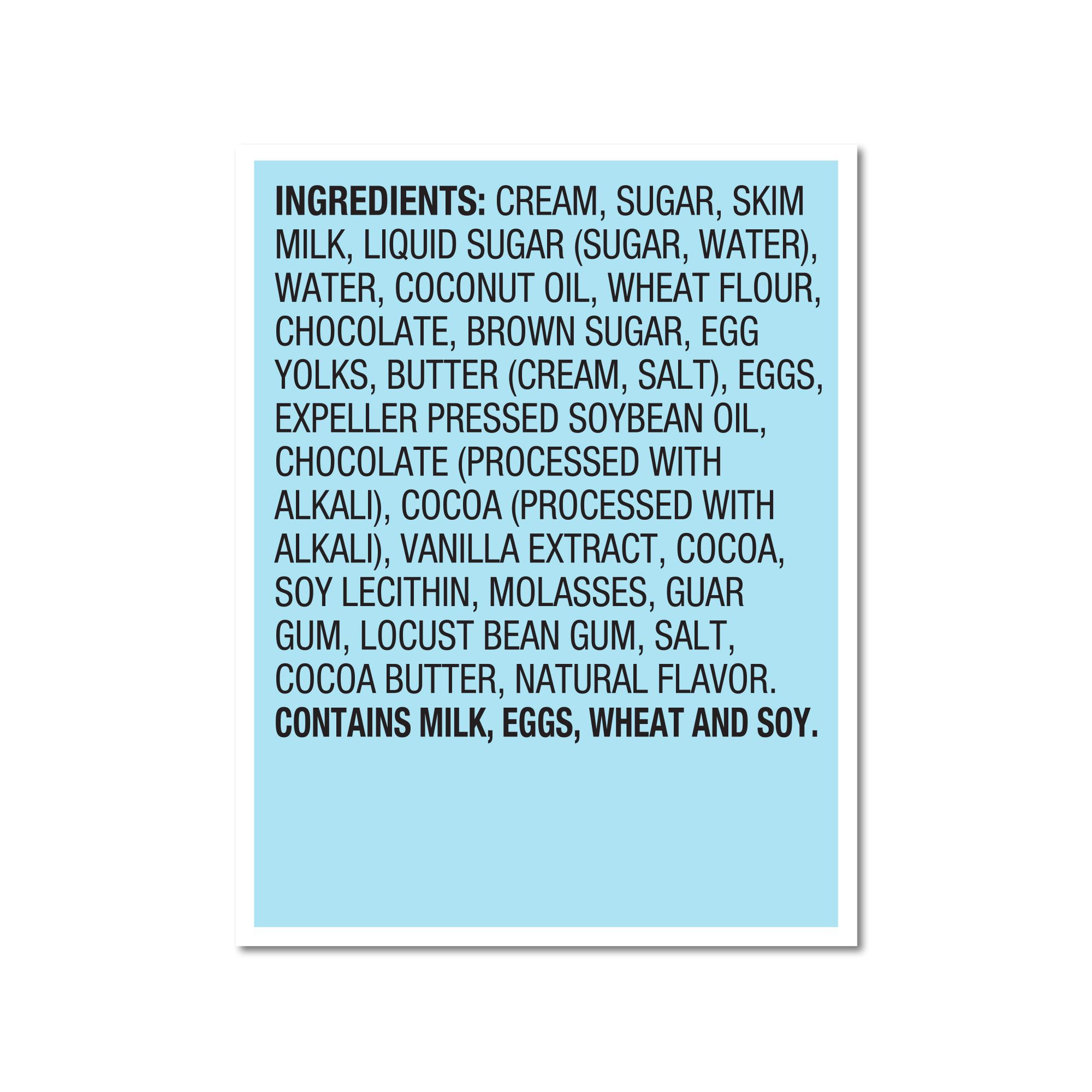 Ingredients:Cream, Sugar, Skim Milk, Liquid Sugar (Sugar,Water),Water, Coconut Oil, Wheat Flour, Chocolate, Brown Sugar, Egg Yolks, Butter(Cream, Salt), Eggs, Exeller Pressed Soybean Oil, Chocolate(Processed With Alkali), Cocoa (Processed With Alkali), Vanilla Extract, Cocoa Soy Lethicin, Molasses, Guar Gum, Locust Bean Gum, Salt, Cocoa Butter, Natural Flavor, Contains Milk, Eggs, Wheat And Soy.