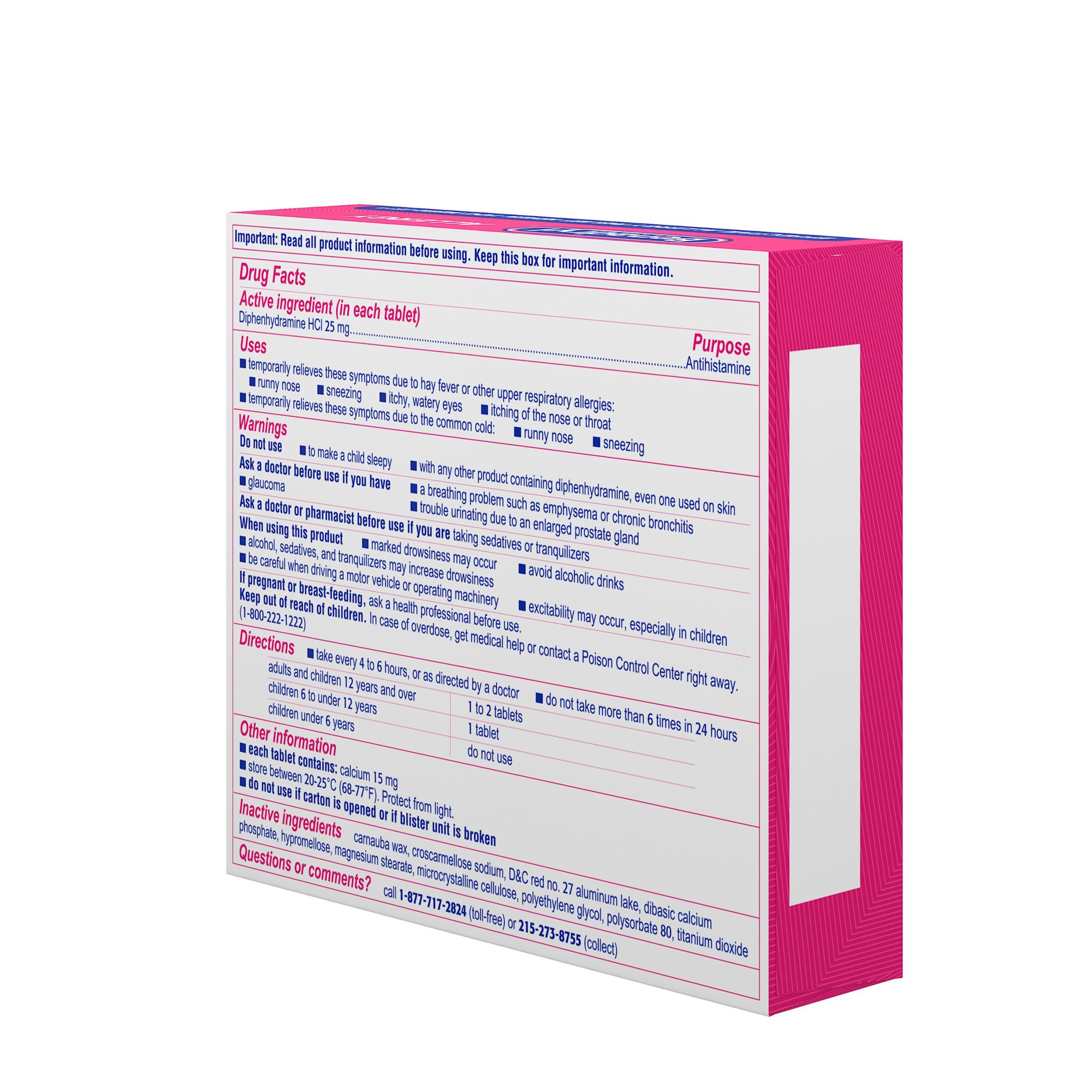 Each tablet contains 25mg diphenhydramine HCI antihistamine Provides allergy relief for symptoms: sneezing, runny nose, itchy nose or throat, and itchy, watery eyes Provides cold relief for symptoms: sneezing and runny nose For ages 6+ Includes 3 pk./48 ct.