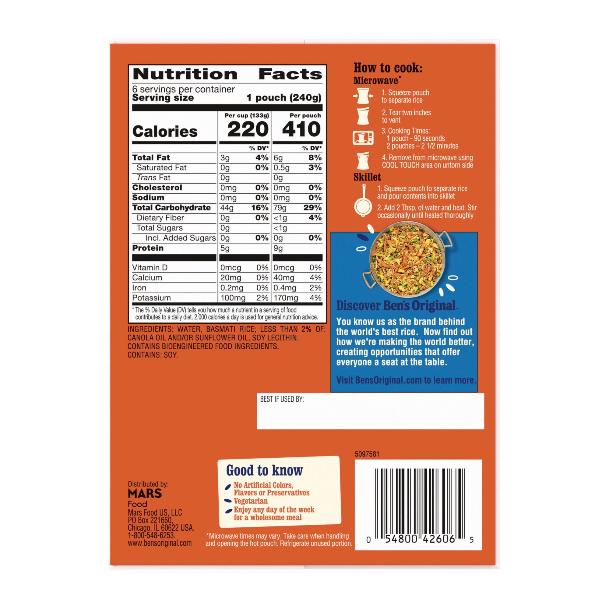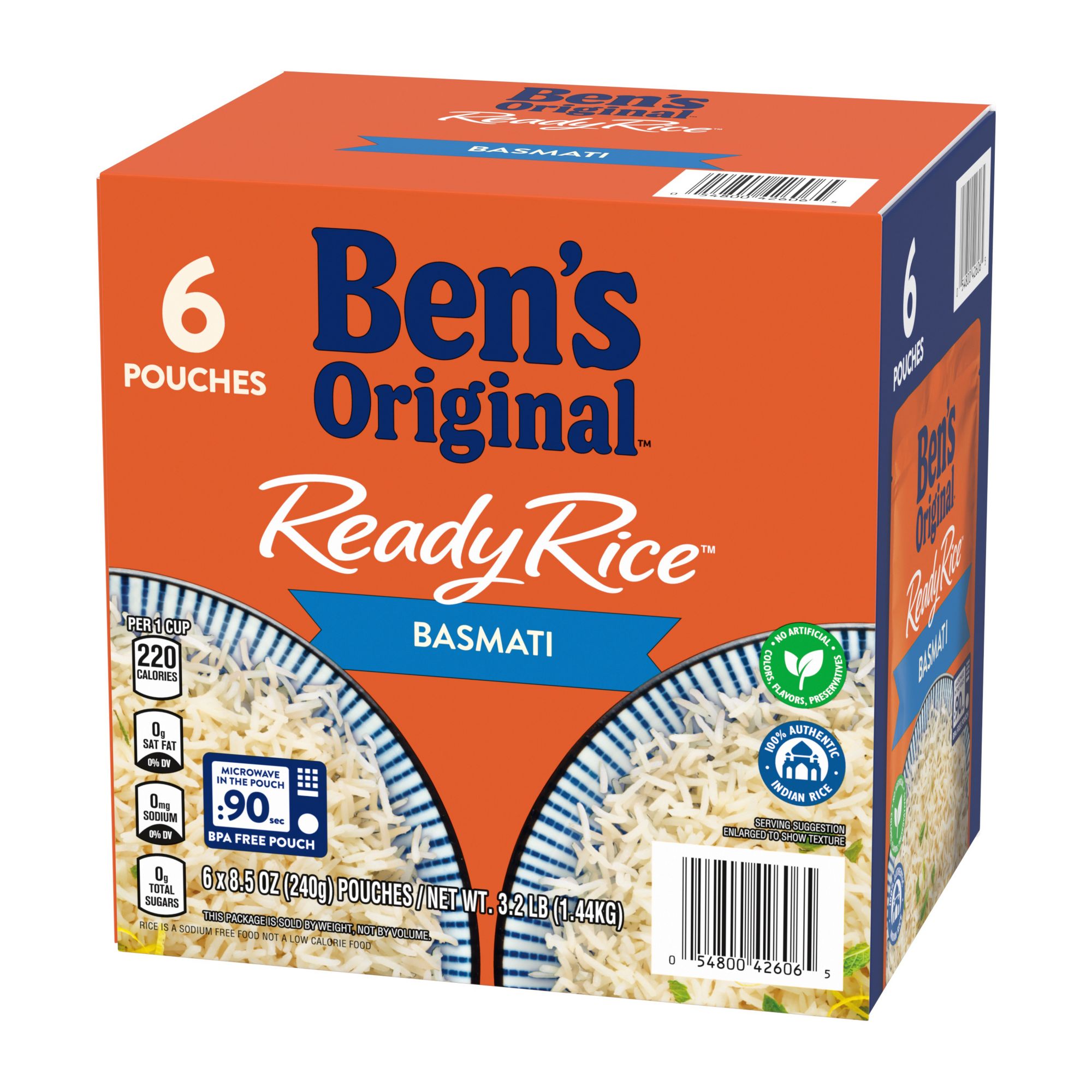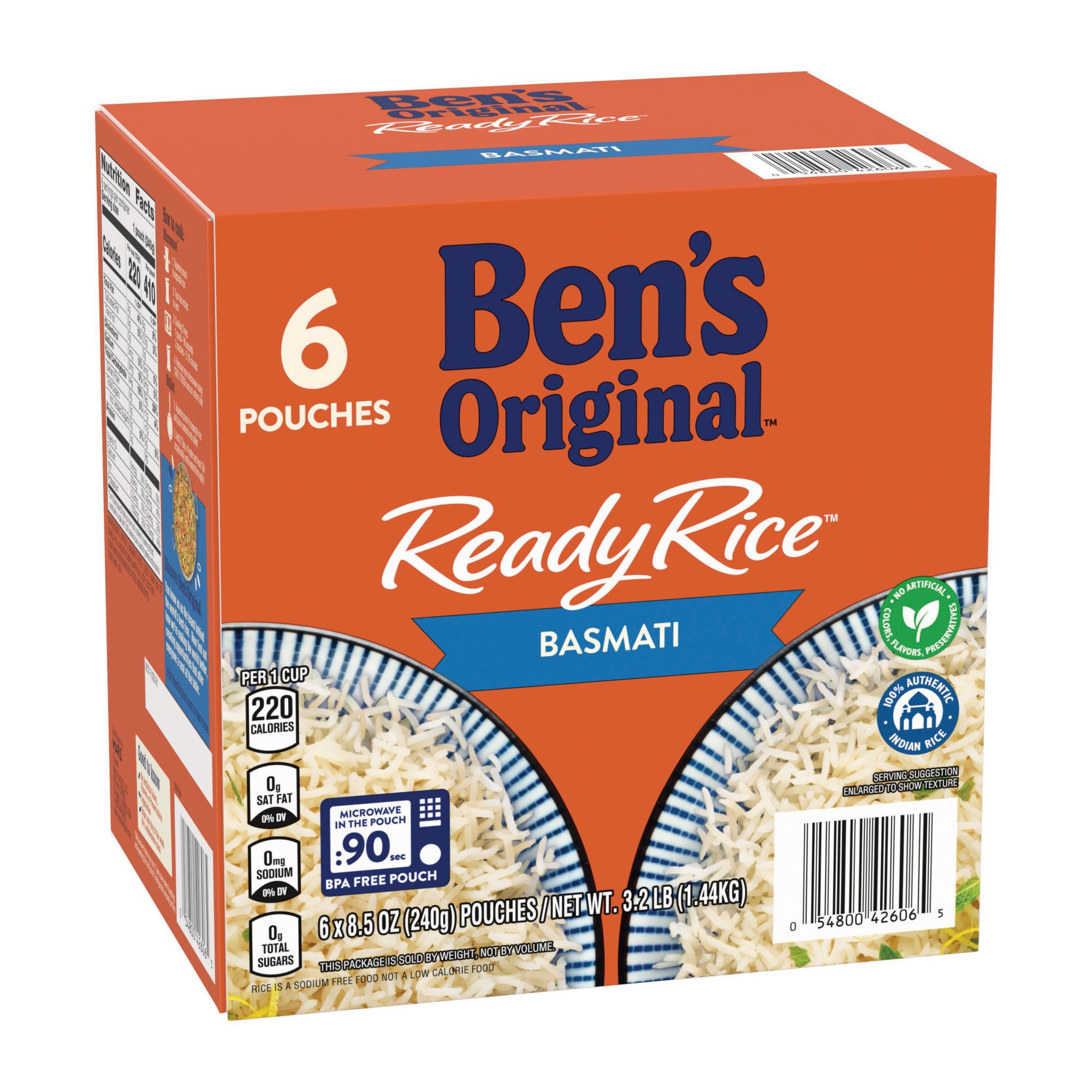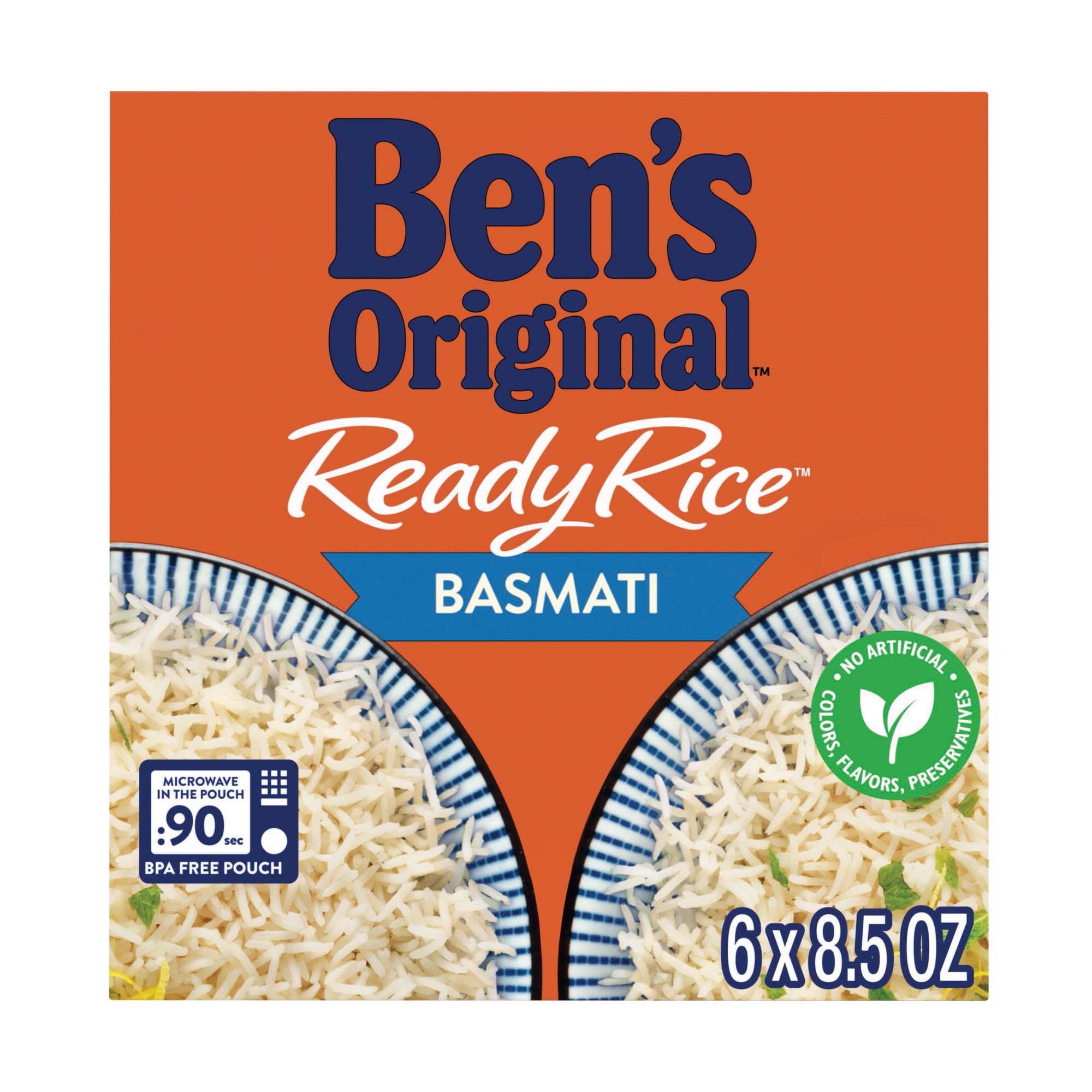 Ben's Original Ready Rice Basmati Rice makes it easier than ever to create a tasty, globally inspired cooked rice meal. This authentic Indian rice 6-pack comes fully cooked for your convenience, featuring long grains and a fine texture reminiscent of classic aromatic rice with a deliciously subtle, nutty flavor. Ben's Original Ready Rice comes in a BPA-free microwavable rice pouch for easy cooking without requiring any prep or cleanup. Cook this rice in the microwave for 90 seconds or pour it into a skillet and heat it thoroughly. Perfect as a flavorful rice side dish or part of a main course meal for multiple people, pair this basmati rice with your favorite curries, braised or roasted meats, or serve it plain. This Indian rice is vegetarian, very low in sodium, contains no artificial flavors, no artificial colors, no preservatives, trans fat, or cholesterol and is low in saturated fat. Ben's Original is dedicated to creating meals and experiences that offer everyone a seat at the table.