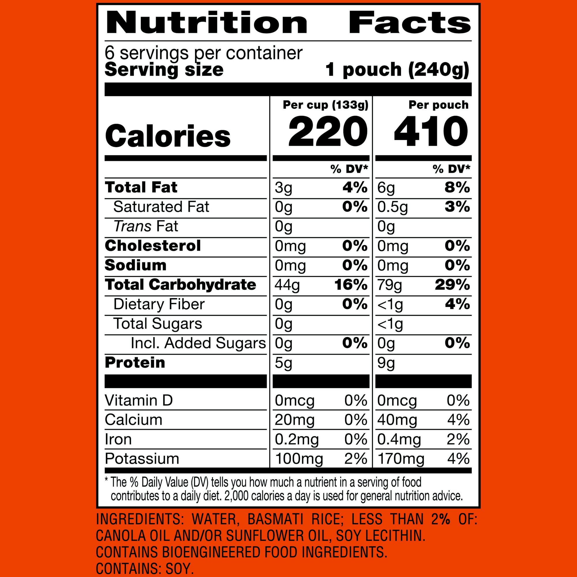 Ingredients: Water, Basmati Rice; Less Than 2% Of: Canola Oil And/or Sunflower Oil, Soy Lecithin.
