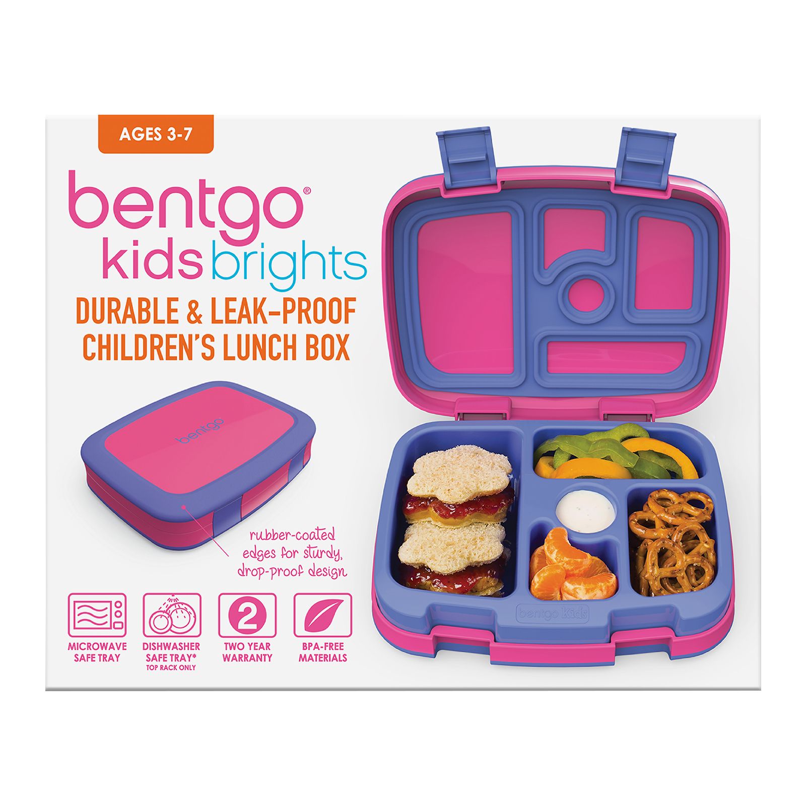 Bentgo Kids Brights is an innovative bento-style kids lunch box designed for children on the go. With a compartment for fruit, veggies, dip, an entrée, and dessert, this leak-proof kids lunch box organically inspires parents to pack a more wholesome, balanced lunch for their children. Although the Bentgo Kids lunch box is recommended for children ages 3-7, it can be used by teens and adults looking to pack a portion-controlled lunch.