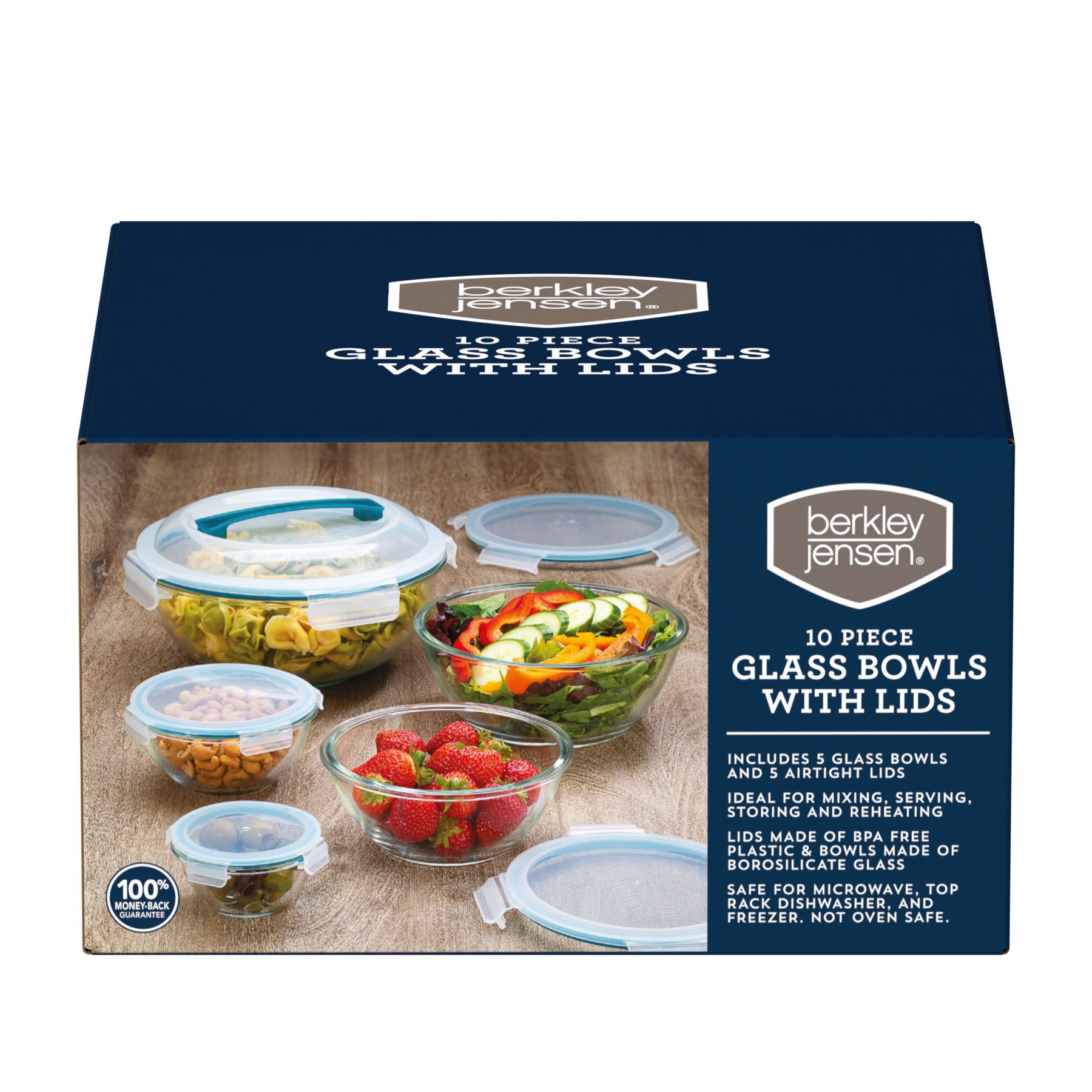 The Berkley Jensen 10-Pc. Glass Mixing Bowl set includes five glass blows and five airtight lids. These mixing bowls can be used for mixing, serving, storing, and reheating food. Made from borosilicate glass, these non-porous glass mixing bowls won't absorb food, odors, flavors, or stains. They're also top rack dishwasher safe, freezer safe, microwave safe, and BPA-free. A sealed silicone ring makes these bowls leak-proof.