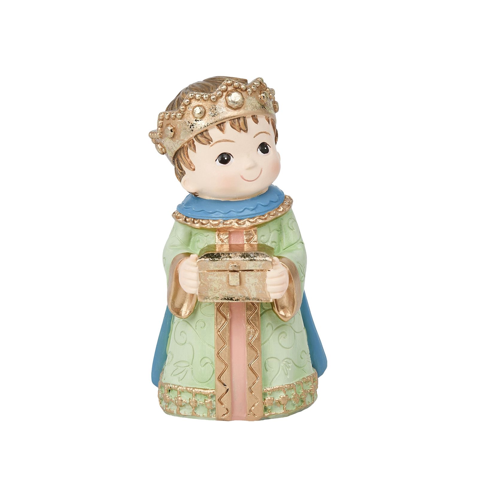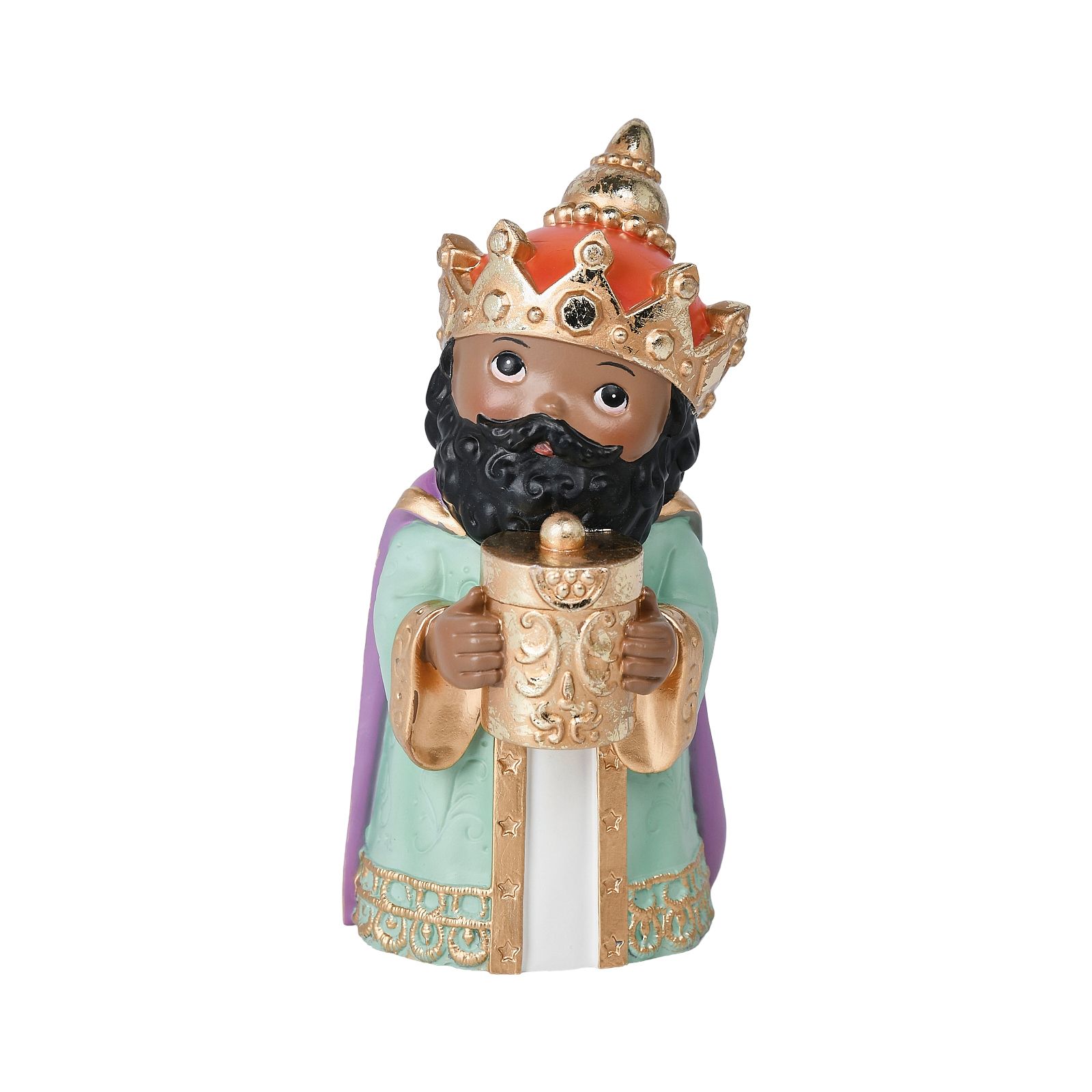 This resin Nativity set captures the essence of the Christmas story with a charming miniature design. Each figure, approximately 4" tall, is meticulously crafted and adorned with gold foil, adding a touch of elegance and reverence to the scene. The creche, measuring around 8", features a quaint castle with a starry night sky, creating a serene and inviting atmosphere. The figures, including Mary, Joseph, Baby Jesus, angel, the three wise men, and the adorable lamb and donkey, are all depicted in a gentle, lifelike manner. This set is not only a beautiful decoration but also a heartfelt reminder of the true meaning of Christmas, making it a cherished addition to any holiday collection.