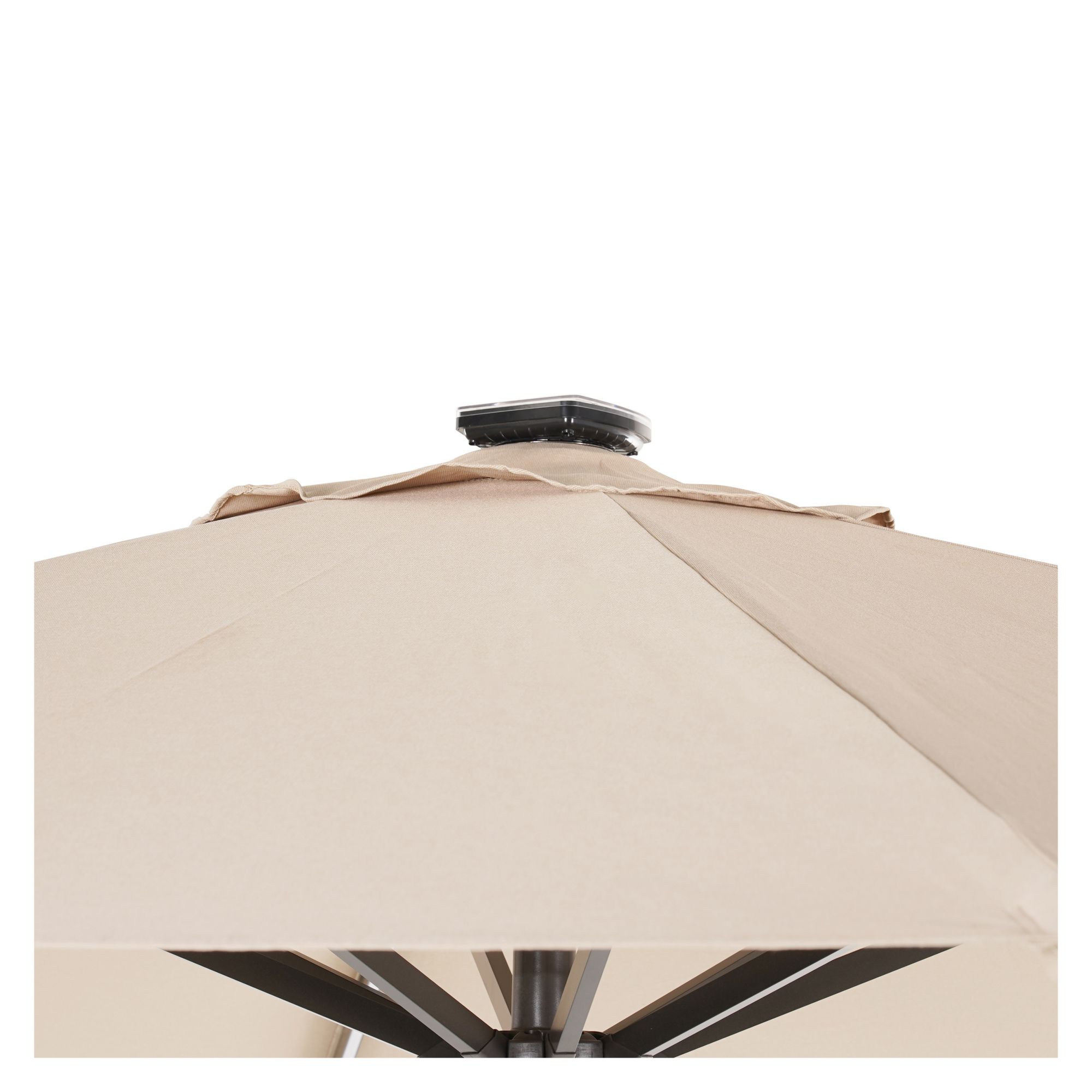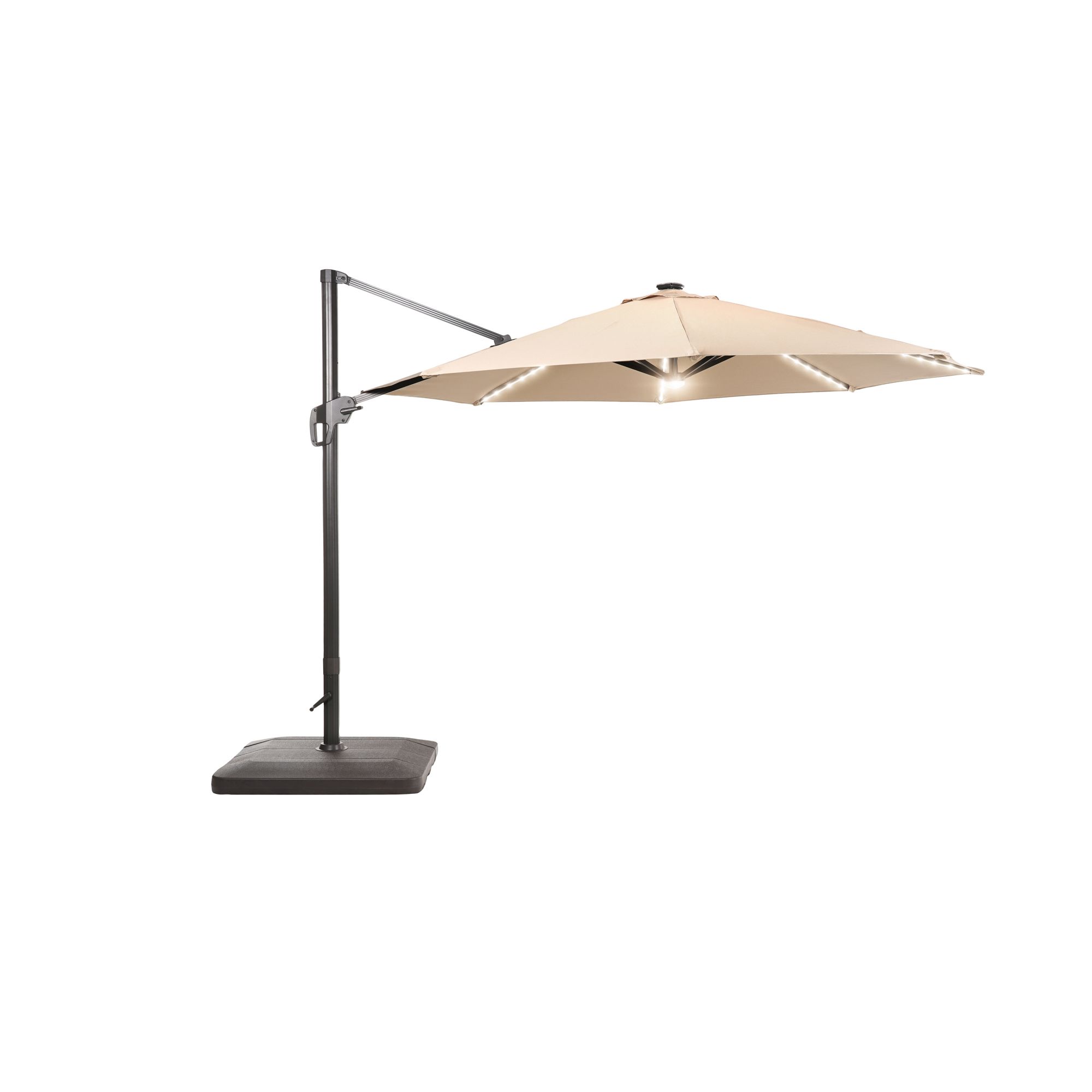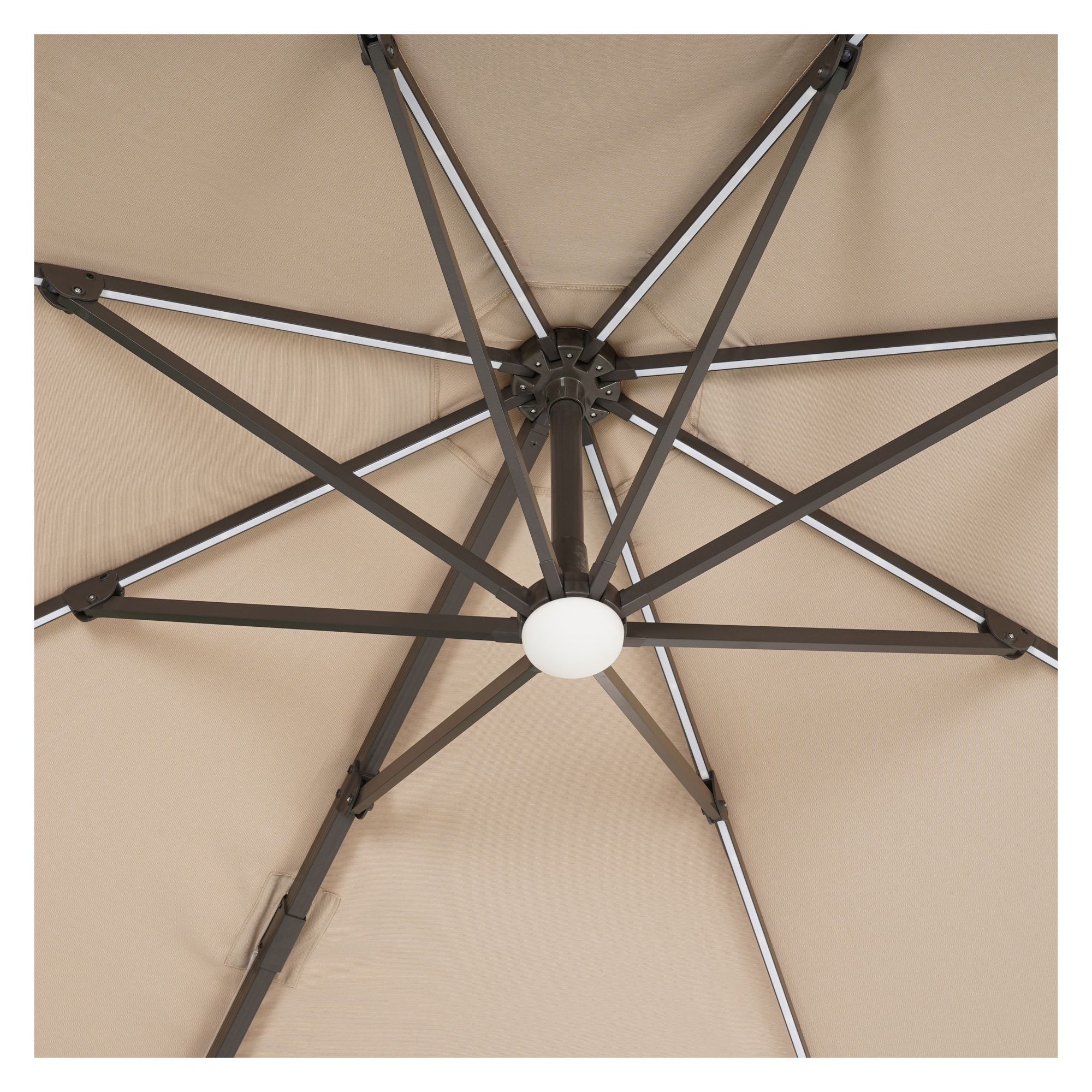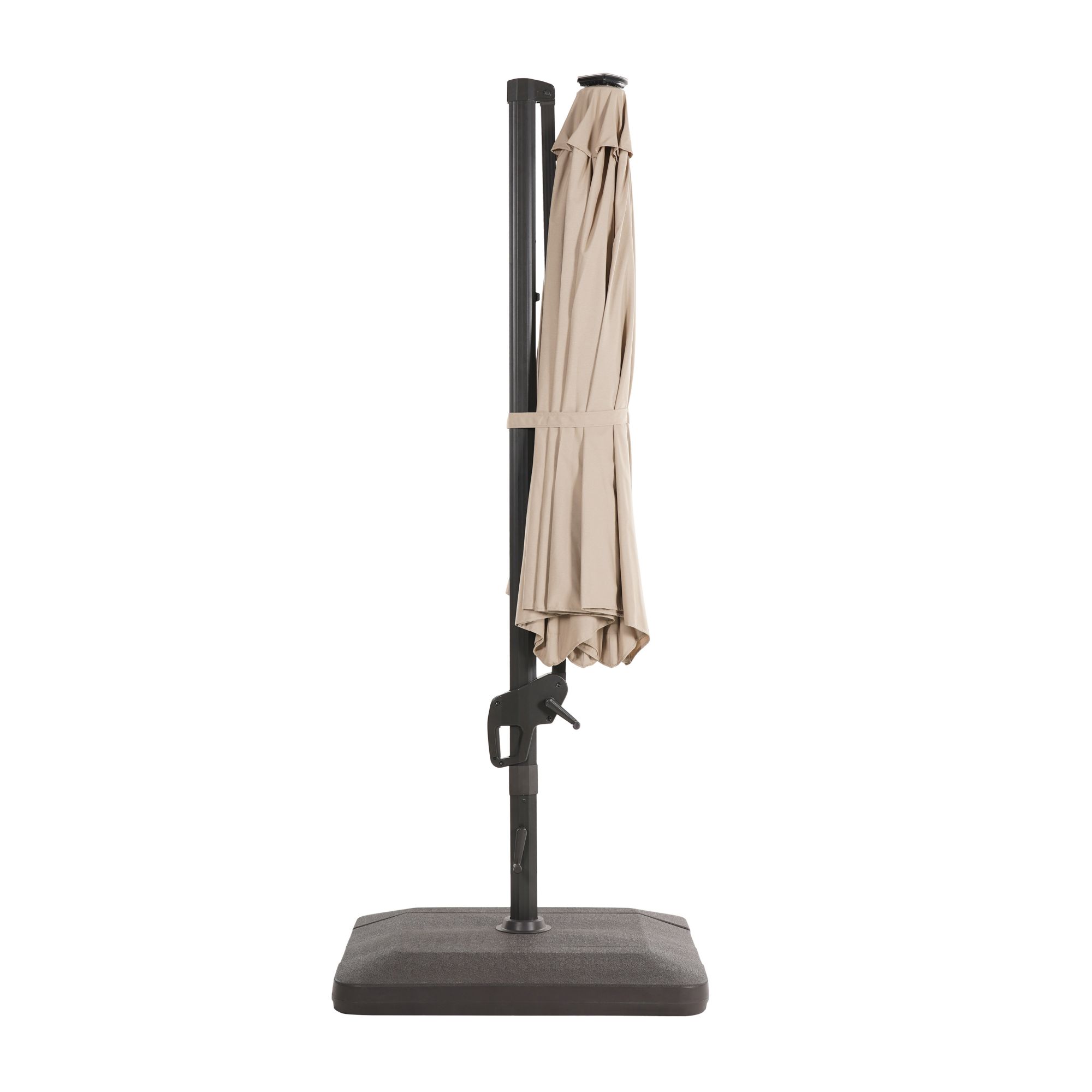 Exclusively at BJ's All weather spun polyester fabric resists fading, mildew and stains Canopy color fastness to ensure no fading within two years Rust-resistant aluminum frame with stainless fittings Heavy duty 3" x 2.2" square aluminum pole Wind resistant aluminum ribs with tube LED lights and middle light Deluxe full crank mechanism All-direction rotational mechanism 200 lb. water fillable base for complete stability Deluxe solar panel with rechargeable Nimh batteries Includes umbrella, base pole with rotation, plastic cover, screw set, base