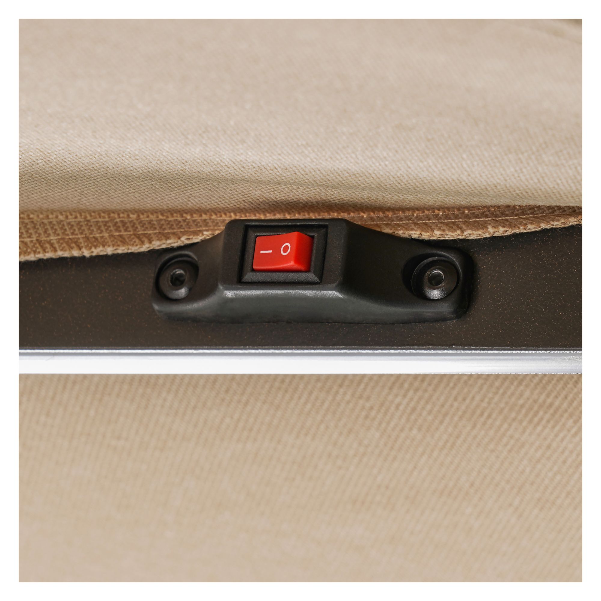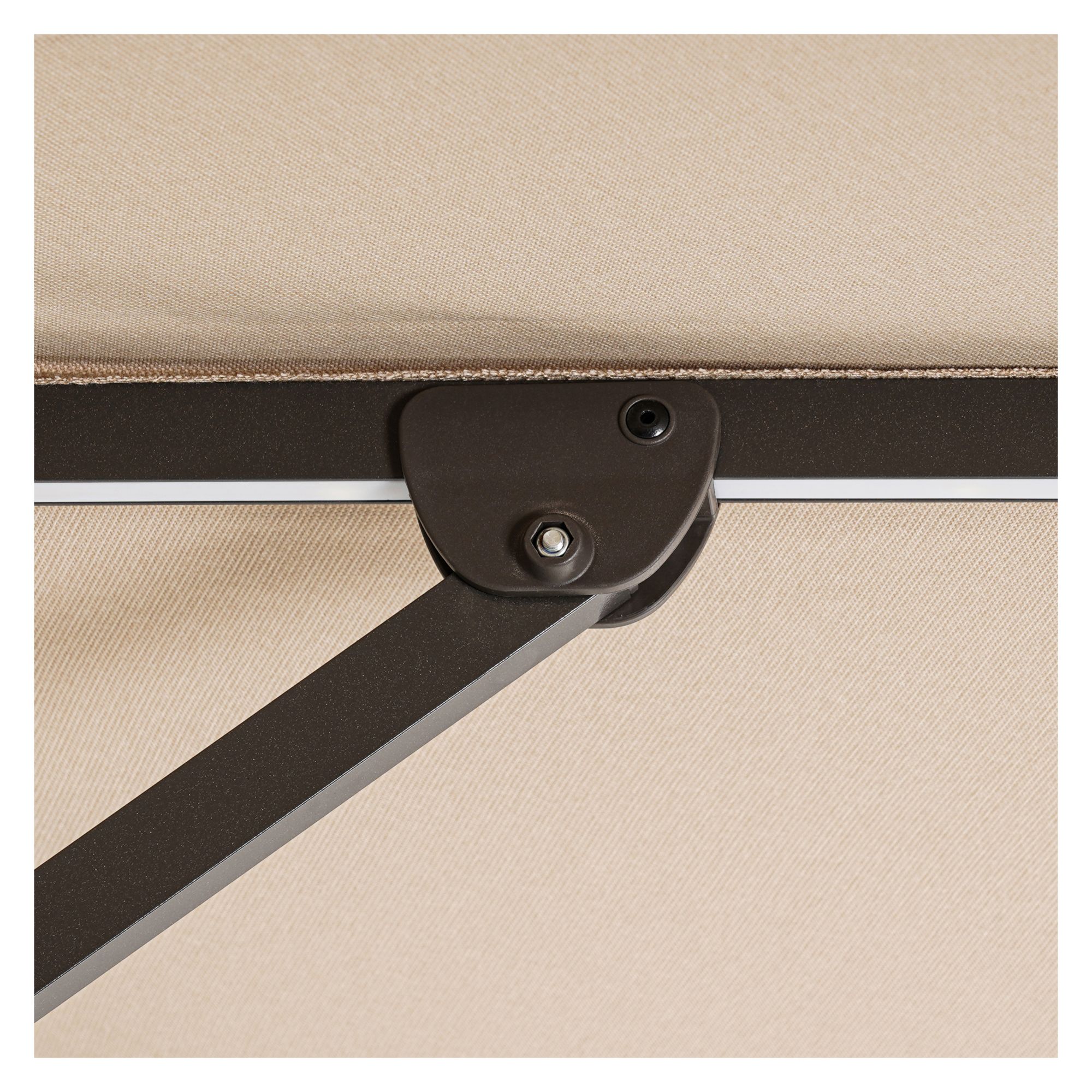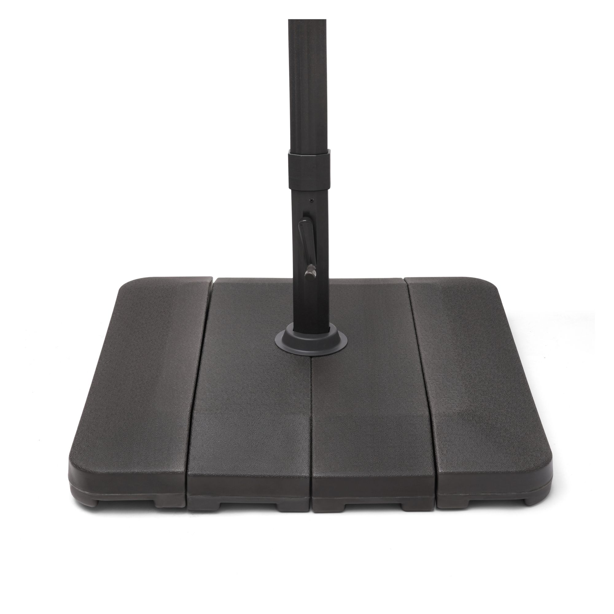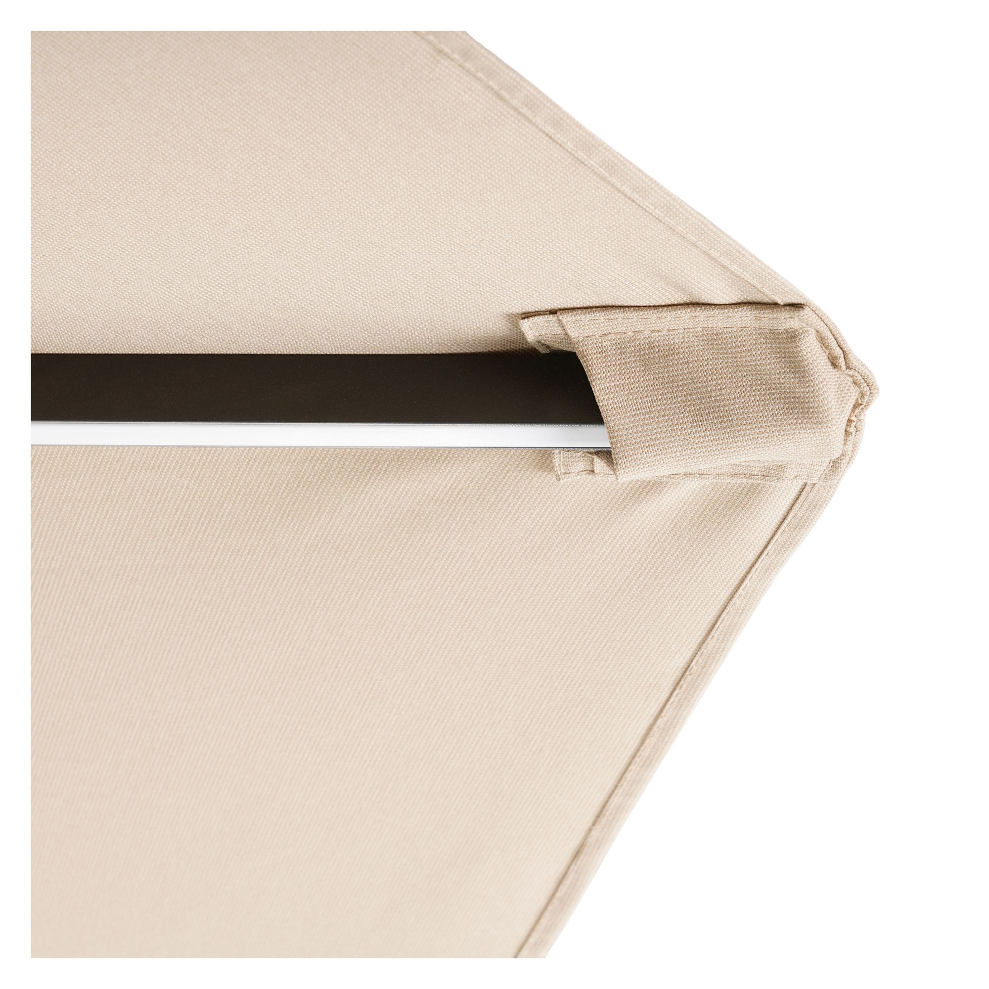 Exclusively at BJ's All weather spun polyester fabric resists fading, mildew and stains Canopy color fastness to ensure no fading within two years Rust-resistant aluminum frame with stainless fittings Heavy duty 3" x 2.2" square aluminum pole Wind resistant aluminum ribs with tube LED lights and middle light Deluxe full crank mechanism All-direction rotational mechanism 200 lb. water fillable base for complete stability Deluxe solar panel with rechargeable Nimh batteries Includes umbrella, base pole with rotation, plastic cover, screw set, base