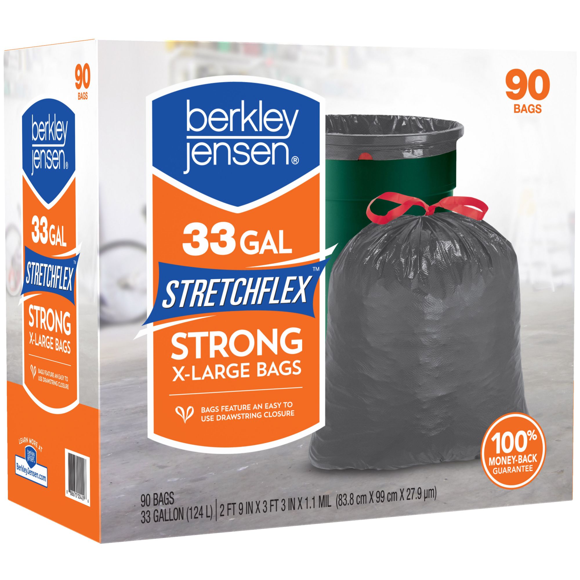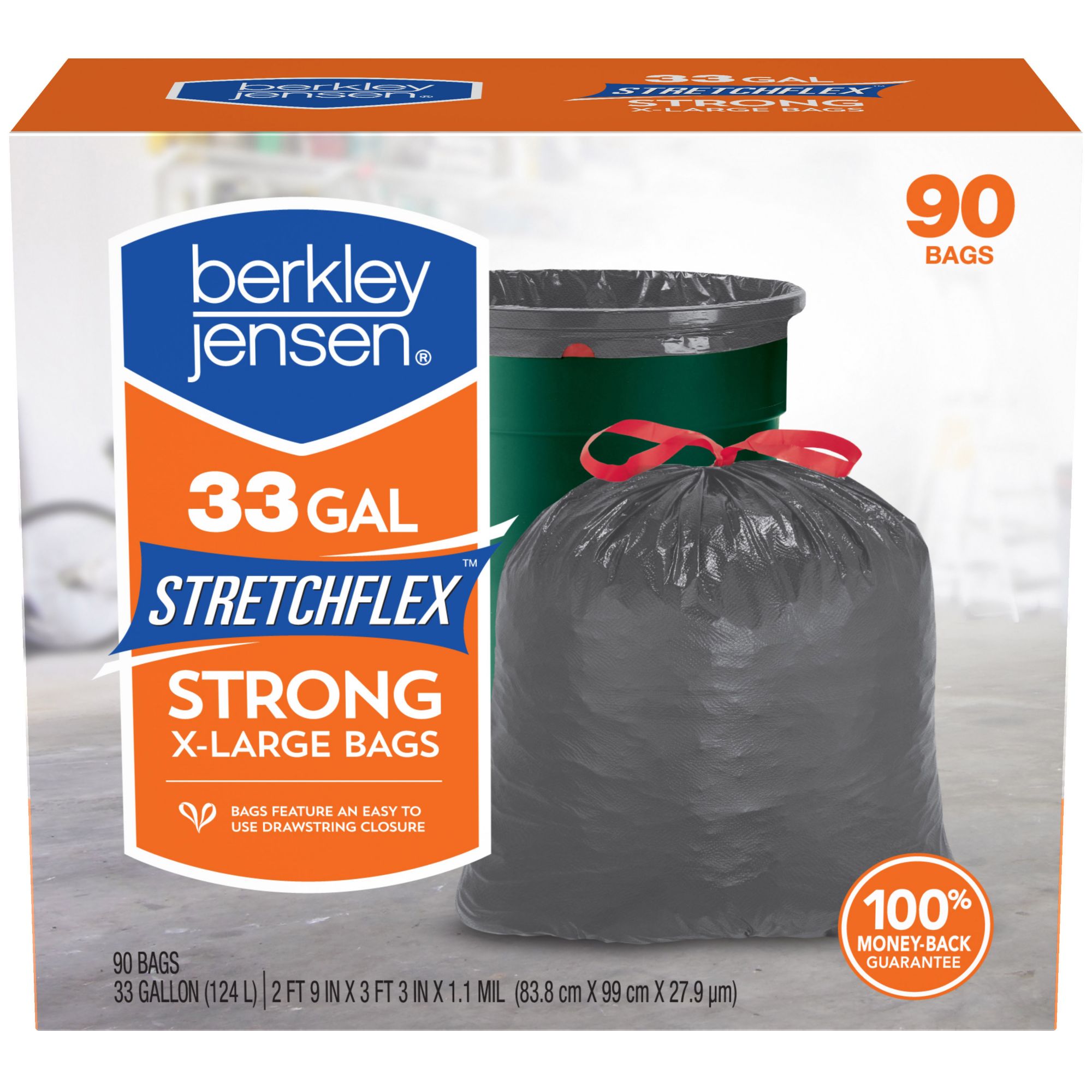 Get the most out of your trash bag. For use indoors or outdoors, these Berkley Jensen 33 gallon black trash bags offer easy-to-close drawstrings for quick tie-ups.