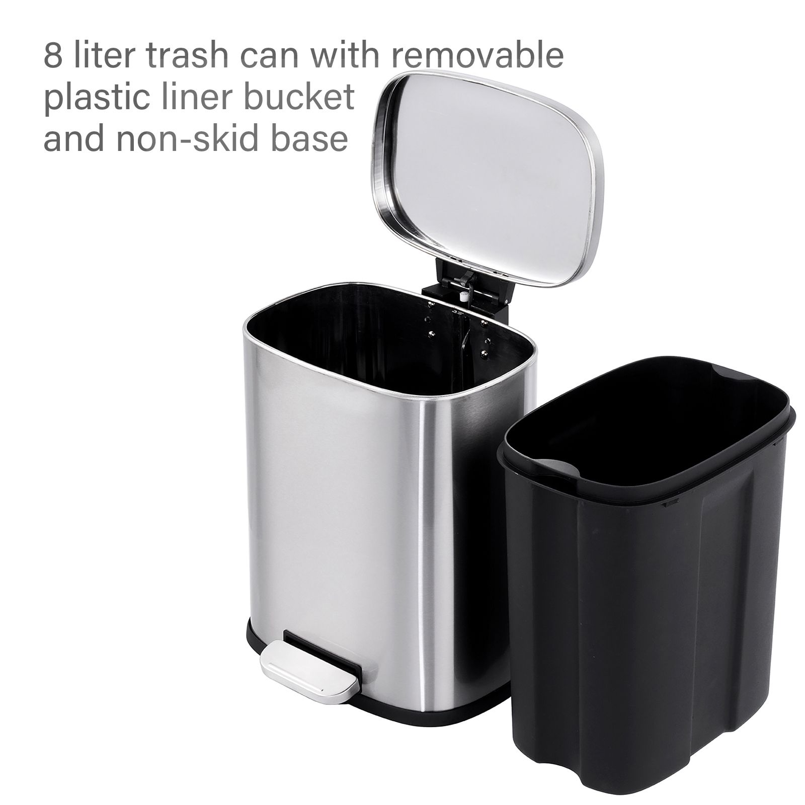 This stylish set of two rectangular stainless trash cans (13-gallon and 2-gallon) feature hands-free operation and quiet slow close lids and are perfect for kitchens and bathrooms. The strong foot pedal structure will provide many years of trouble-free use. The 13-gallon trash can includes a removable plastic rim that keeps a trash bag in place and hides the bag overhang for a neat appearance. The 2-gallon trash can includes a removable inner plastic bucket that can be used with or without a trash bag. Large handles make for convenient moving and lifting and the stay-open lid position and non-skid base allow for easy removal of trash. In brushed stainless steel with a fingerprint-resistant finish.