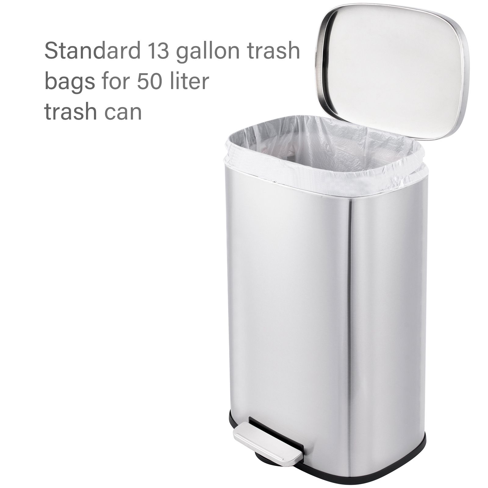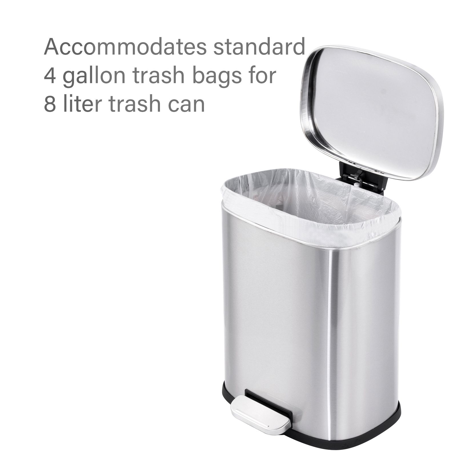 - Accommodates standard four-gallon and 13-gallon trash bags