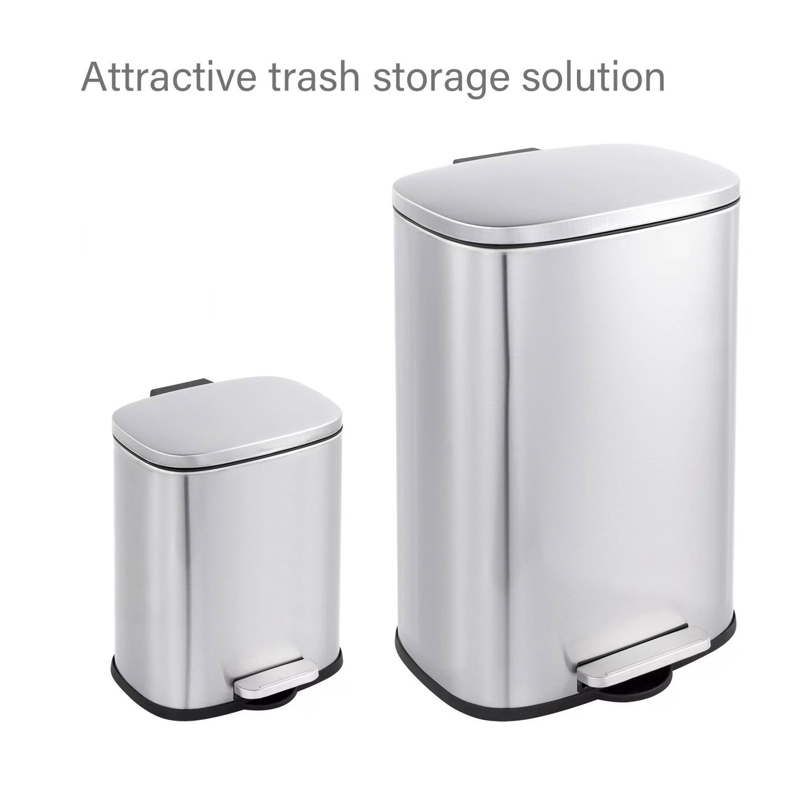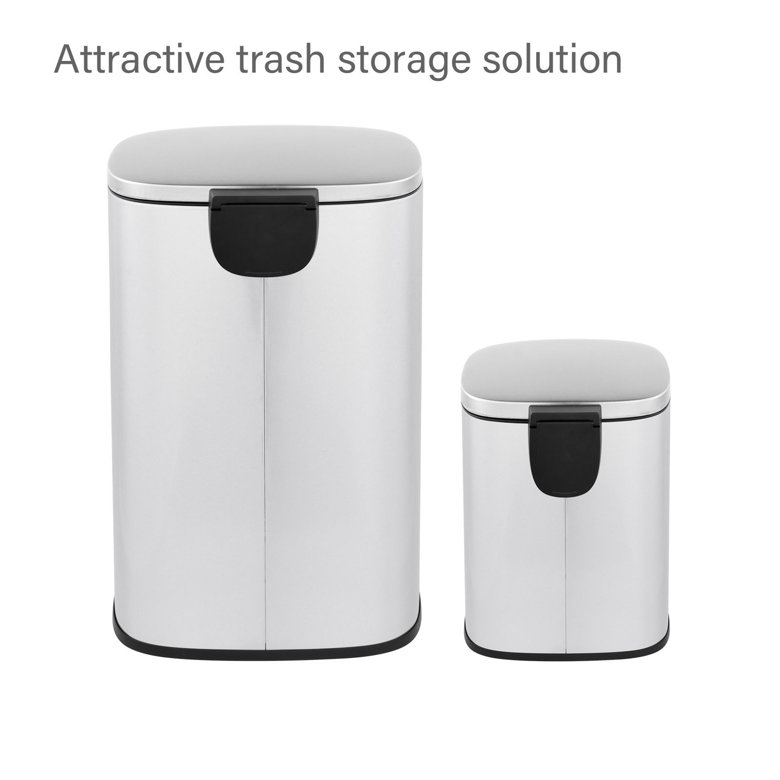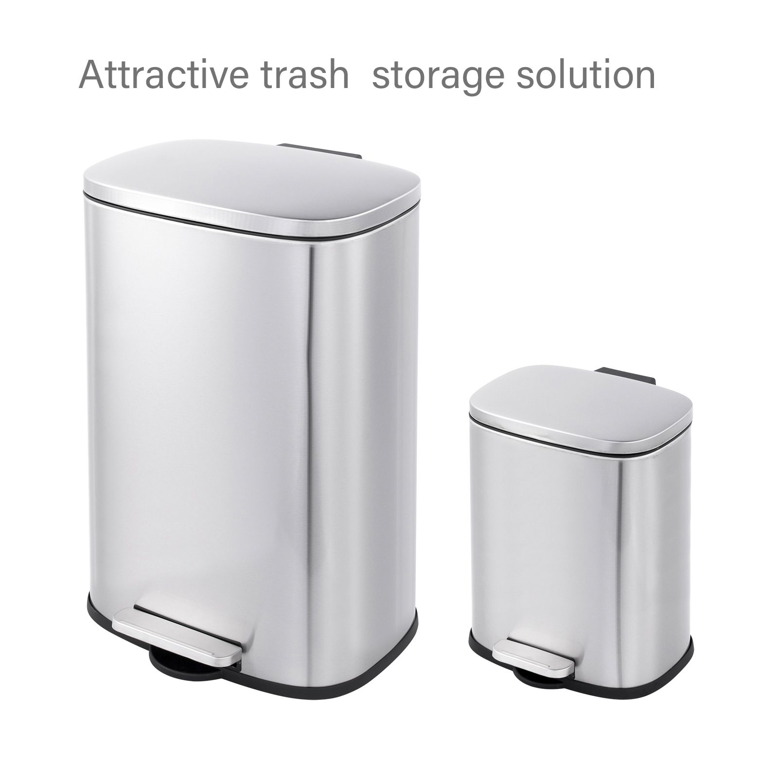 This stylish set of two rectangular stainless trash cans (13-gallon and 2-gallon) feature hands-free operation and quiet slow close lids and are perfect for kitchens and bathrooms. The strong foot pedal structure will provide many years of trouble-free use. The 13-gallon trash can includes a removable plastic rim that keeps a trash bag in place and hides the bag overhang for a neat appearance. The 2-gallon trash can includes a removable inner plastic bucket that can be used with or without a trash bag. Large handles make for convenient moving and lifting and the stay-open lid position and non-skid base allow for easy removal of trash. In brushed stainless steel with a fingerprint-resistant finish.