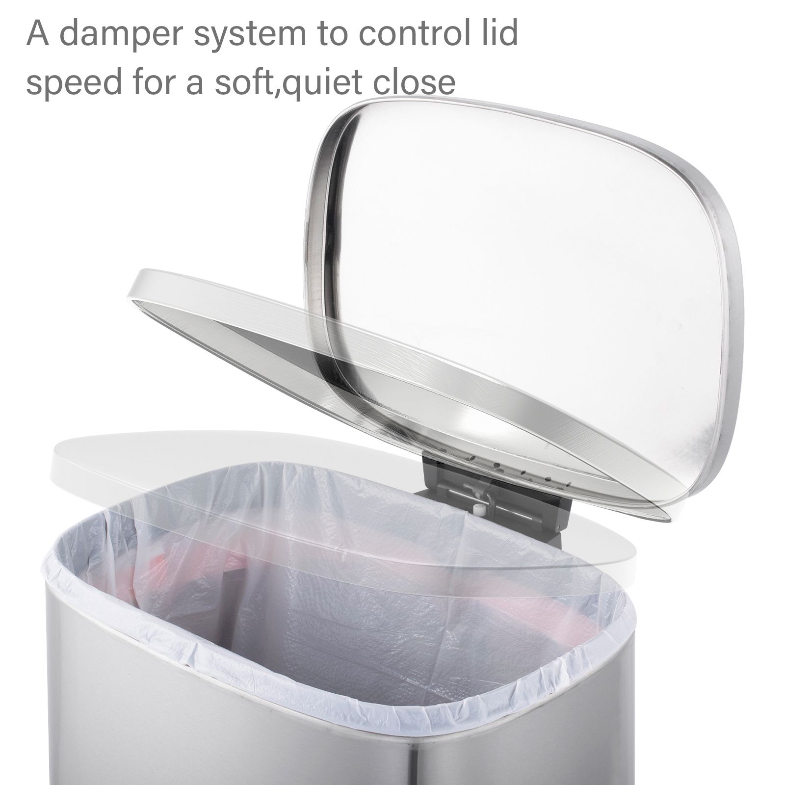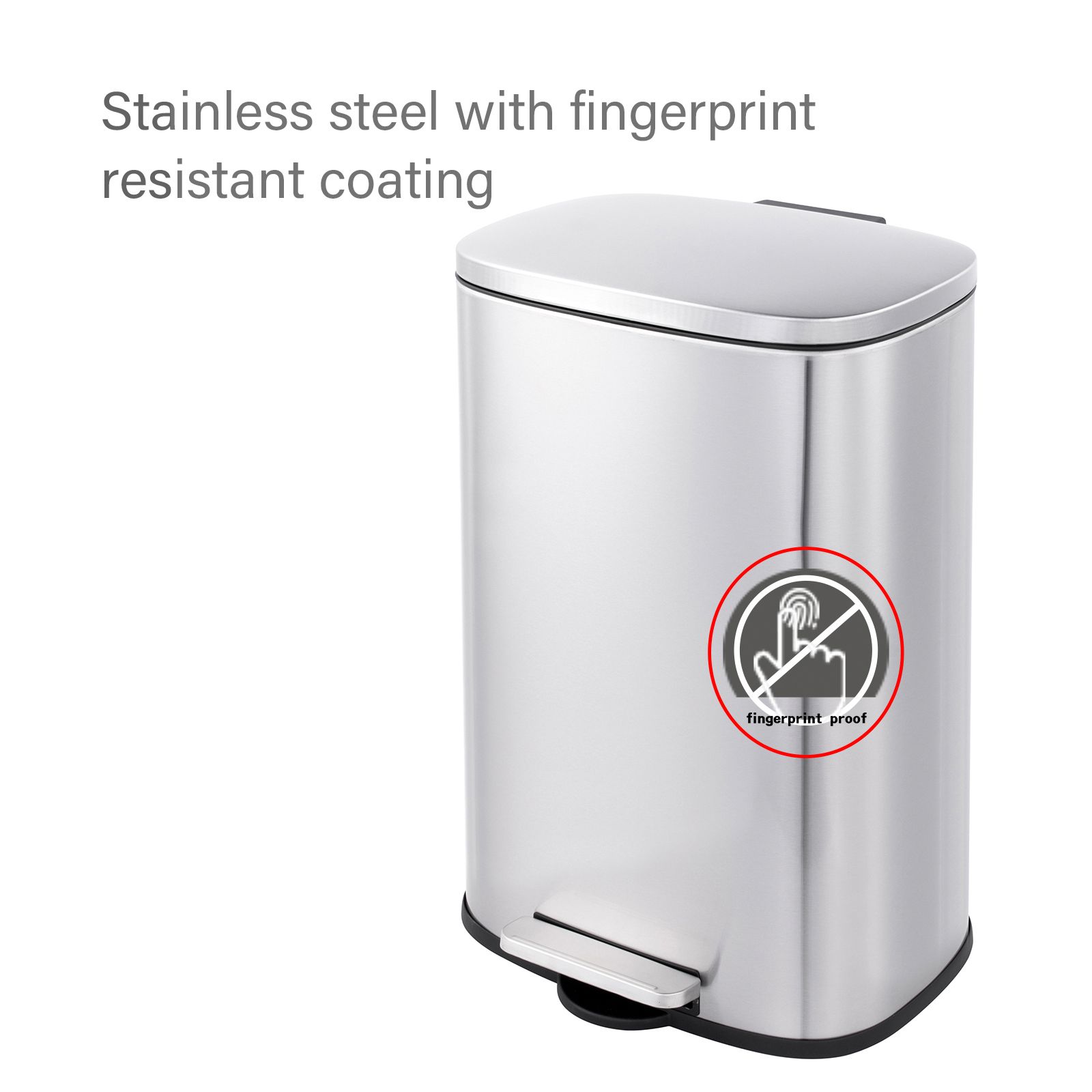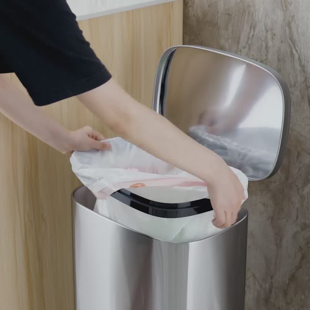 This stylish set of two rectangular stainless trash cans (13-gallon and 2-gallon) feature hands-free operation and quiet slow close lids and are perfect for kitchens and bathrooms. The strong foot pedal structure will provide many years of trouble-free use. The 13-gallon trash can includes a removable plastic rim that keeps a trash bag in place and hides the bag overhang for a neat appearance. The 2-gallon trash can includes a removable inner plastic bucket that can be used with or without a trash bag. Large handles make for convenient moving and lifting and the stay-open lid position and non-skid base allow for easy removal of trash. In brushed stainless steel with a fingerprint-resistant finish.