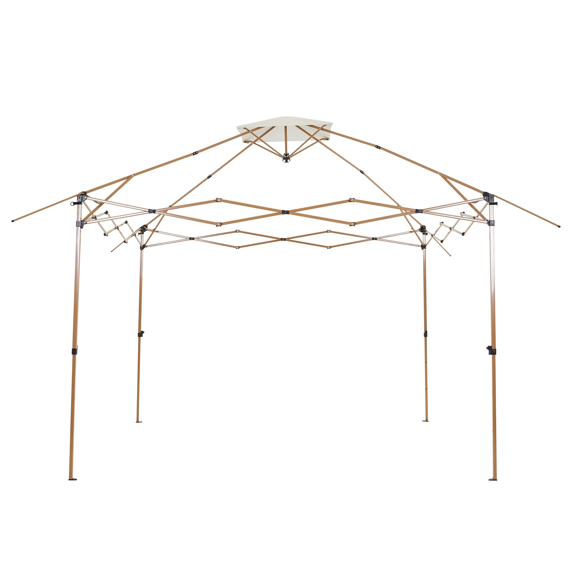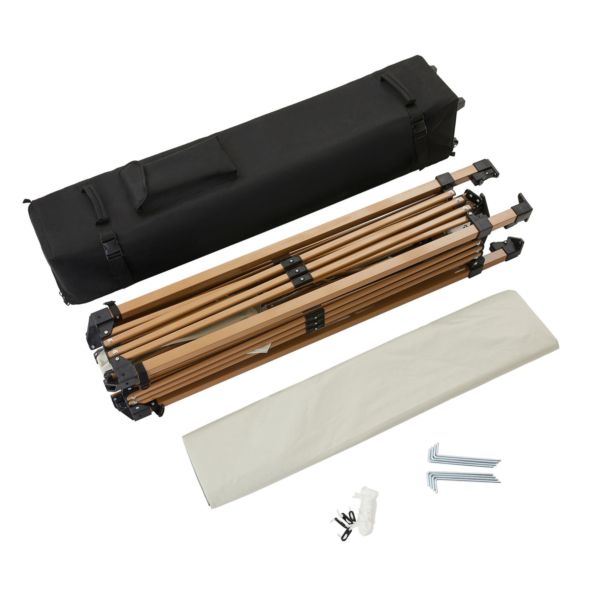 Patented EasyLift Technology allows one person set up the canopy in one minute New AutoEave technology saves extra steps to open and fold the canopy 10' x 10' frame with 170-sq.-ft. of shade with extended eaves design 11 x 22mm eaves with nut and bolt hardware and 30 x 30mm legs with three height adjustments 150D polyester vented top for cooler shade with 99% UV protection Includes canopy top, frame, wheeled carrybag, and four ground stakes