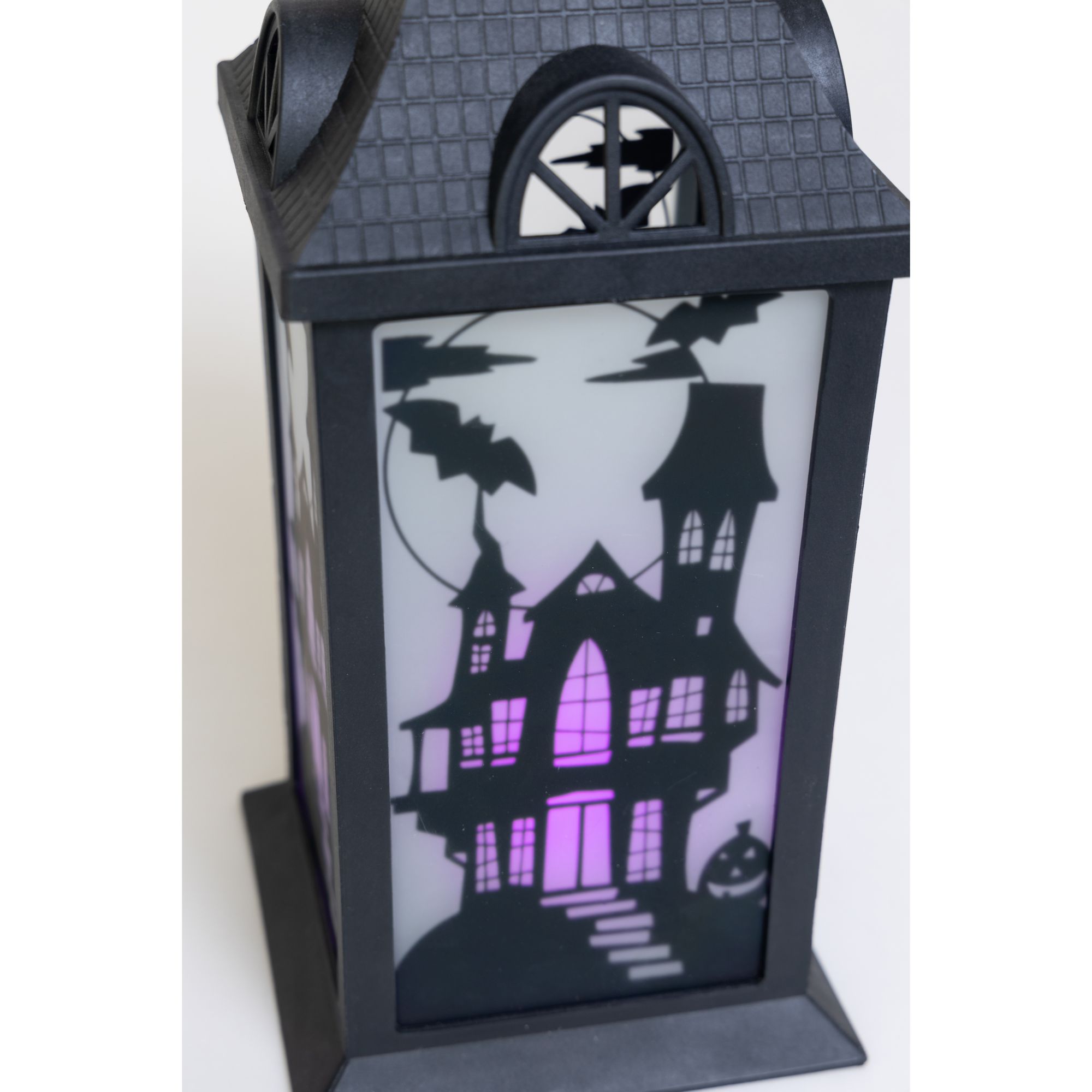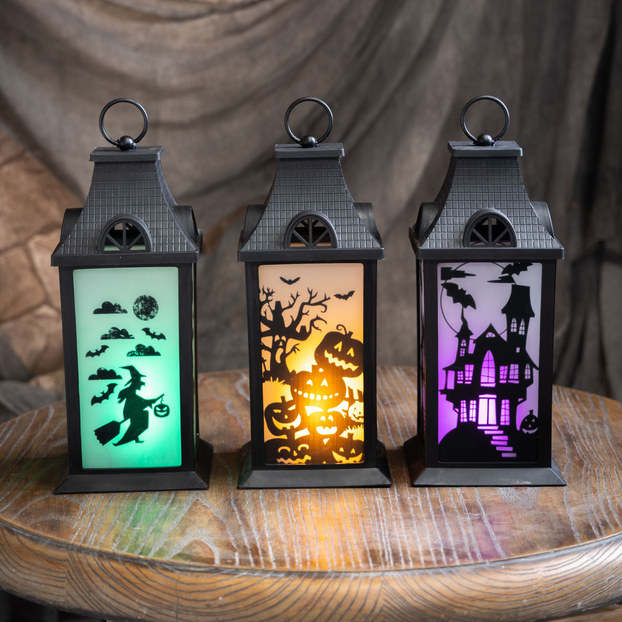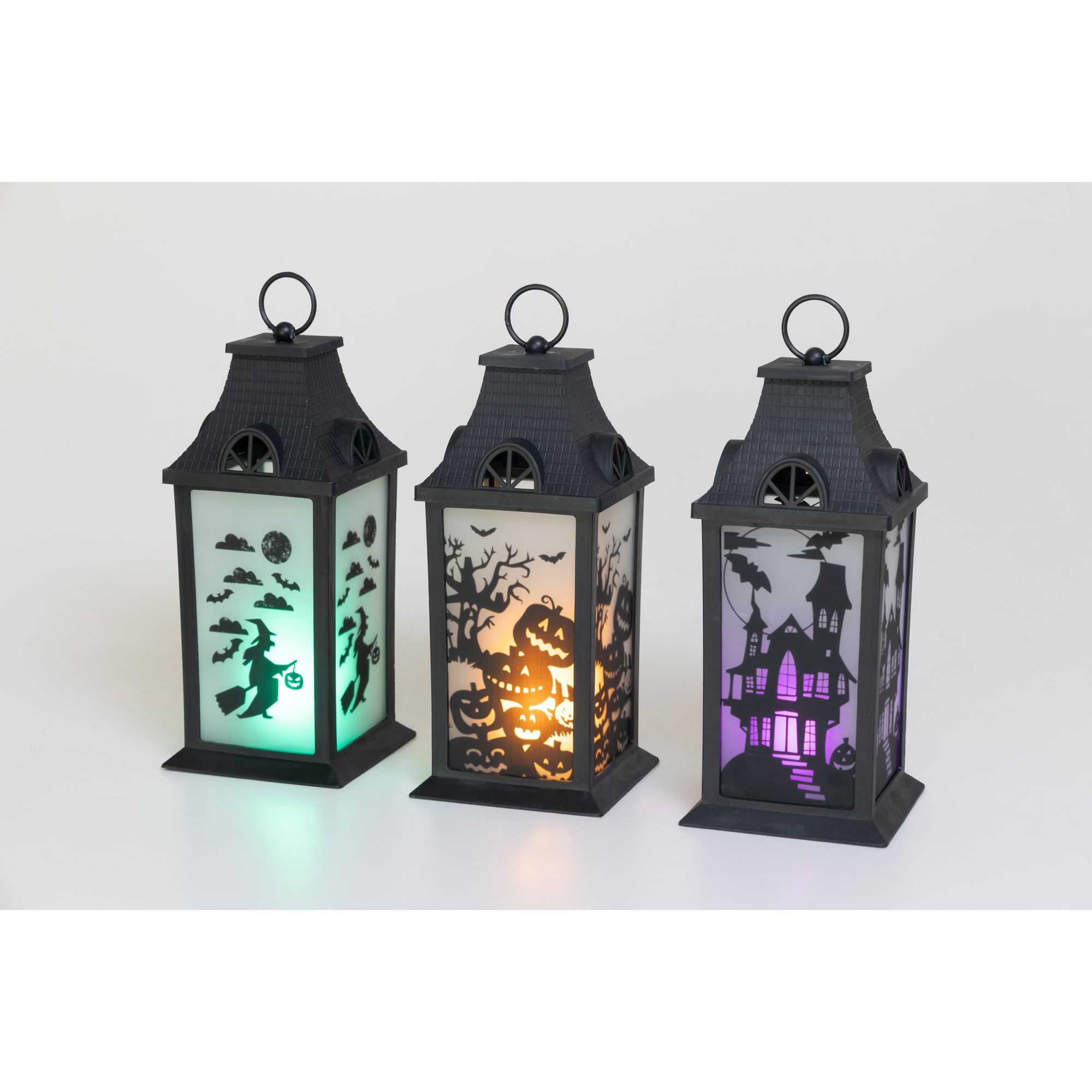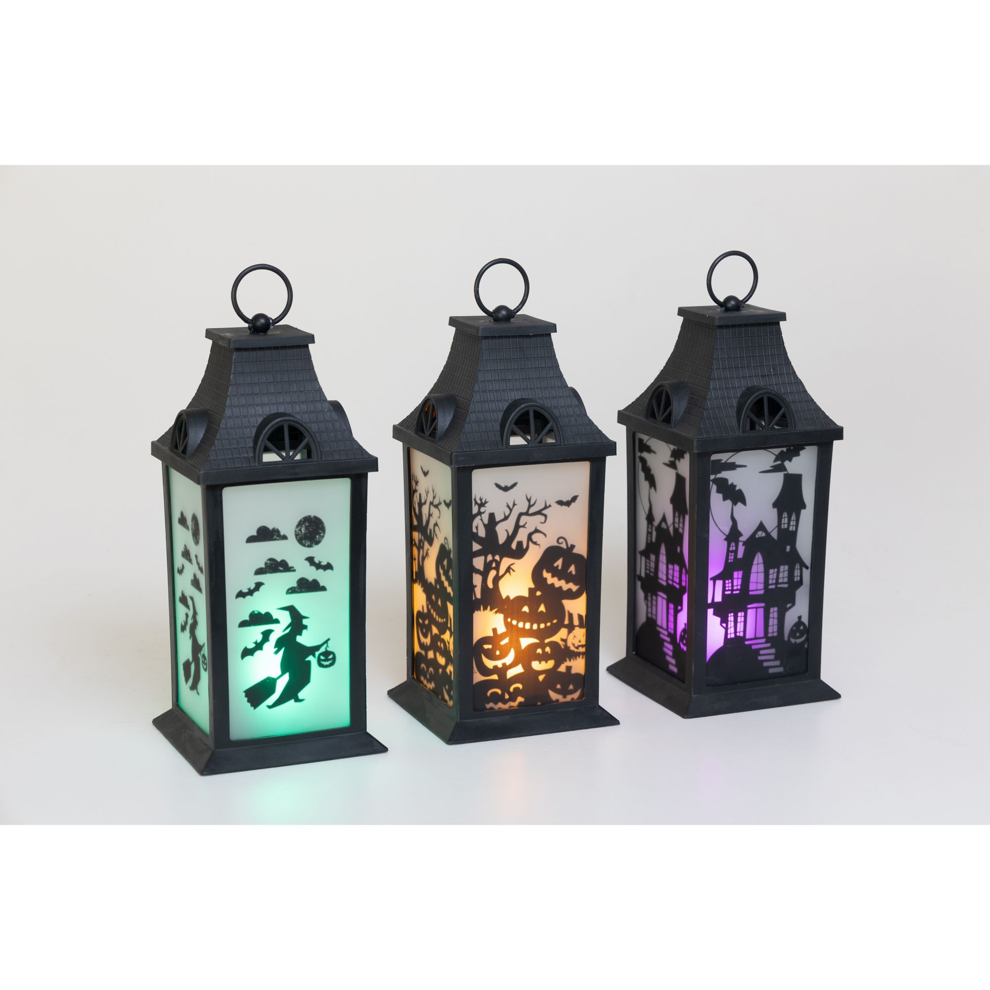 This set of three Halloween lanterns features three different patterns with green, orange, or purple LED lights. Each lantern has transparent panels with different silhouettes of a spooky Halloween scene, making this accessory more unique and beautiful. This set is the perfect Halloween accent to complement all of your other seasonal decors. Hang the lantern inside your house or let it rest by the window or put it on a desk or table. These battery-operated lanterns will glow into the night and will add a festive spirit to any room this Halloween. Each of this three lanterns is made from black plastic and glass and measures approximately 14" tall. Requires three AAA batteries. Batteries are not included. Each lantern is approximately 14" high. Made of plastic 47% and glass 53%. This item is not a toy, for decorative use only. Made in China.