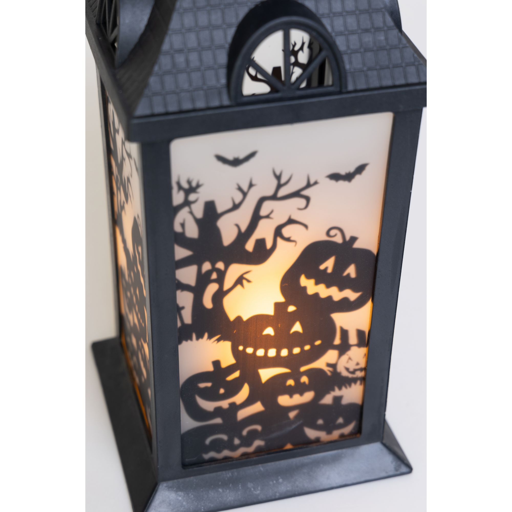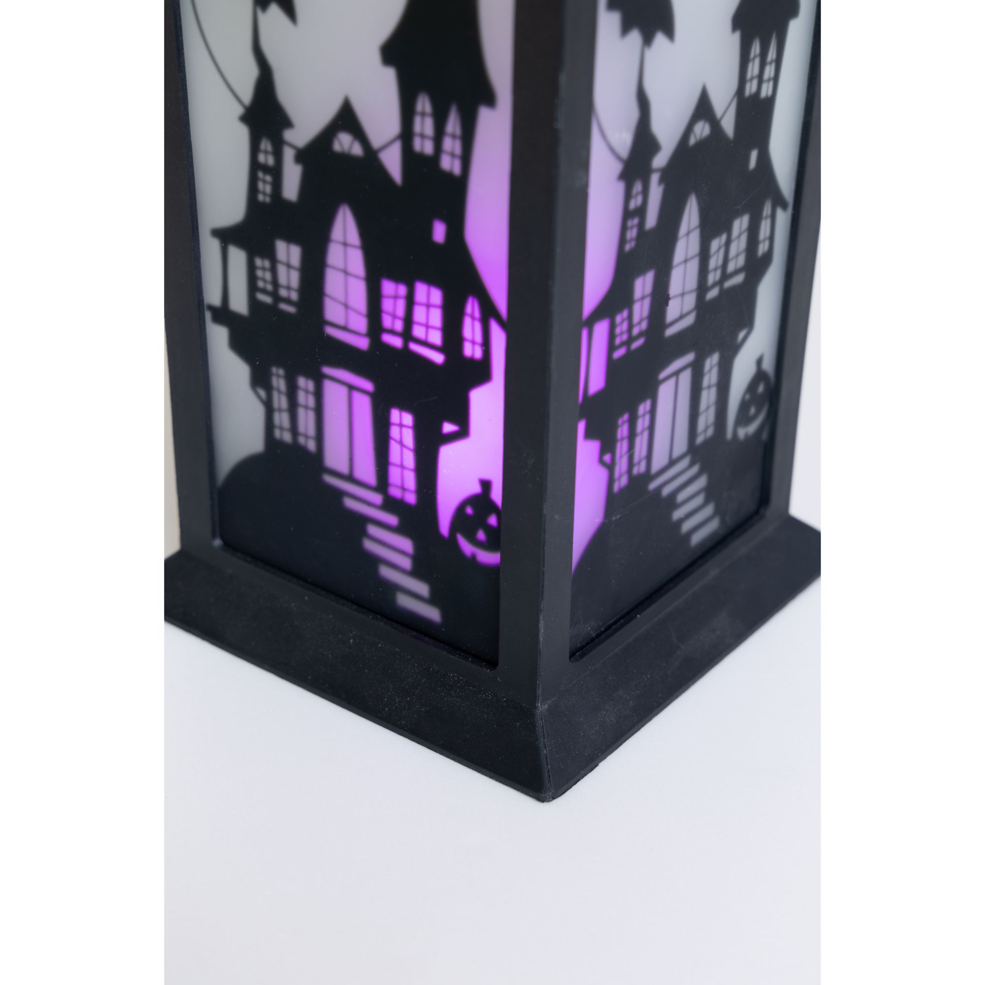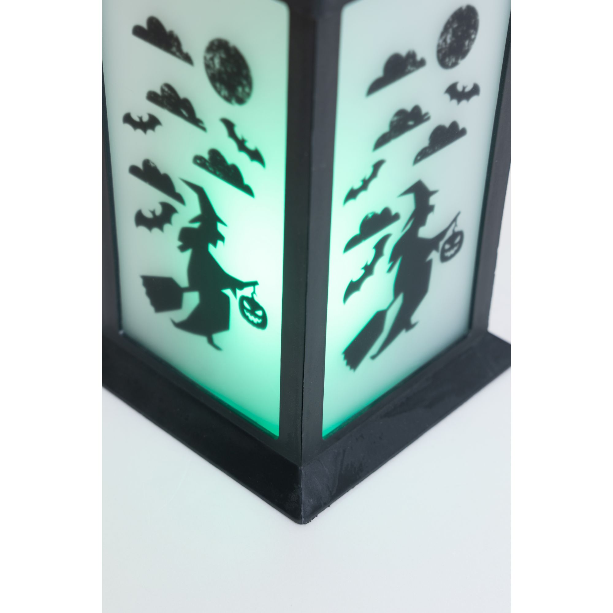 This set of three Halloween lanterns features three different patterns with green, orange, or purple LED lights. Each lantern has transparent panels with different silhouettes of a spooky Halloween scene, making this accessory more unique and beautiful. This set is the perfect Halloween accent to complement all of your other seasonal decors. Hang the lantern inside your house or let it rest by the window or put it on a desk or table. These battery-operated lanterns will glow into the night and will add a festive spirit to any room this Halloween. Each of this three lanterns is made from black plastic and glass and measures approximately 14" tall. Requires three AAA batteries. Batteries are not included. Each lantern is approximately 14" high. Made of plastic 47% and glass 53%. This item is not a toy, for decorative use only. Made in China.