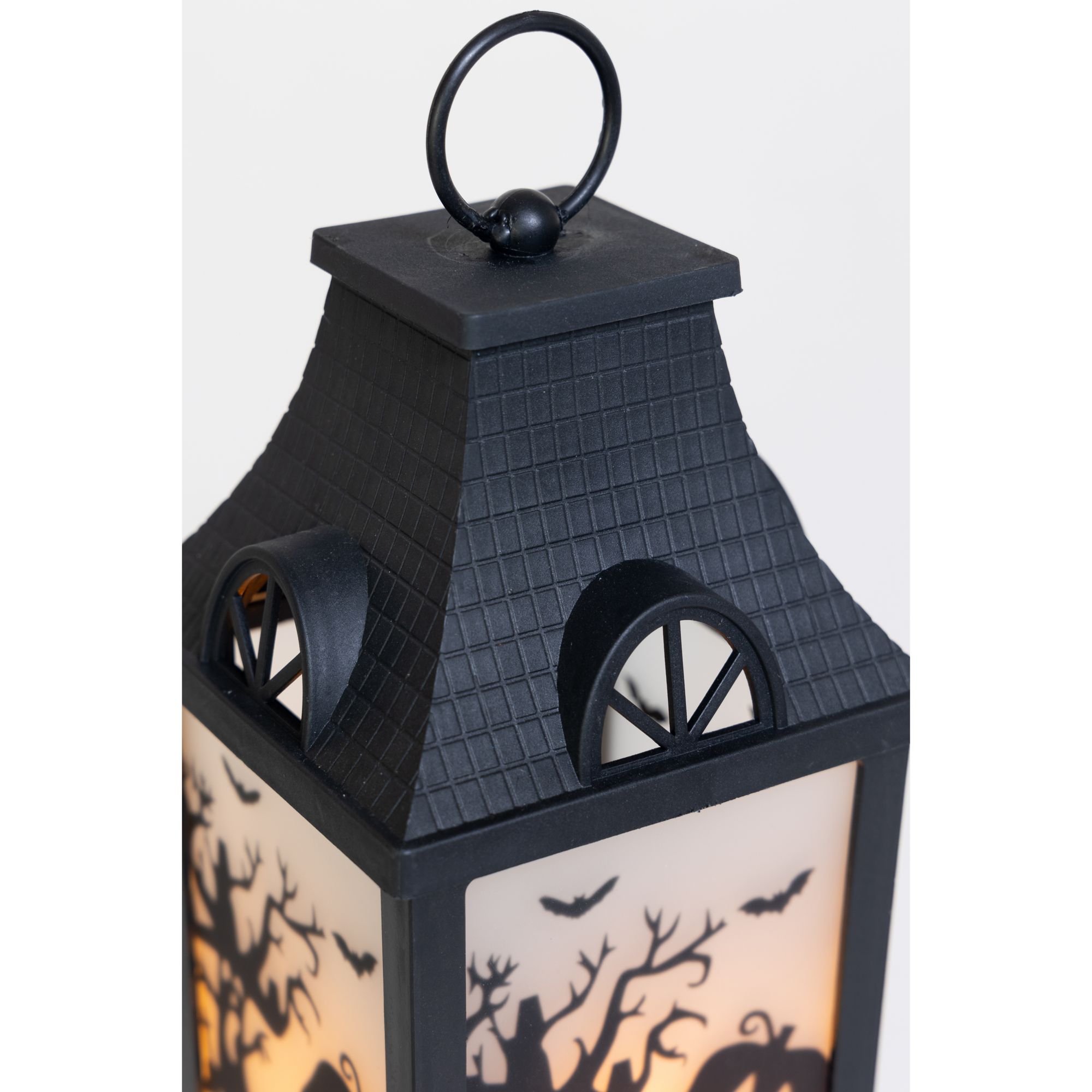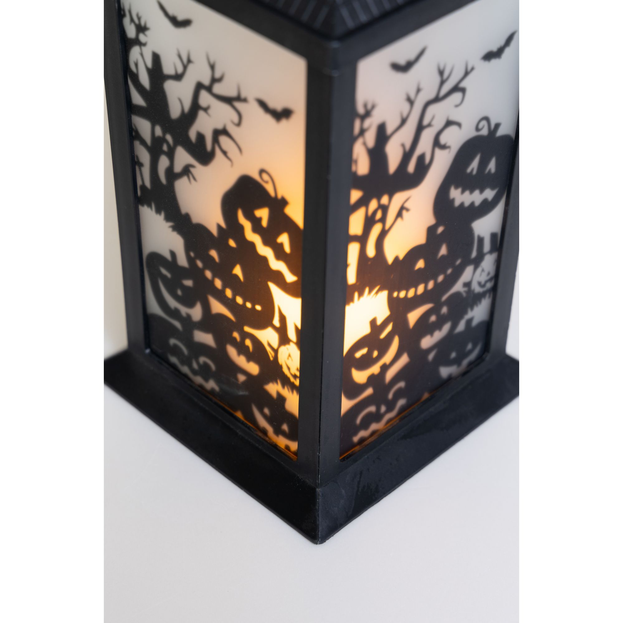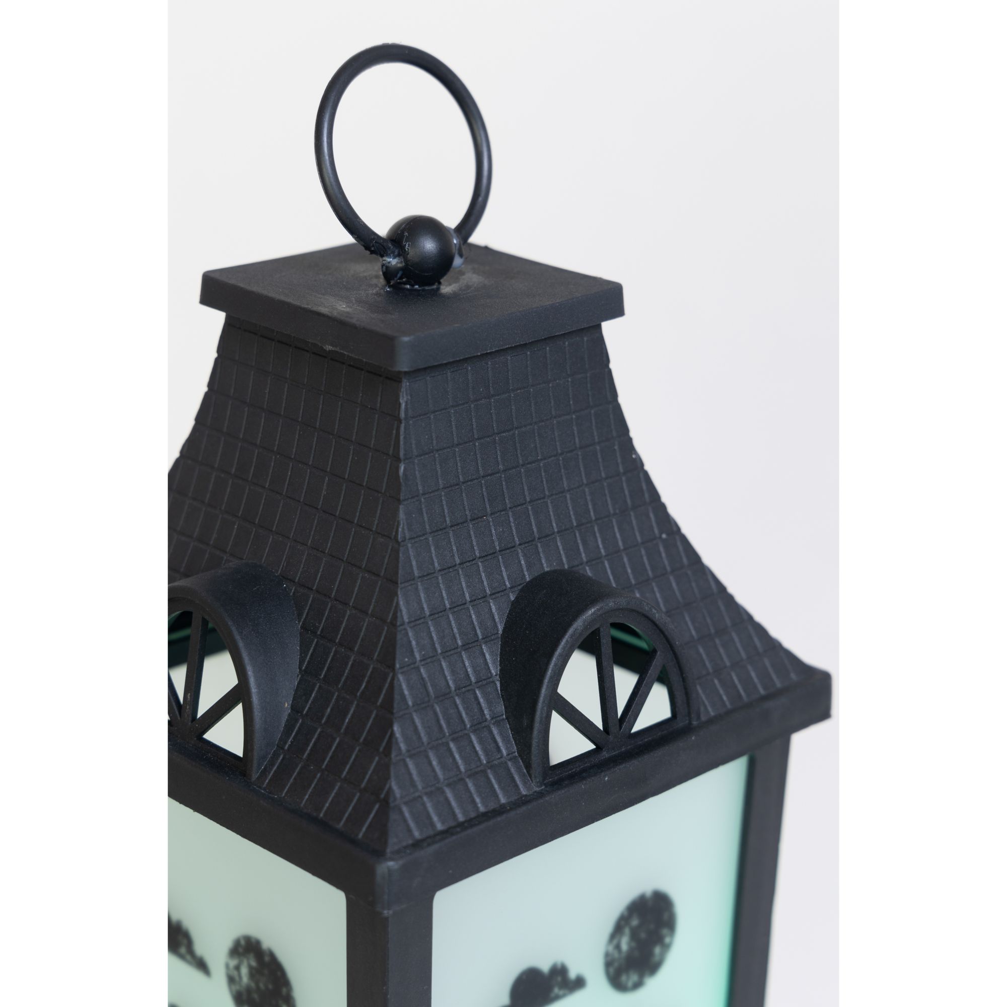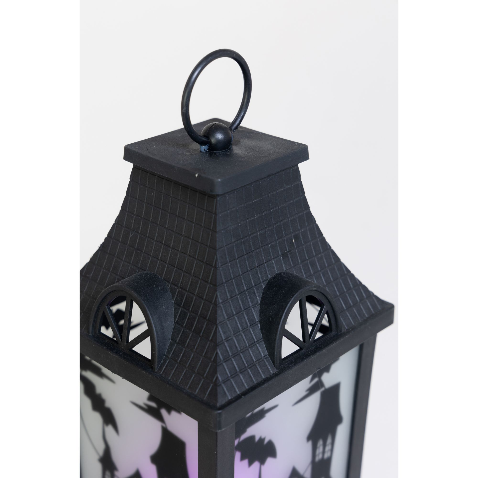 This set of three Halloween lanterns features three different patterns with green, orange, or purple LED lights. Each lantern has transparent panels with different silhouettes of a spooky Halloween scene, making this accessory more unique and beautiful. This set is the perfect Halloween accent to complement all of your other seasonal decors. Hang the lantern inside your house or let it rest by the window or put it on a desk or table. These battery-operated lanterns will glow into the night and will add a festive spirit to any room this Halloween. Each of this three lanterns is made from black plastic and glass and measures approximately 14" tall. Requires three AAA batteries. Batteries are not included. Each lantern is approximately 14" high. Made of plastic 47% and glass 53%. This item is not a toy, for decorative use only. Made in China.