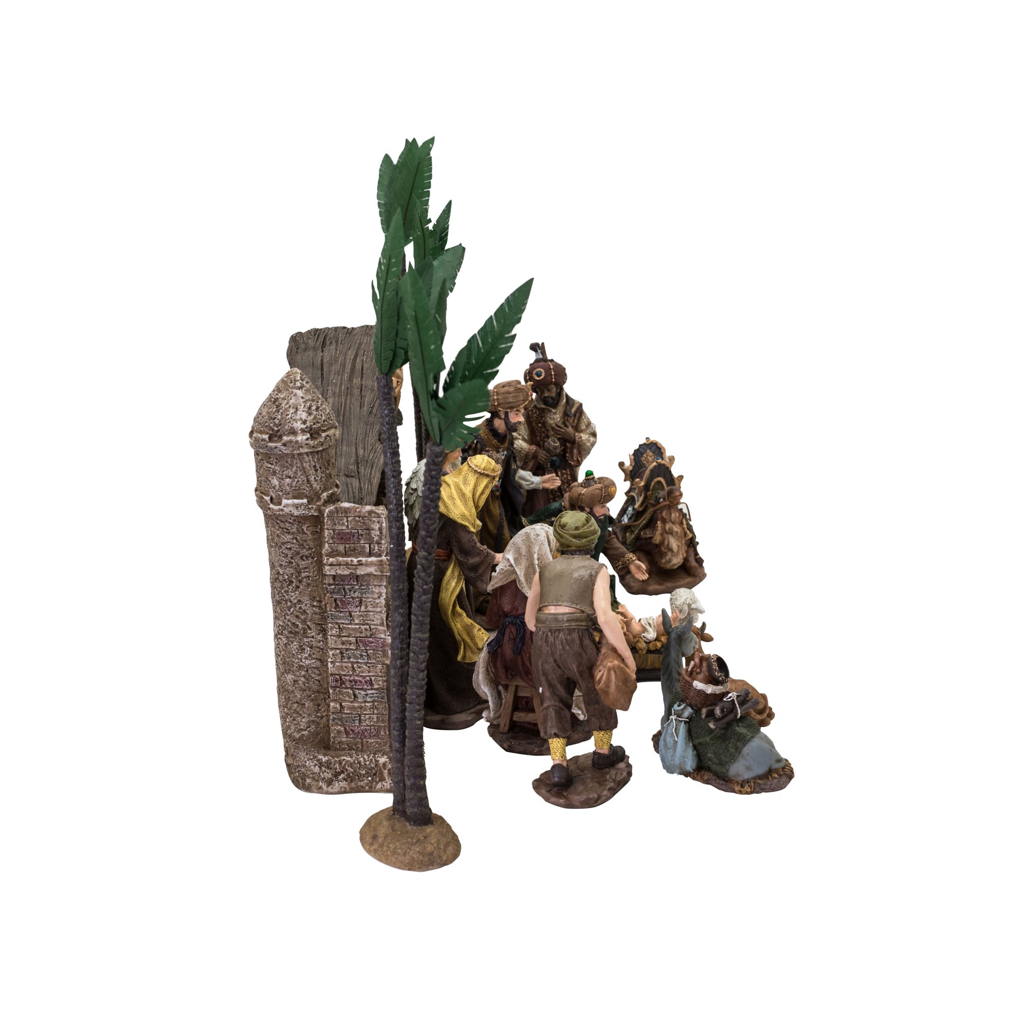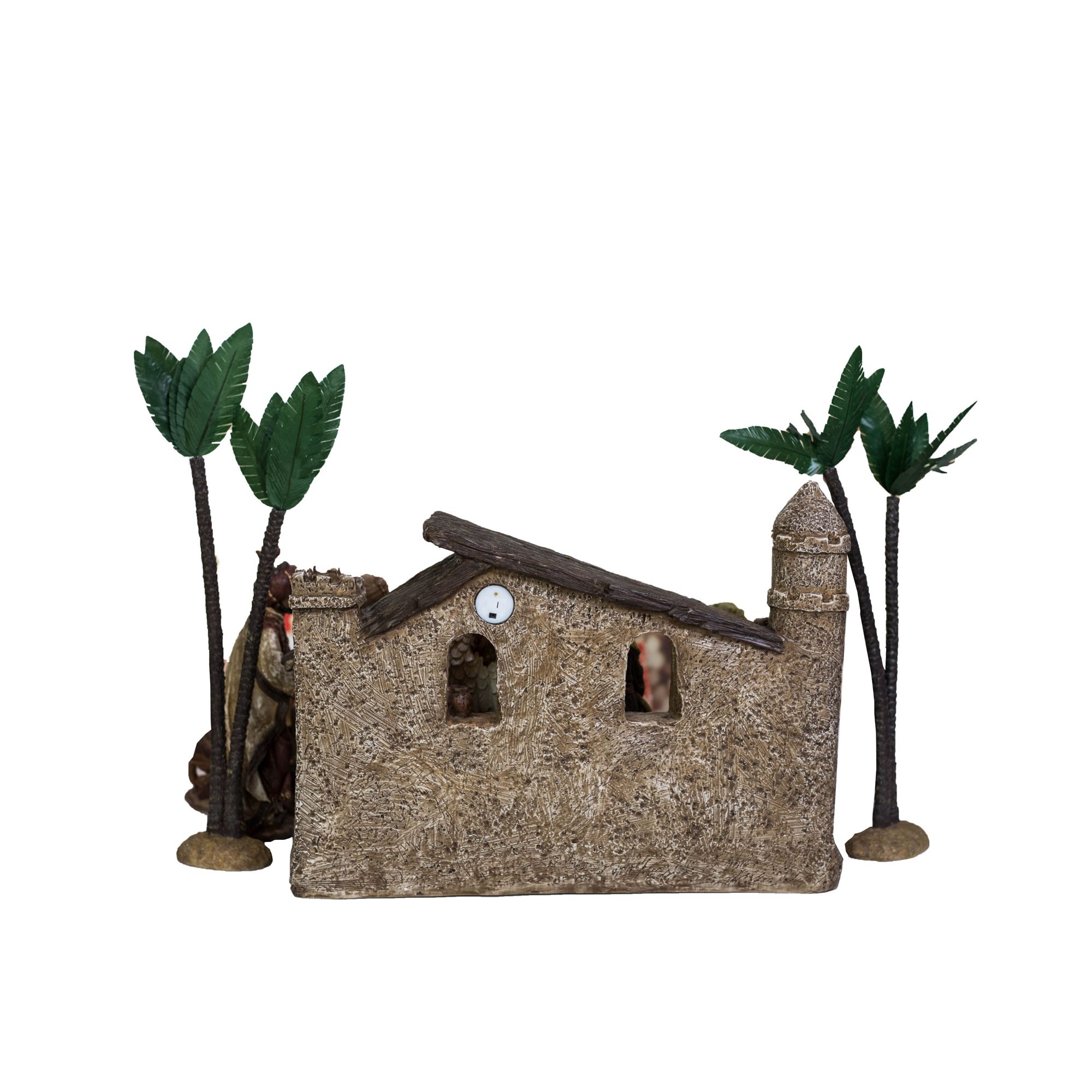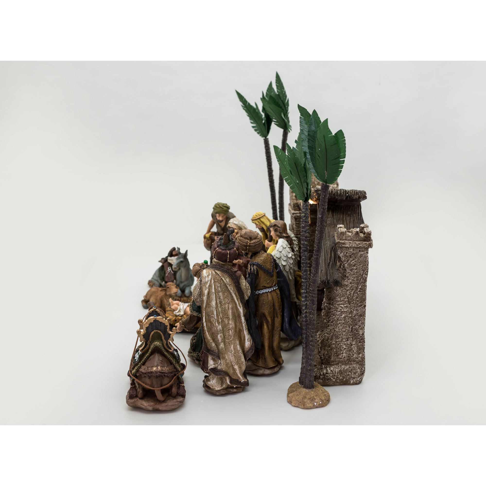 Figurine approximate size: 12" Crafted and painted by hand This item is not a toy, for indoor decorative use only Made of polyresin, stone powder and paint With LED lights Batteries: 3/LR44 included For indoor decorative use only Includes 16-pc. nativity set