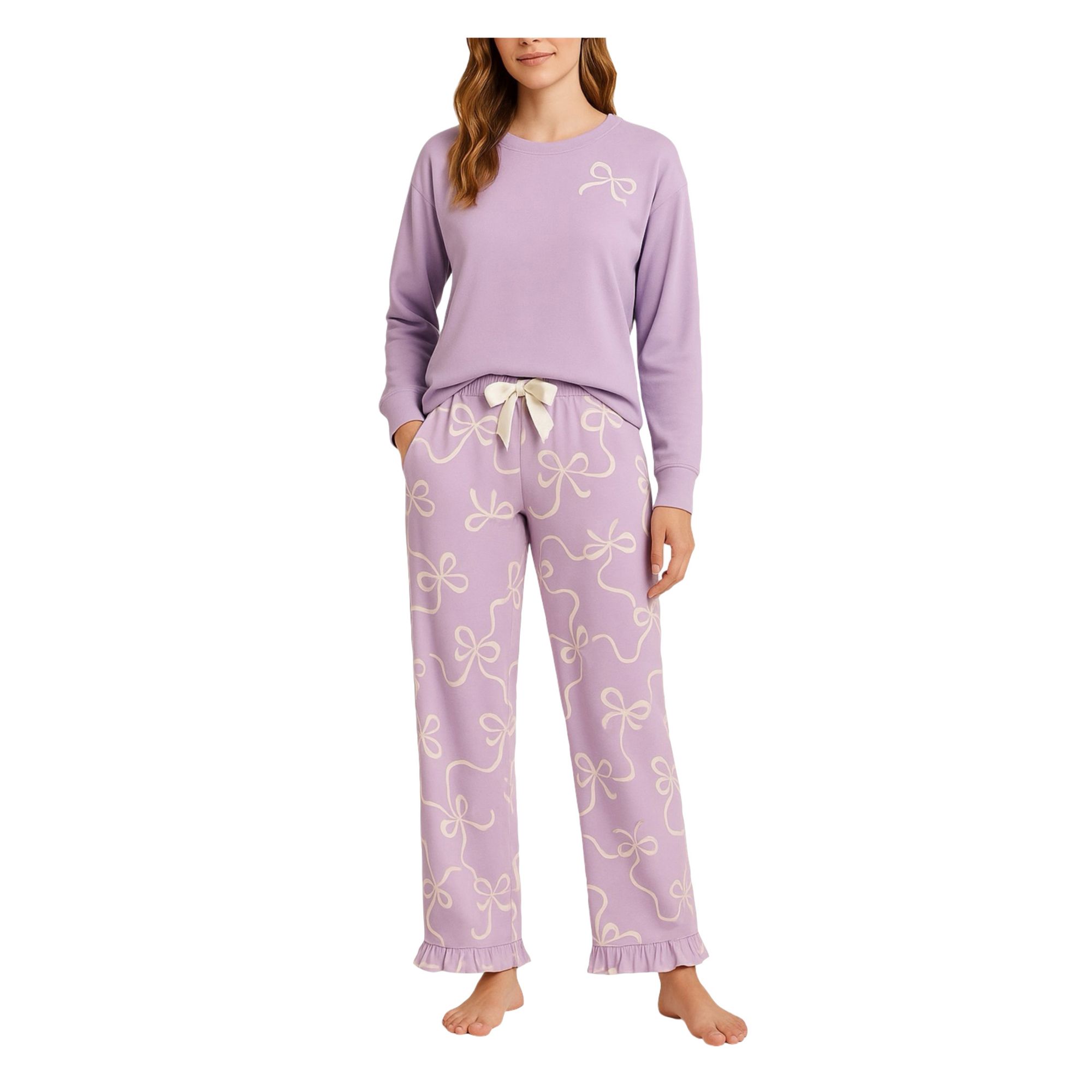 Dream in color with this lavender pajama set, designed for those who love a blend of comfort and charm. The graceful bow motif on the top coordinates beautifully with the matching printed pants, complete with a satin bow at the waist and ruffle hems. Soft to the touch and effortlessly stylish, this set makes unwinding feel like a little everday luxury