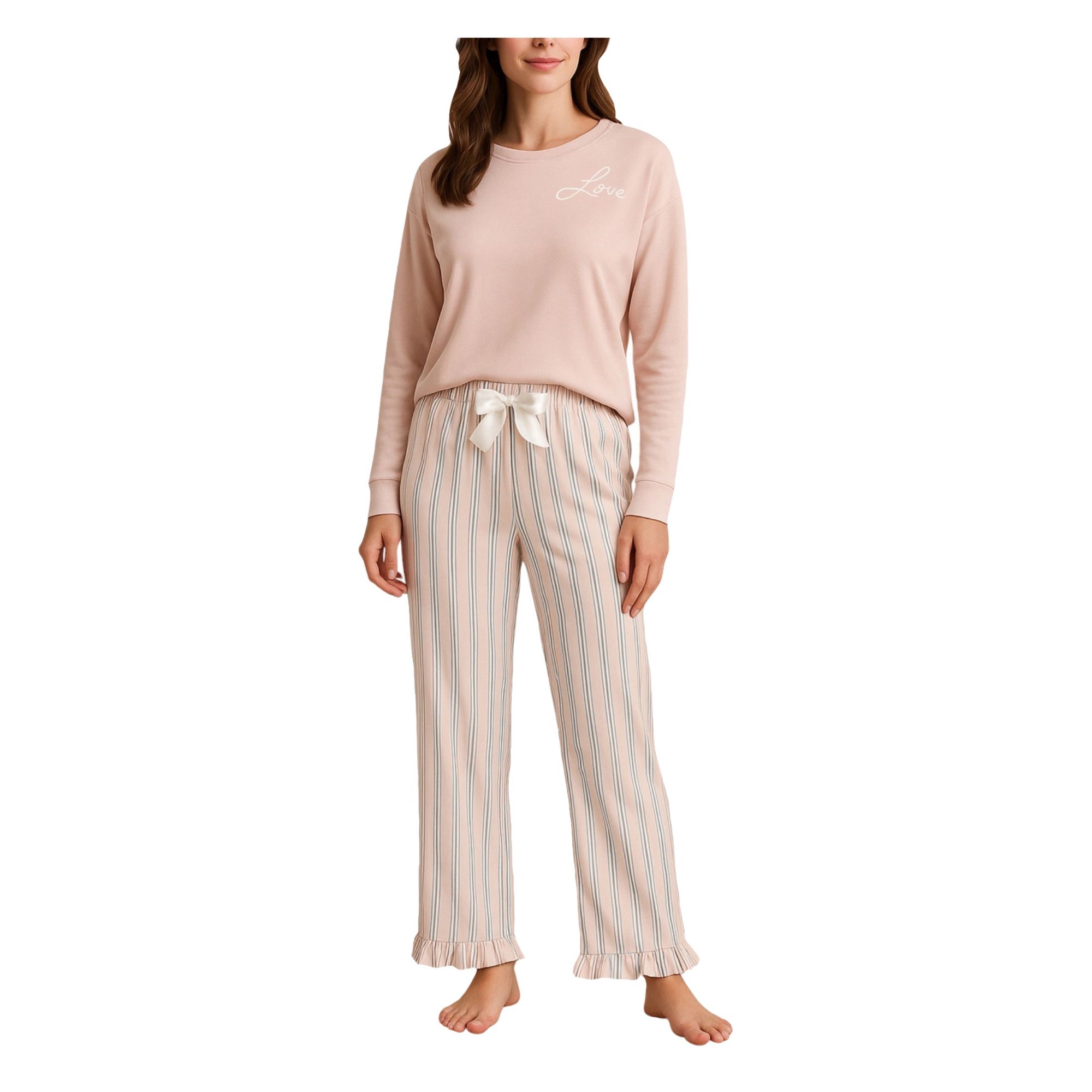 Soft and sophisticated, the light pink pajama set brings a touch of timeless elegrance to your loungewear. The sutble embroidered detail on the top pairs effortlessly with striped pants finished with a dainty satin bow and delicate ruffles. Designed for gentle comfort, this set offers an airy, lighweight feel that makes it as luxurious as it is relaxing.