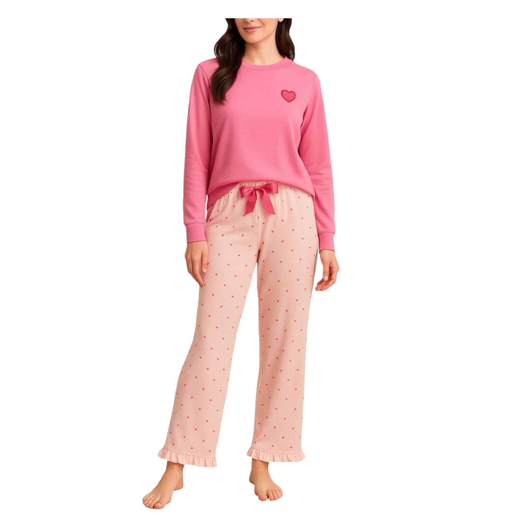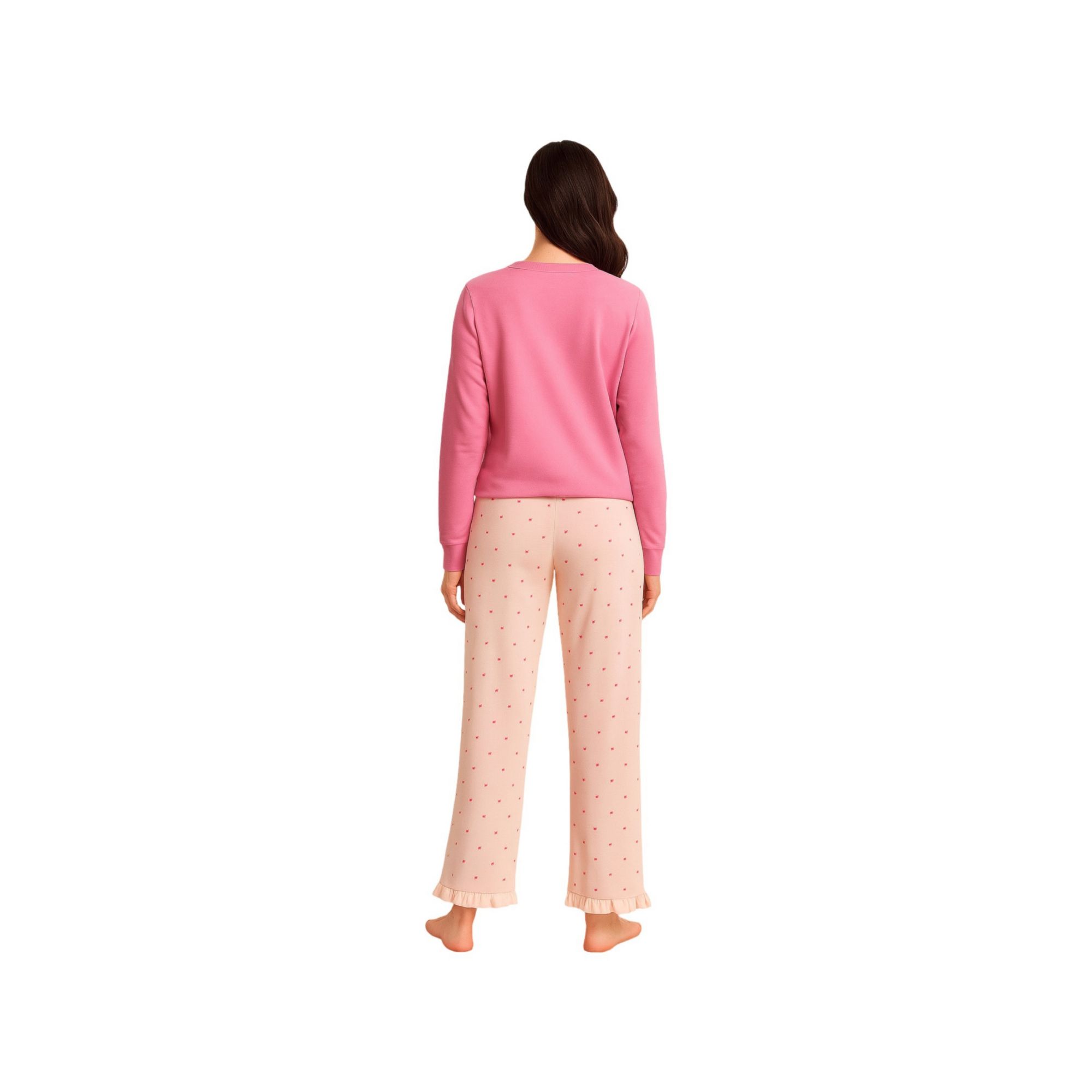 Unwind in sweetness with this pink pajama set that blends warmth and playfulness. The cozy long sleeve top features a charming heart detail, perfectly matched with polka dot pants accented by a satin bow and ruffled hems. Crafted from soft, breathable fabric, this set offers the perfect combination of comfort, ideal for cozy nights or slow weekend mornings.