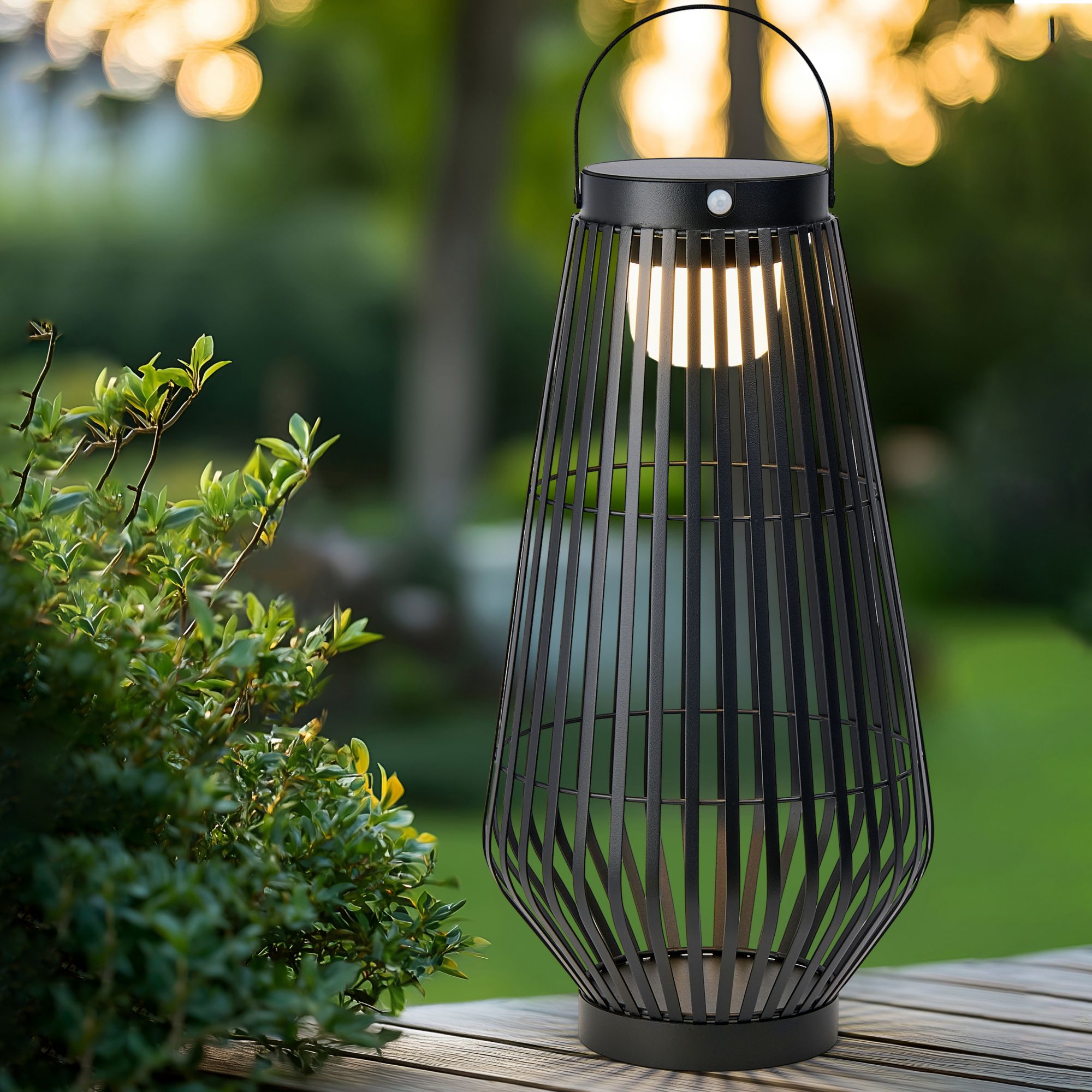 Metal lanterns are constructed from high-quality metal that is weatherproof for outdoor use. The elegant striped light shade with a light effect is great. Decorate in the garden and patio. Multi-dimmable lighting design - hand touch three dims of high/medium/low. Warm white light brightness to bring a different atmosphere. Built-in high capacity 1800mAh li-ion battery and solar panel with solar charging, as well with type C charging (wire is excluded). The motion sensor is an upgrade feature, live objects are detected close to the sensor.