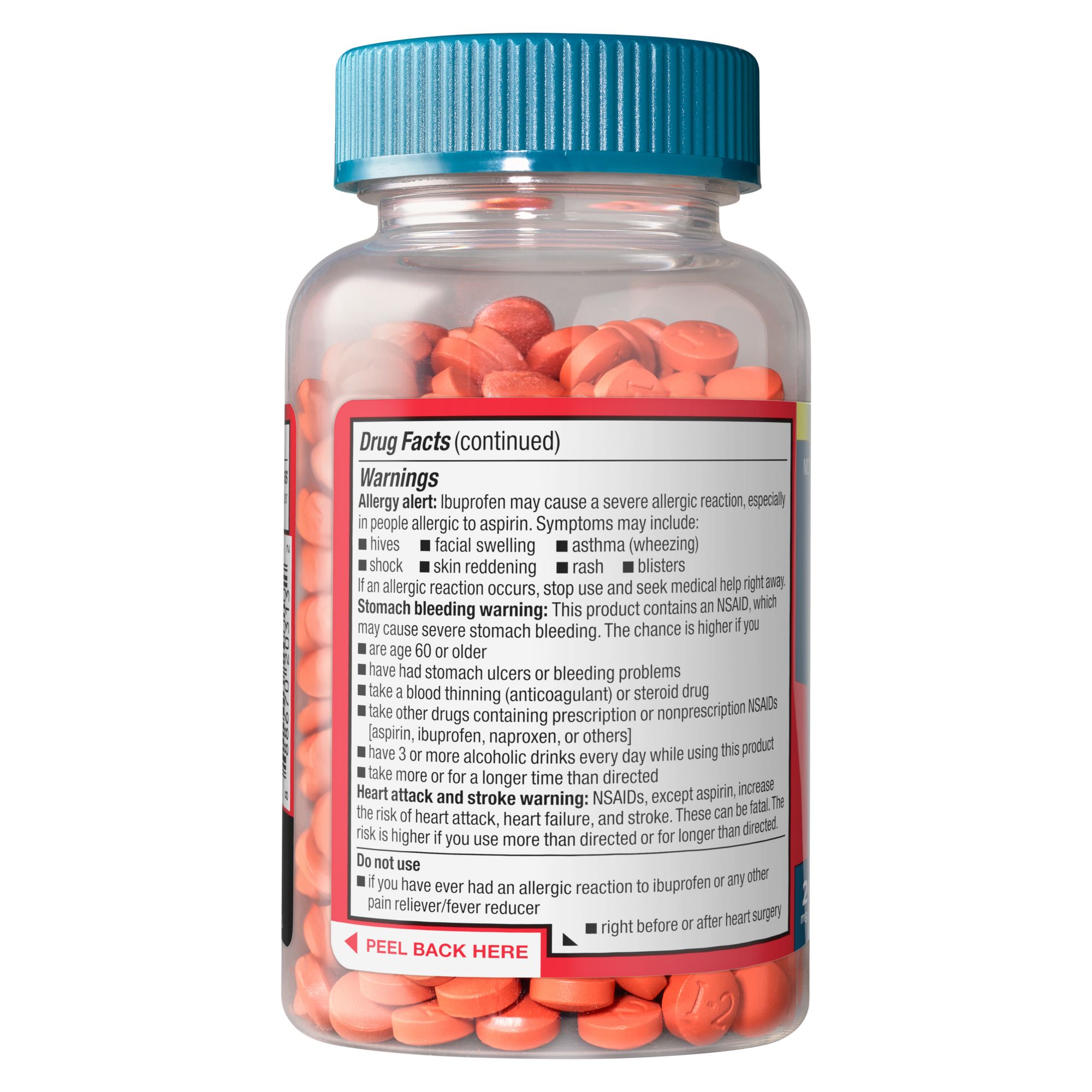 Product Warnings and Restrictions: Warnings: Allergy Alert: Ibuprofen May Cause A Severe Allergic Reaction, Especially In People Allergic To Aspirin. Symptoms May Include: Hives; Facial Swelling; Asthma (Wheezing); Shock; Skin Reddening; Rash; Blisters. If An Allergic Reaction Occurs, Stop Use And Seek Medical Help Right Away. Stomach Bleeding Warning: This Product Contains An NSAID, Which May Cause Severe Stomach Bleeding. The Chances Are Higher If You: Are Age 60 Or Older; Have Had Stomach Ulcers Or Bleeding Problems; Take A Blood Thinning (Anticoagulant) Or Steroid Drug; Take Other Drugs Containing Prescription Or Nonprescription NSAIDs [Aspirin, Ibuprofen, Naproxen, Or Others]; Have Three Or More Alcoholic Drinks Every Day While Using This Product; Take More Or For A Longer Time Than Directed. Heart Attack And Stroke Warning: NSAIDs, Except Aspirin, Increase The Risk Of Heart Attack, Heart Failure, And Stroke. These Can Be Fatal. The Risk Is Higher If You Use More Than Directed Or For Longer Than Directed. Do Not Use: If You Have Ever Had An Allergic Reaction To Ibuprofen Or Any Other Pain Reliever/Fever Reducer; Right Before Or After Heart Surgery. Ask A Doctor Before Use If: You Have Problems Or Serious Side Effects From Taking Pain Relievers Or Fever Reducers; The Stomach Bleeding Warning Applies To You; You Have A History Of Stomach Problems, Such As Heartburn; You Have High Blood Pressure, Heart Disease, Liver Cirrhosis, Kidney Disease, Asthma, Or Had A Stroke; You Are Taking A Diuretic. Ask A Doctor Or Pharmacist Before Use If You Are: Taking Aspirin For A Heart Attack Or Stroke, Because Ibuprofen May Decrease This Benefit Of Aspirin; Under A Doctor’s Care For Any Serious Condition; Taking Any Other Drug. When Using This Product: Take With Food Or Milk If Stomach Upset Occurs. Stop Use And Ask A Doctor If: You Experience Any Of The Following Signs Of Stomach Bleeding: Feel Faint; Vomit Blood; Have Bloody Or Black Stools; Have Stomach Pain That Does Not Get Better; You Have Symptoms Of Heart Problems Or Stroke: Chest Pain; Trouble Breathing; Weakness In One Part Or Side Of Body; Slurred Speech; Leg Swelling; Pain Gets Worse Or Lasts More Than 10 Days; Fever Gets Worse Or Lasts More Than Three Days; Redness Or Swelling Is Present In The Painful Area; Any New Symptoms Appear. If Pregnant Or Breastfeeding, Ask A Health Professional Before Use. It Is Especially Important Not To Use Ibuprofen At 20 Weeks Or Later In Pregnancy Unless Definitely Directed To Do So By A Doctor, Because It May Cause Problems In The Unborn Child Or Complications During Delivery. Keep Out Of Reach Of Children. In Case Of Overdose, Get Medical Help Or Contact A Poison Control Center Right Away (1-800-222-1222).