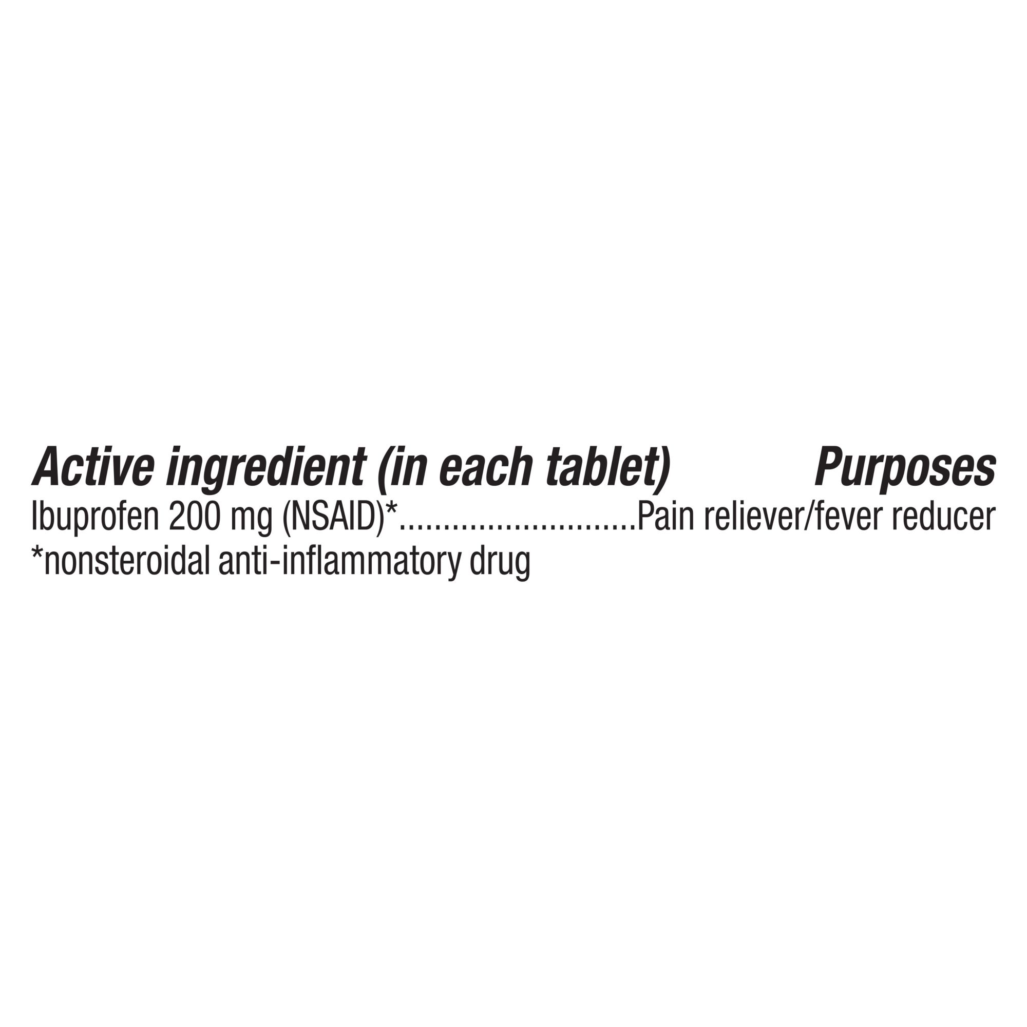 Active ingredient: This product contains ibuprofen 200mg, a pain reliever and fever reducer (NSAID). Compare to the active ingredient in Advil Ibuprofen Tablets.