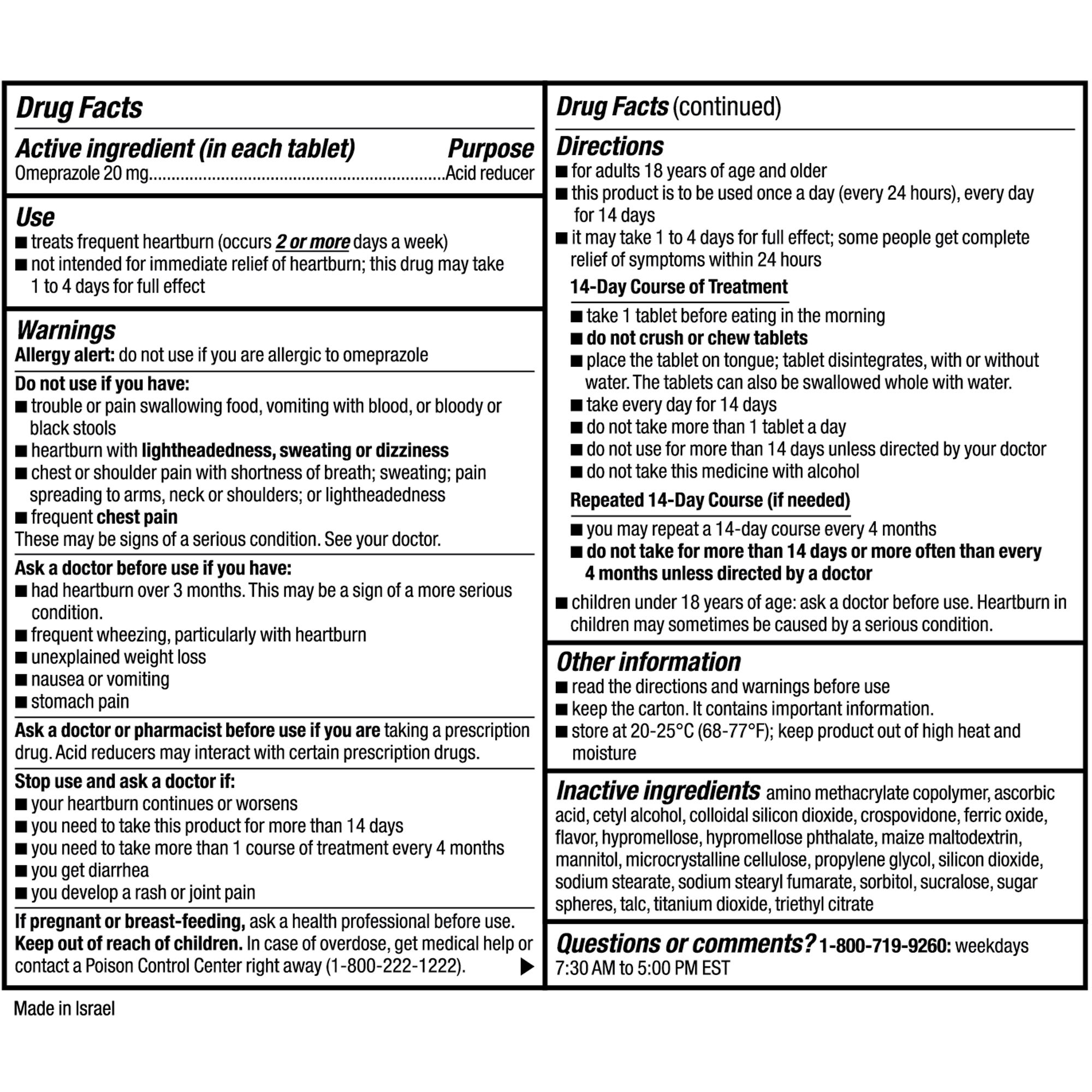 Allergy alert: do not use if you are allergic to omeprazole. Do not use if you have: trouble or pain swallowing food, vomiting with blood, or bloody or black stools; heartburn with lightheadedness, sweating or dizziness; chest or shoulder pain with shortness of breath; sweating; pain spreading to arms, neck or shoulders; or lightheadedness; frequent chest pain. These may be signs of a serious condition. See your doctor. Ask a doctor before use if you have: had heartburn over 3 months. This may be a sign of a more serious condition; frequent wheezing, particularly with heartburn; unexplained weight loss; nausea or vomiting; stomach pain. Ask a doctor or pharmacist before use if you are taking a prescription drug. Acid reducers may interact with certain prescription drugs. Stop use and ask a doctor if: your heartburn continues or worsens; you need to take this product for more than 14 days; you need to take more than 1 course of treatment every 4 months; you get diarrhea; you develop a rash or joint pain. If pregnant or breast-feeding, ask a health professional before use. Keep out of reach of children. In case of overdose, get medical help or contact a Poison Control Center right away (1-800-222-1222).