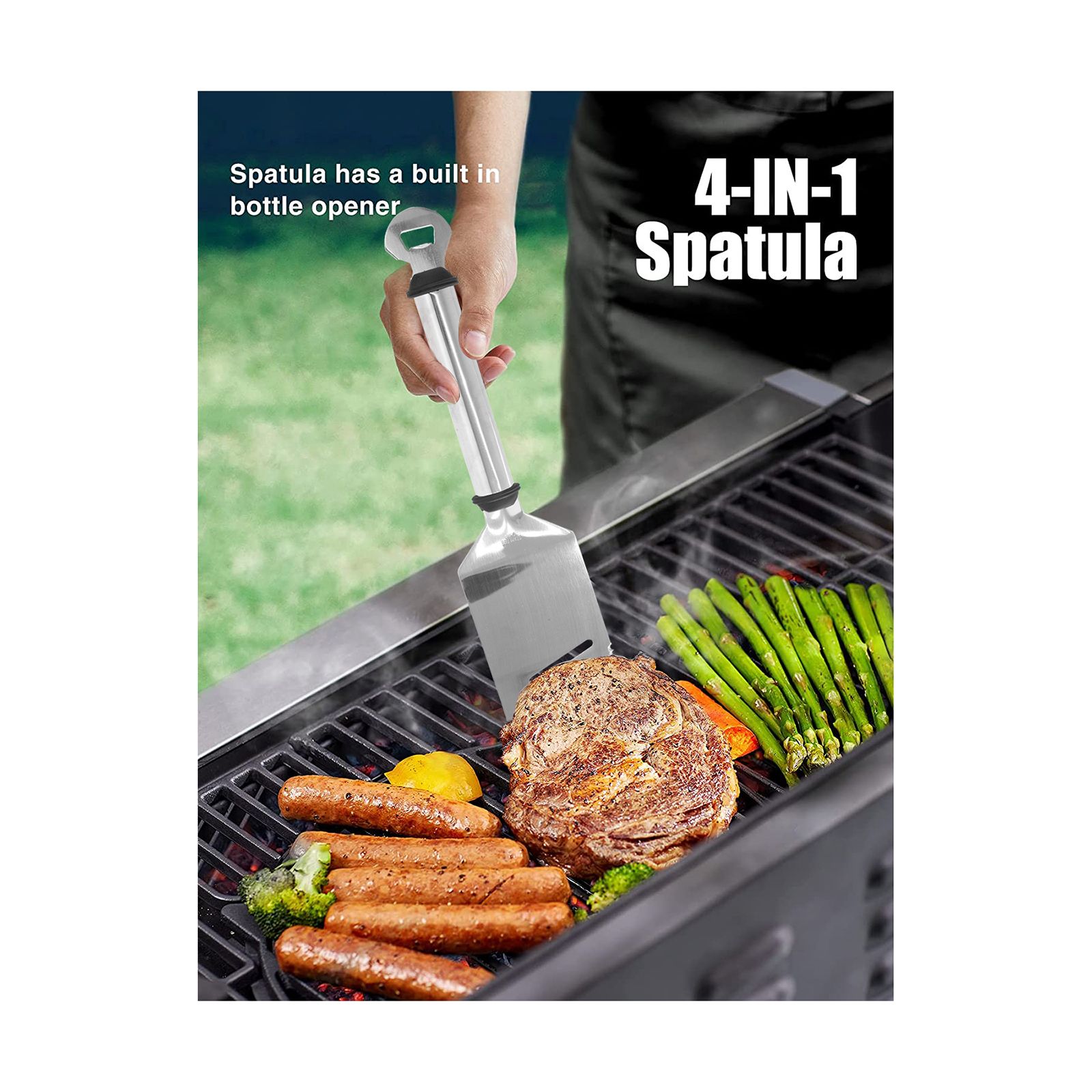 Four-in-one spatula flips, slices, tenderizes and opens bottles