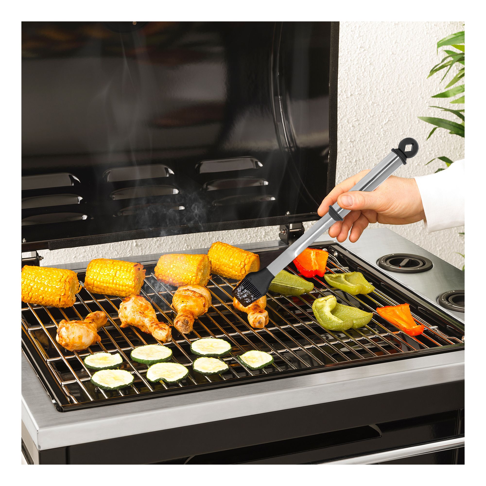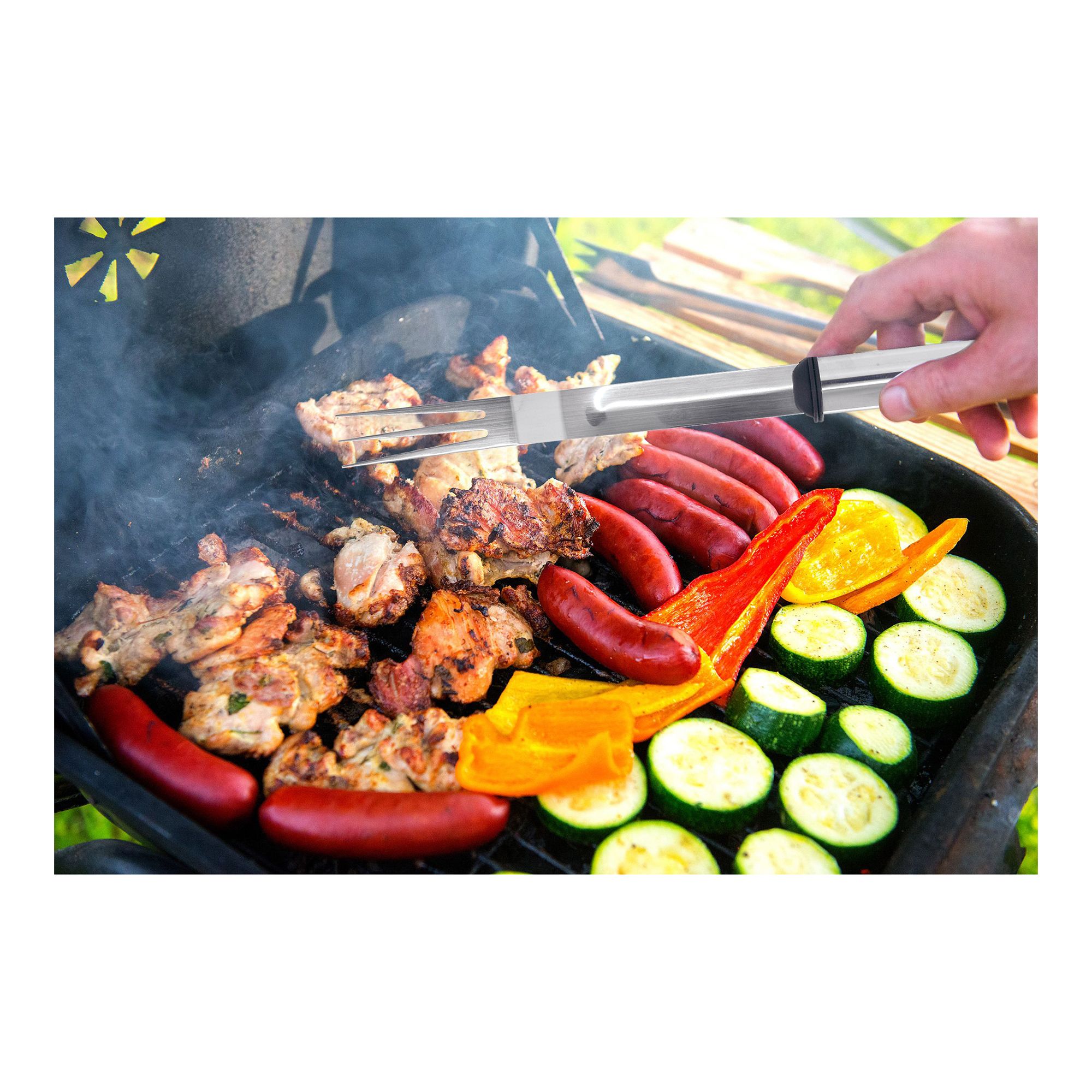 Includes oversized spatula, fork, basting brush, tongs, knife, four skewers, eight corn holders, CSA