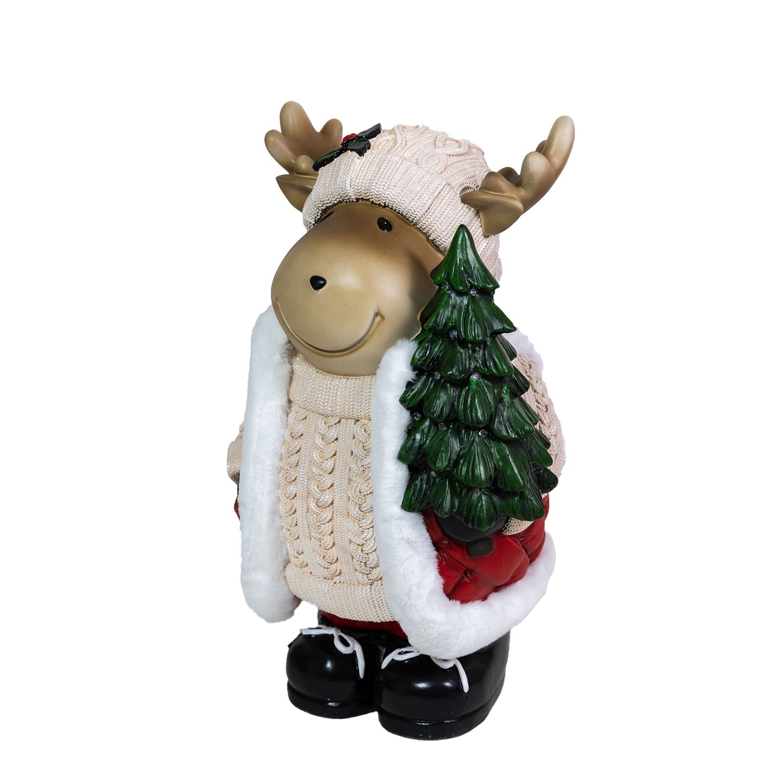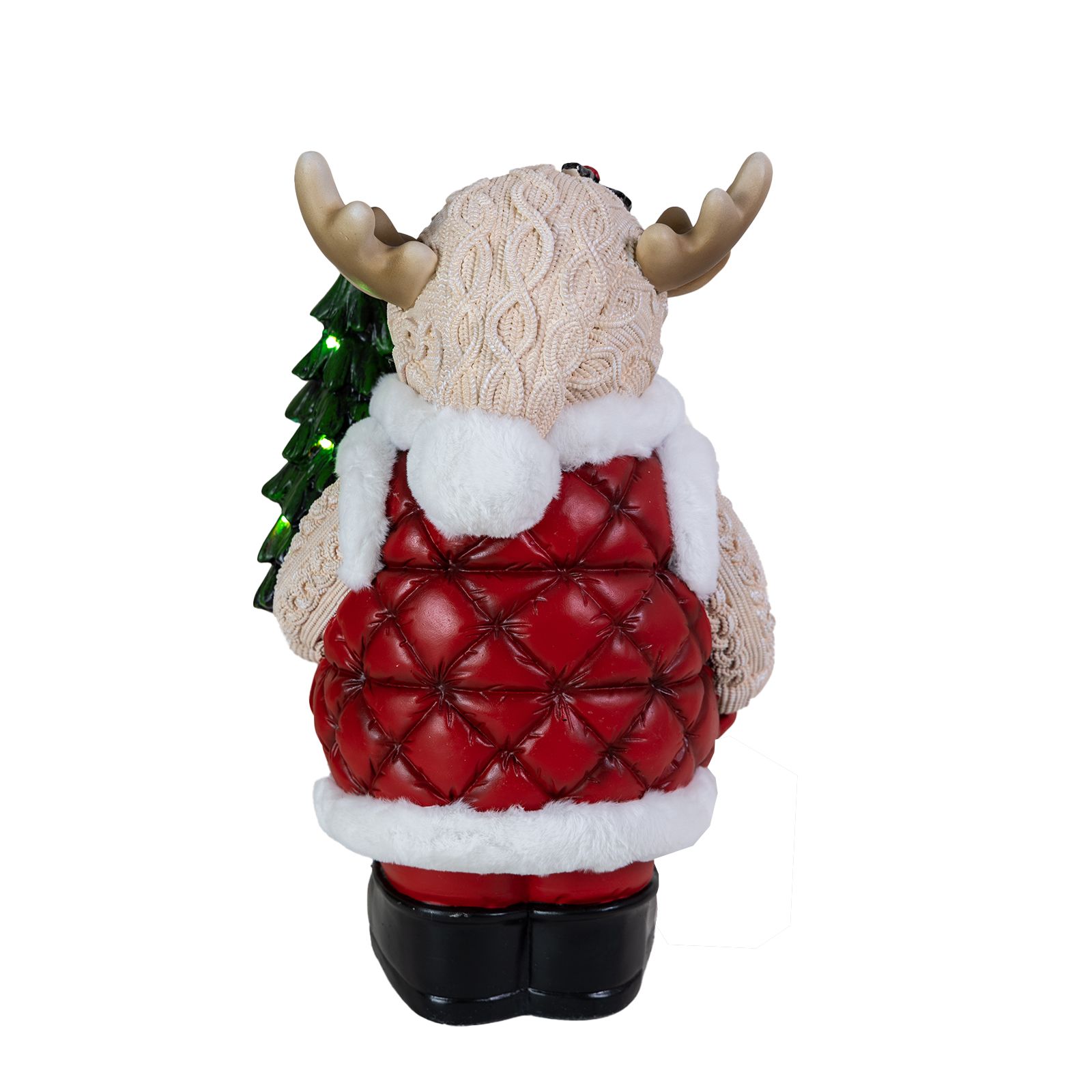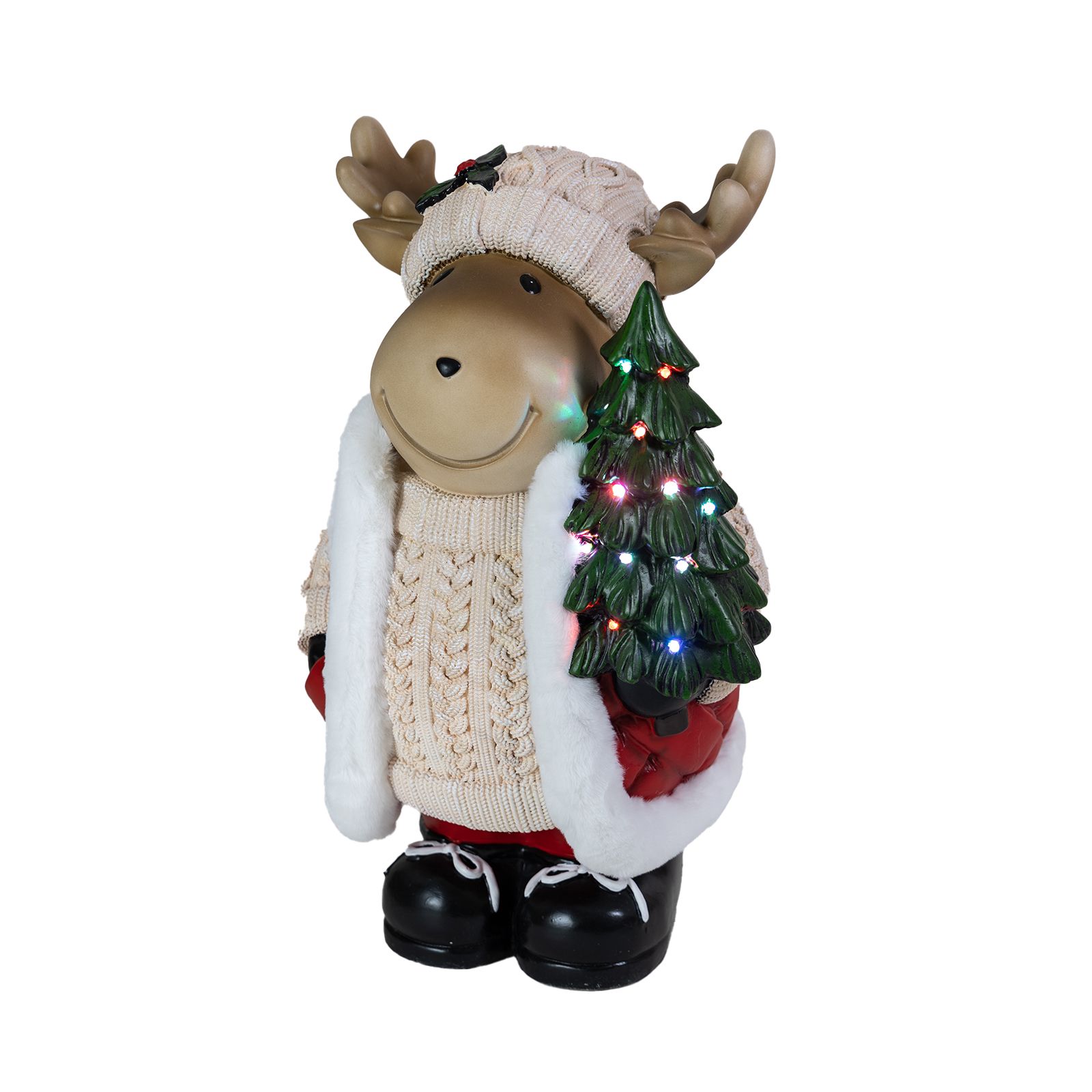 Meet your enchanting door greeter, a majestic moose adorned with a resplendent coat trimmed with fur, proudly carrying a shimmering, lighted Christmas tree upon its antlers. He looks both innocent and adorable and is a unique addition to any holiday décor. The Christmas tree he carries will glow in the night, thanks to its 16 LEDs that will enchant children and adults alike. Its charming smile, accentuated by a sprig of holly on its hat, spreads contagious happiness to visitors of all ages. This approximately 24” high colorful statuette, made of magnesium oxide, is a quality handmade figurine that stands on its own. In the moose's presence, the air is filled with anticipation and excitement, a tangible reminder of the joyous festivities awaiting just beyond the threshold