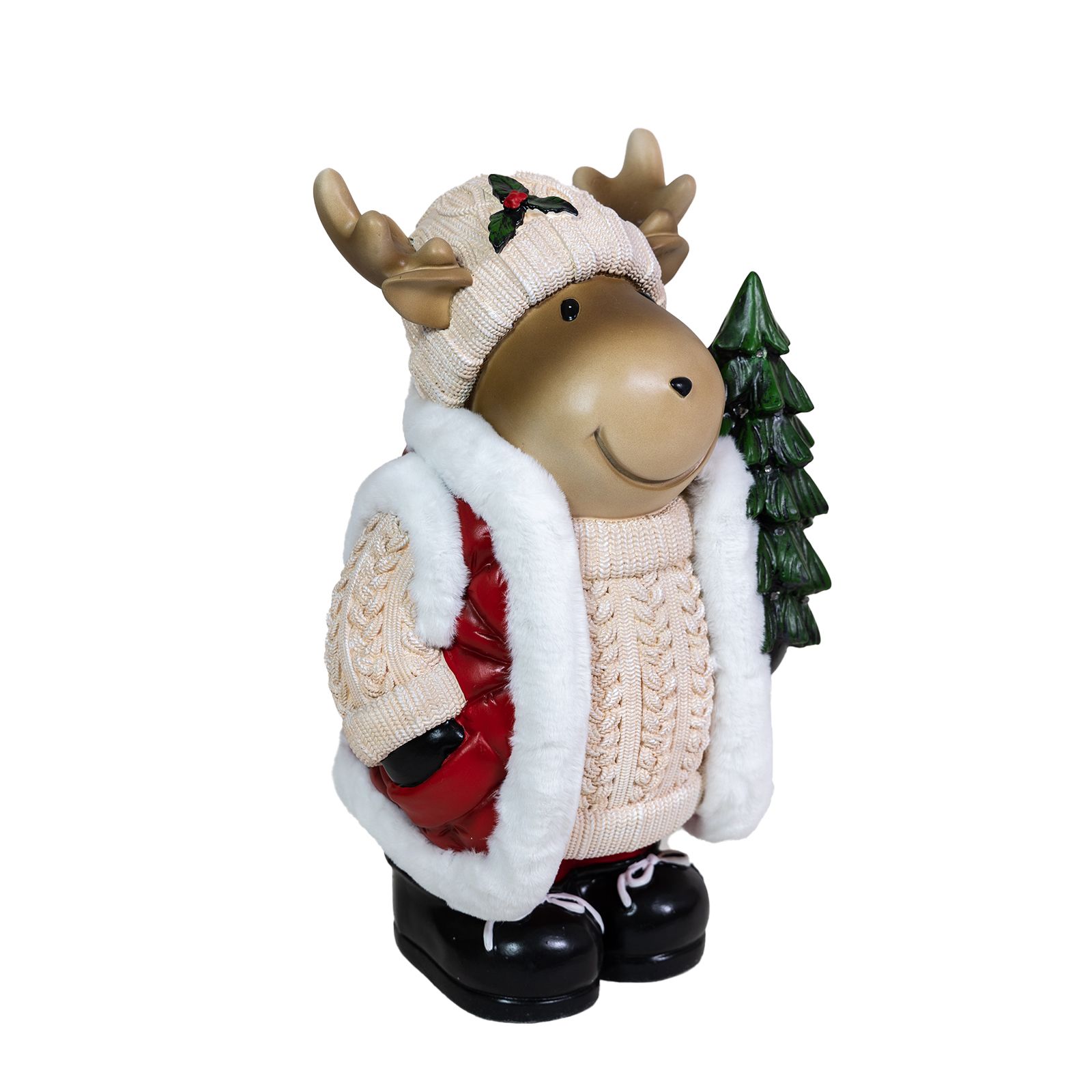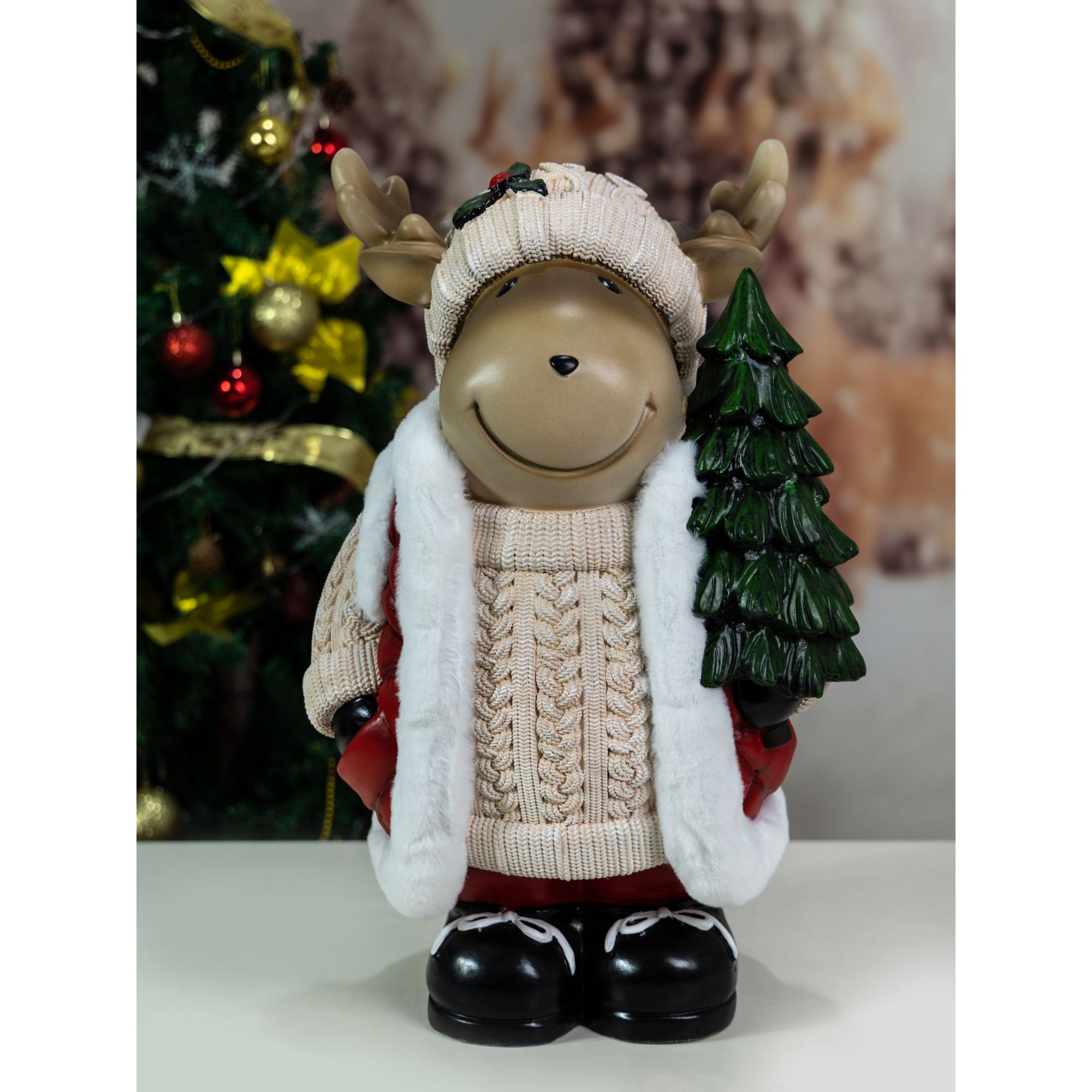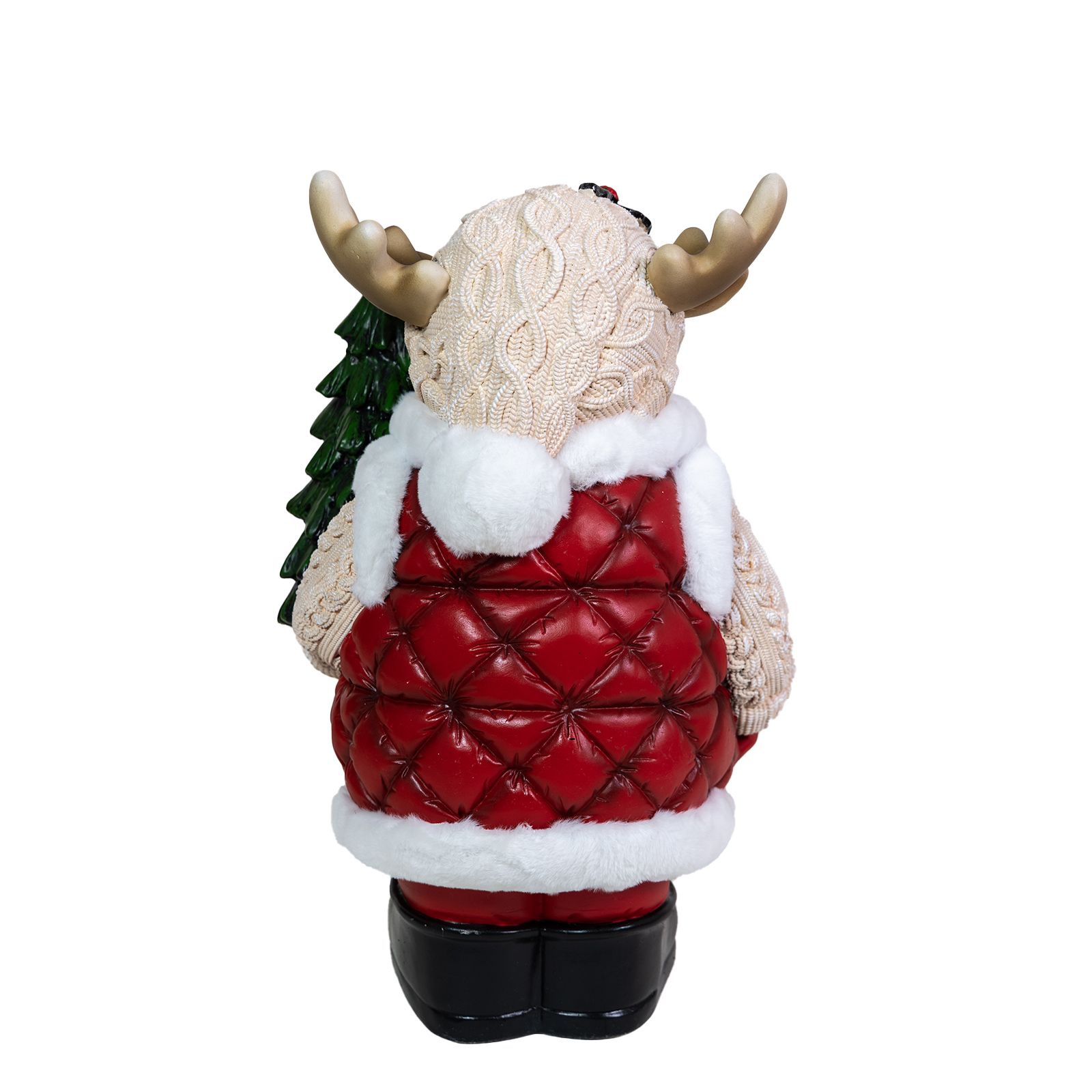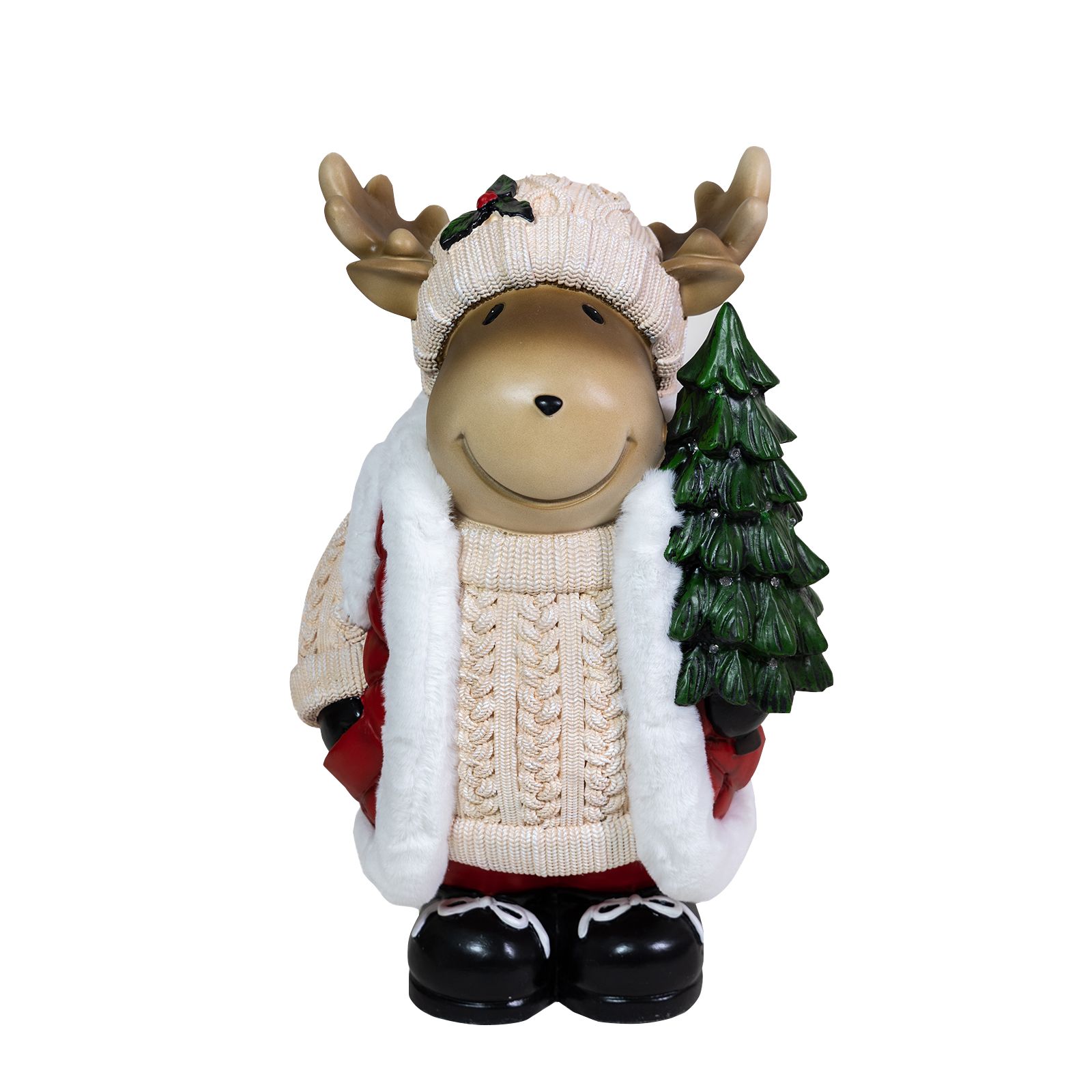 Meet your enchanting door greeter, a majestic moose adorned with a resplendent coat trimmed with fur, proudly carrying a shimmering, lighted Christmas tree upon its antlers. He looks both innocent and adorable and is a unique addition to any holiday décor. The Christmas tree he carries will glow in the night, thanks to its 16 LEDs that will enchant children and adults alike. Its charming smile, accentuated by a sprig of holly on its hat, spreads contagious happiness to visitors of all ages. This approximately 24” high colorful statuette, made of magnesium oxide, is a quality handmade figurine that stands on its own. In the moose's presence, the air is filled with anticipation and excitement, a tangible reminder of the joyous festivities awaiting just beyond the threshold