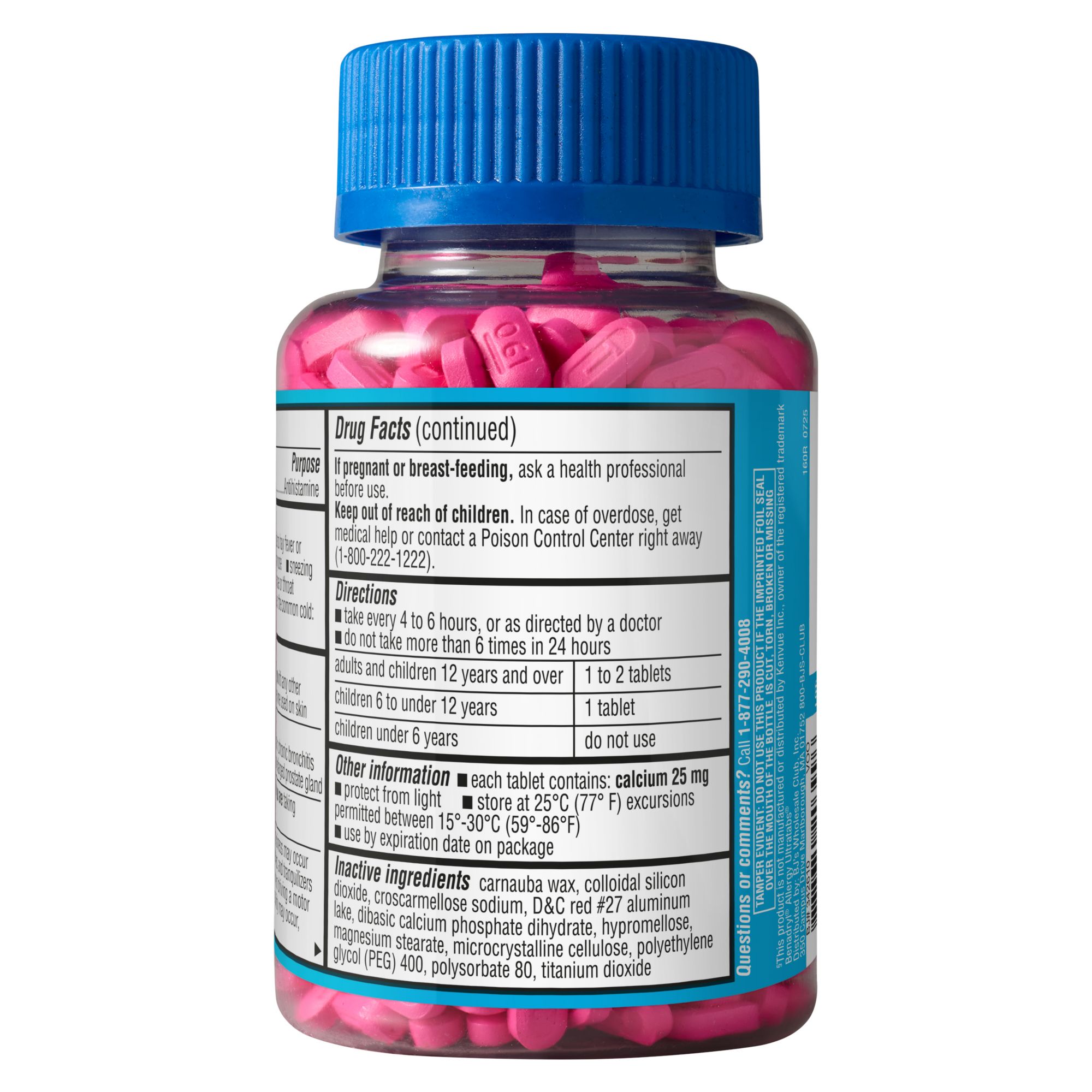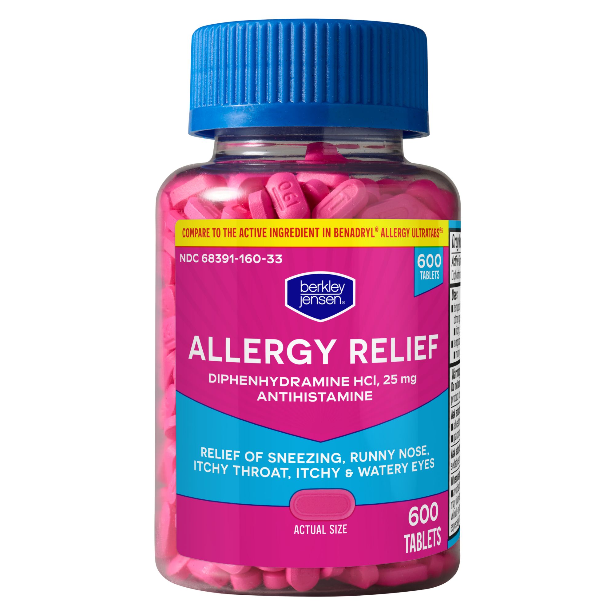 Berkley Jensen 25mg Diphenhydramine Hydrochloride Antihistamine Tablets are designed for the temporary relief of hay fever or other upper respiratory allergies. These tablets contain the active ingredient Diphenhydramine Hydrochloride 25 mg, which compares to the active ingredient in Benadryl Allergy Ultratabs. Helps to relieve a runny nose, sneezing, itchy watery eyes, and itching of the nose or throat. Pack of 600 tablets.