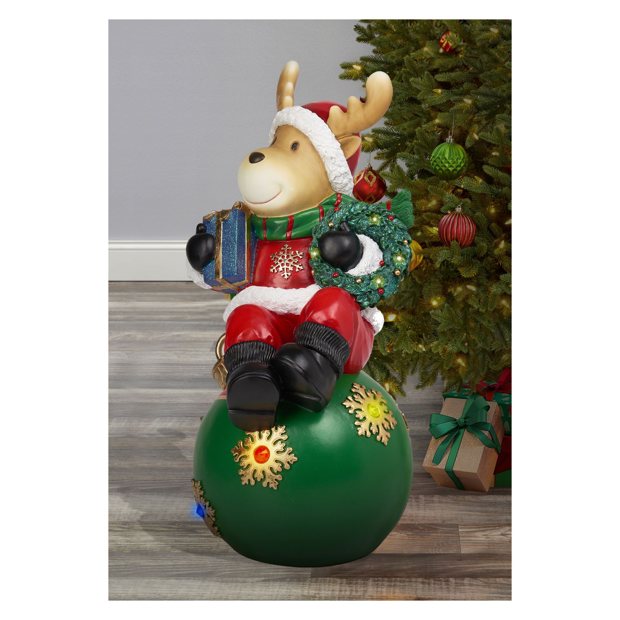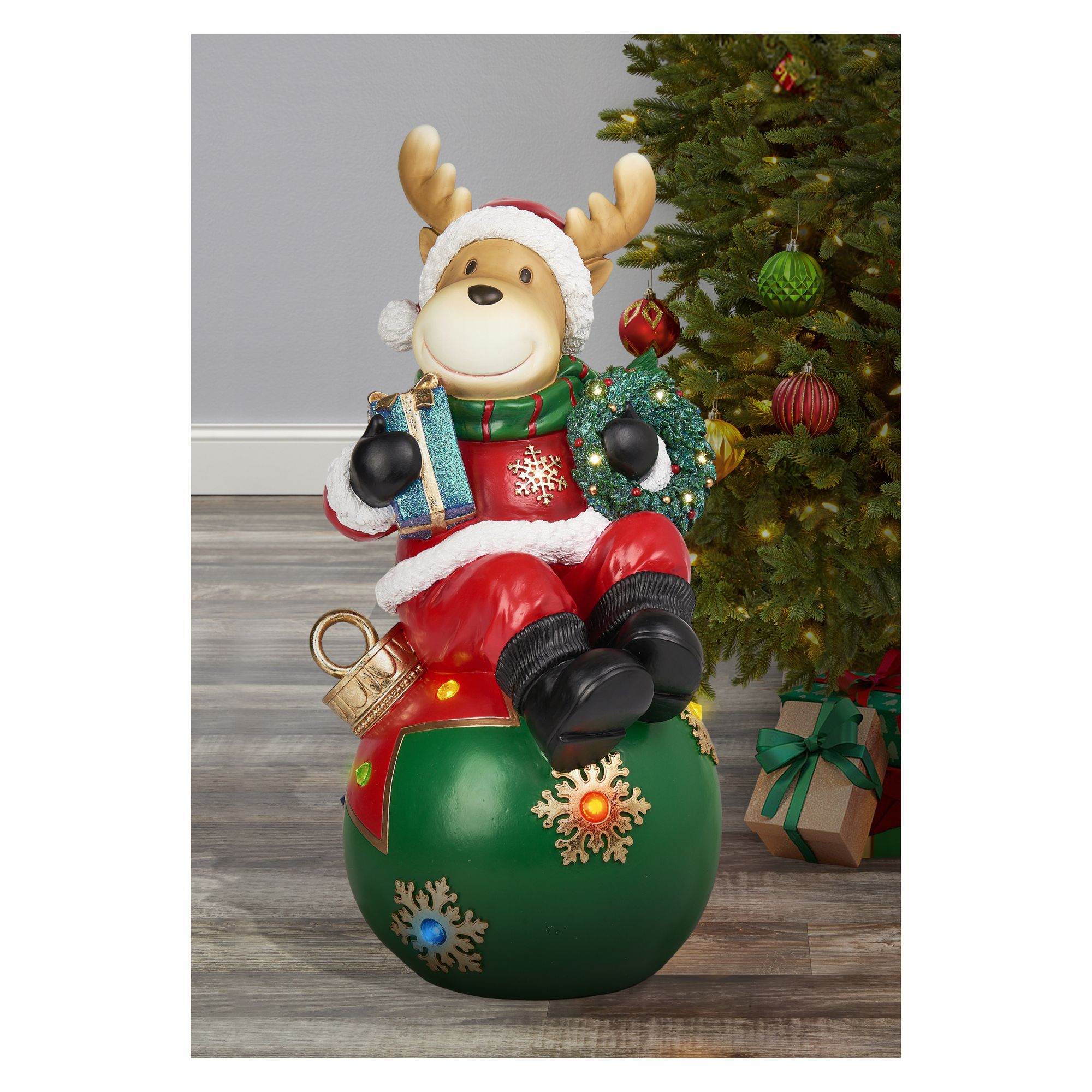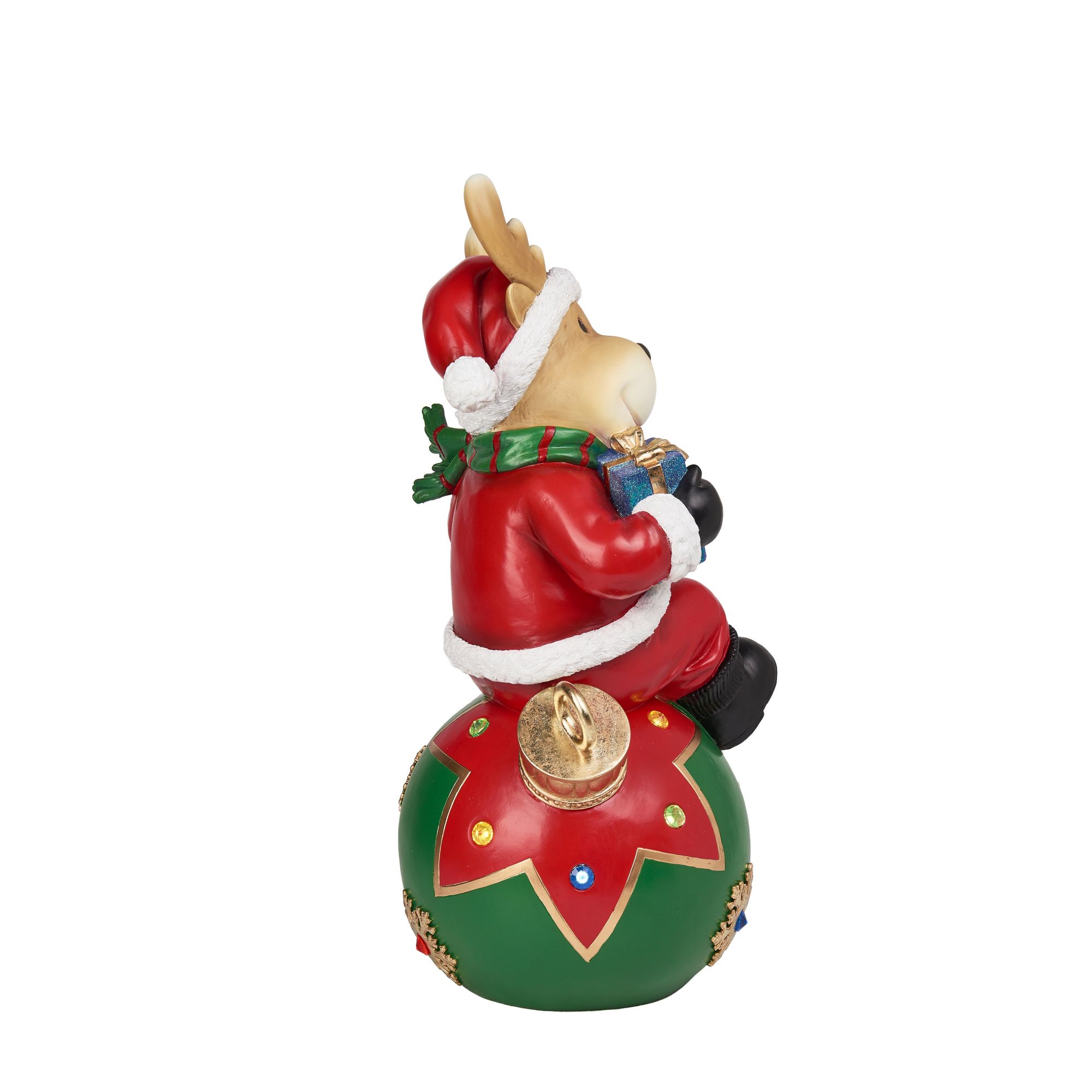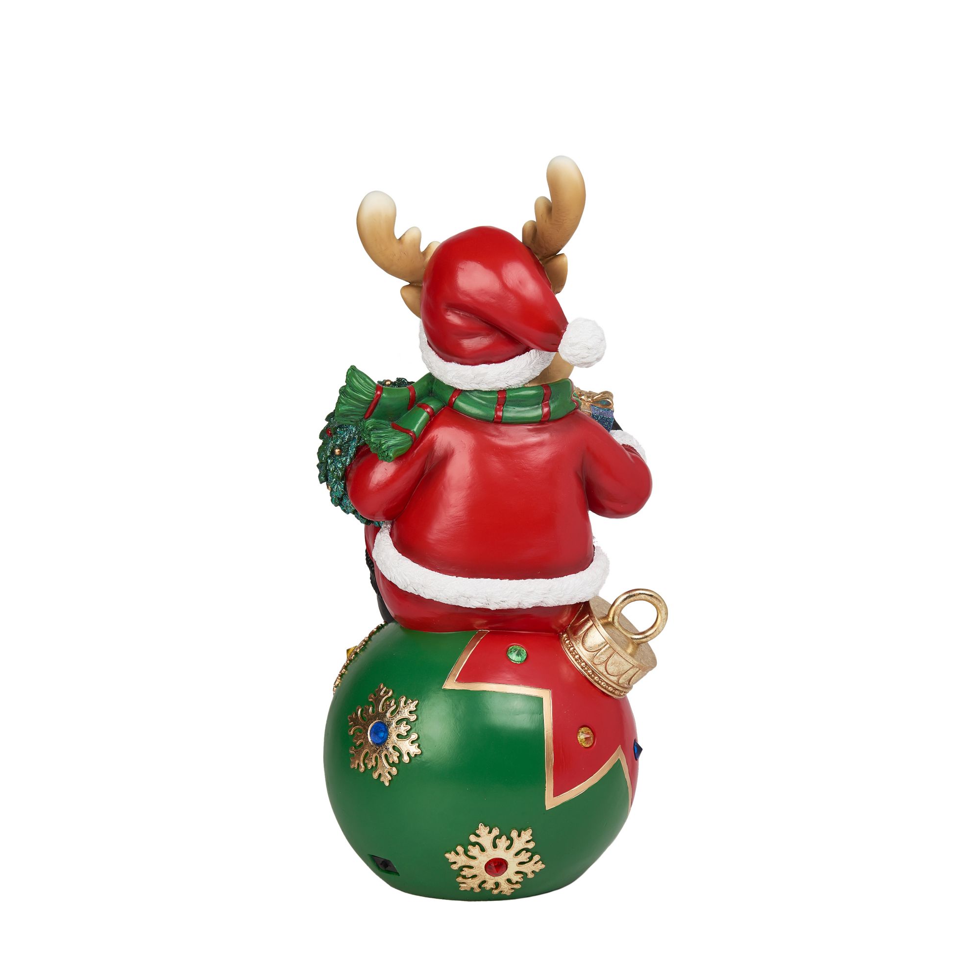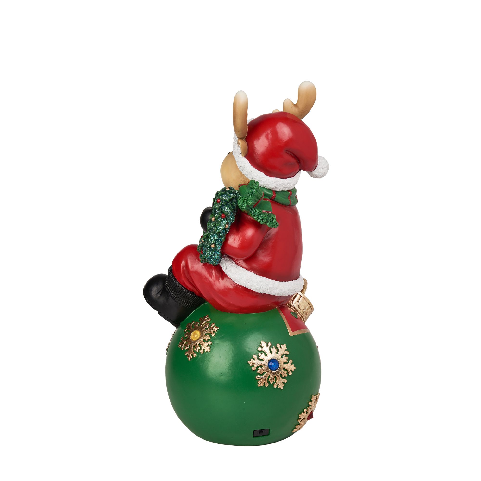 This happy "Santa Reindeer" sitting atop a Christmas Ornament will make a colorful and fun Christmas statement in your home this holiday season. Made of resin and hand-painted, the Reindeer is adorned in a Santa outfit and hat bringing a holiday cheer with a glowing smile, punctuated with prelit LED lights. The item can be used on both indoor or outdoor covered porch.