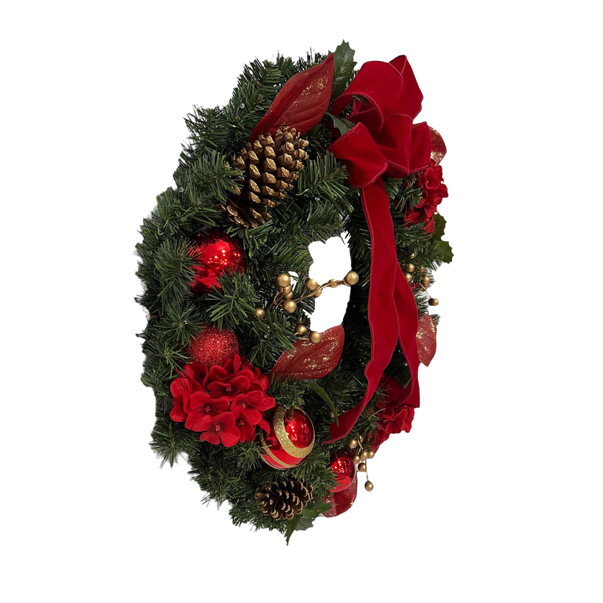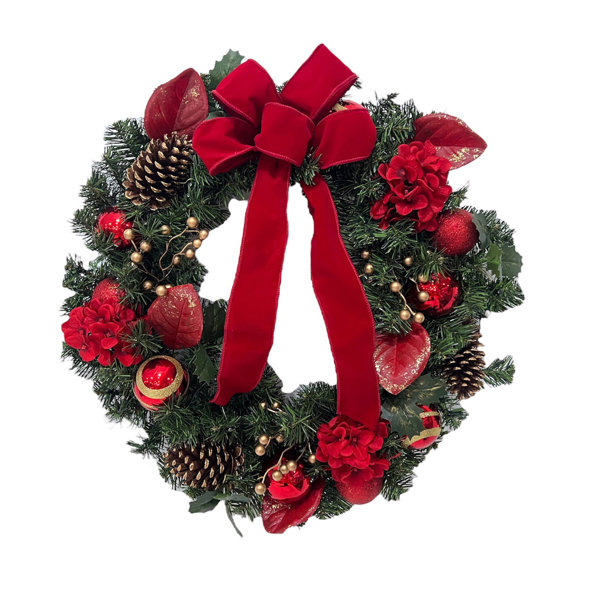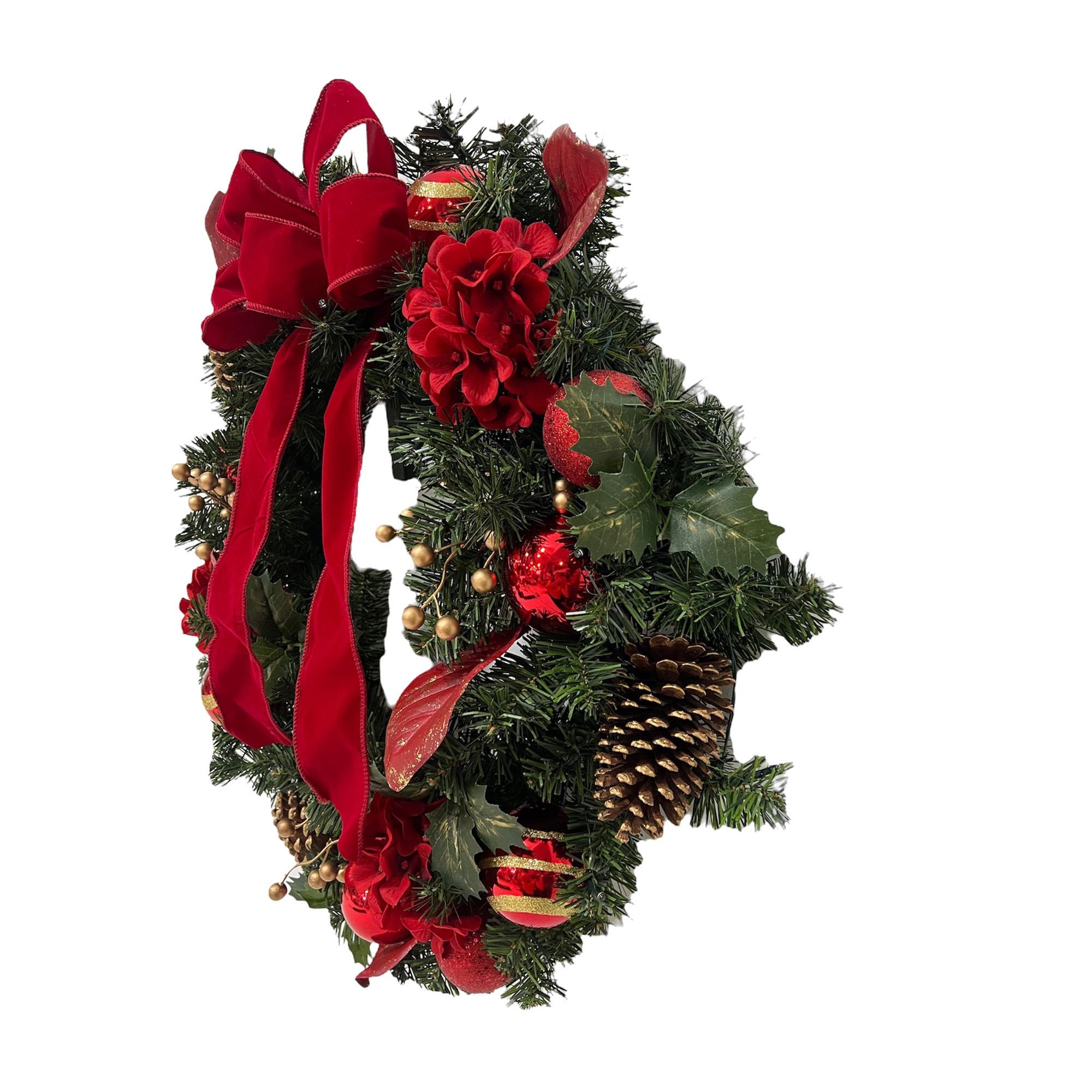 Make the holidays merry and bright with this 28" red Christmas wreath that features a red ribbon and pinecones. All your family, friends and guests will feel the warmth of the holidays right away when they are greeted at the entrance of your home with this gorgeous wreath hanging on the front door. This lovely wreath will also reflect a festive look inside hanging on your living room wall above the fireplace mantle.