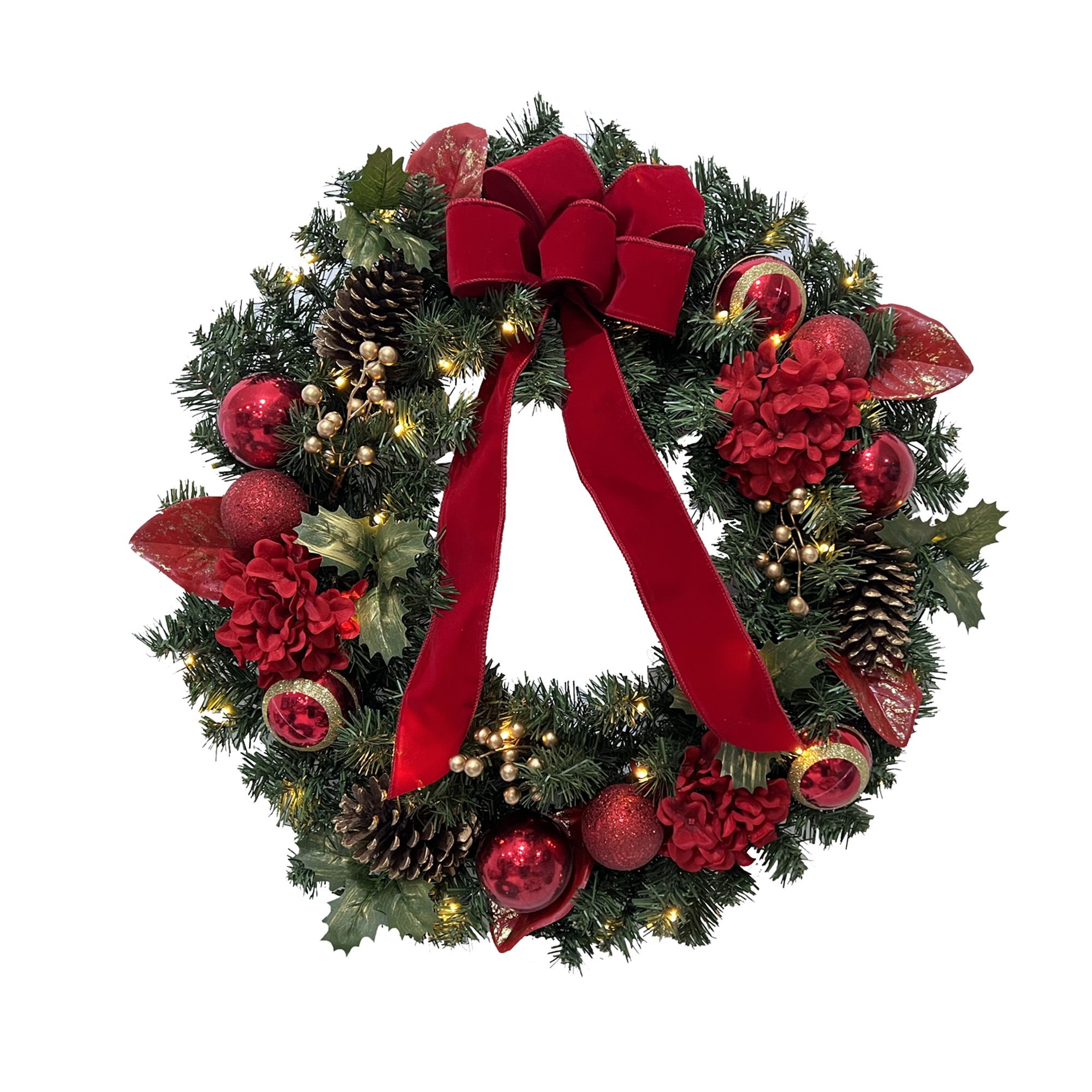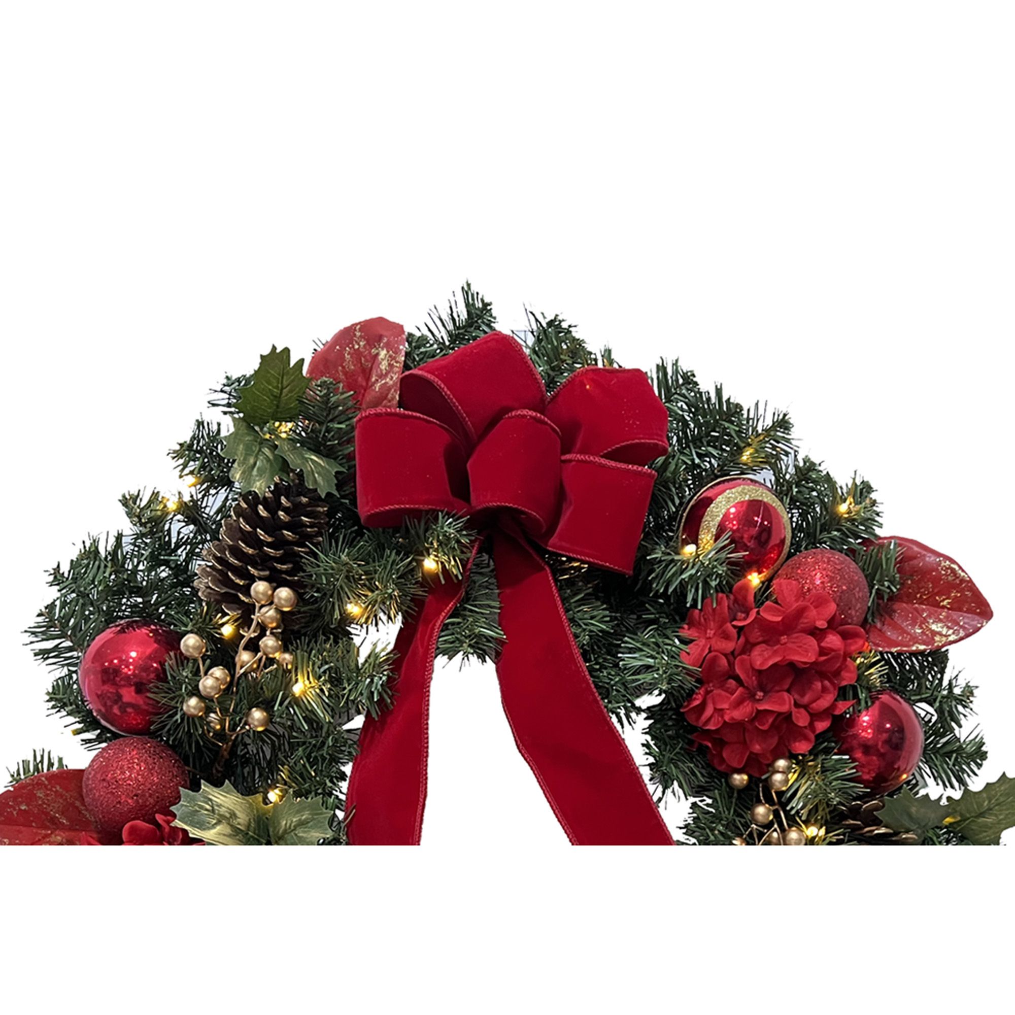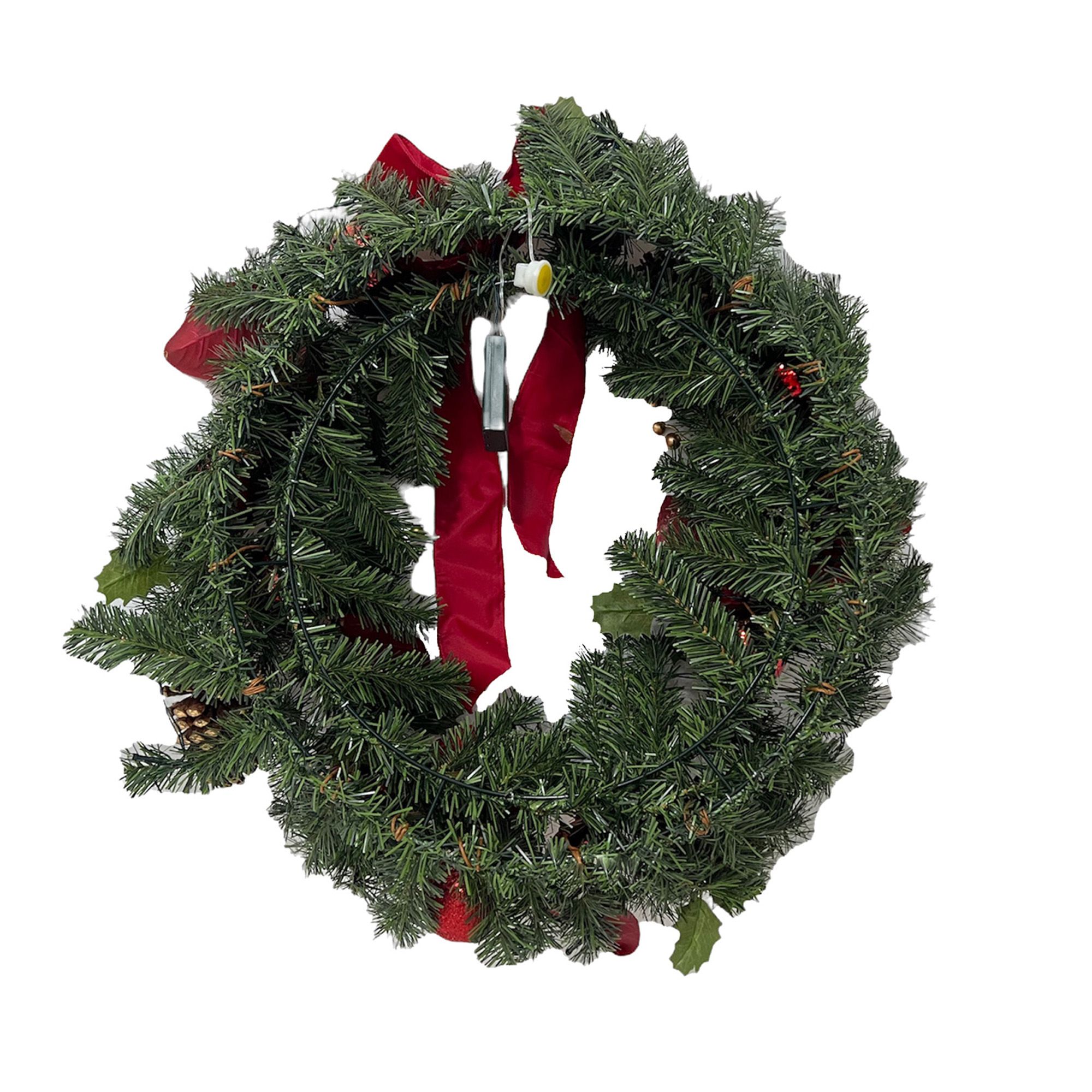 Includes 28” Christmas wreath with 409 battery-powered LEDs and red/gold ribbons