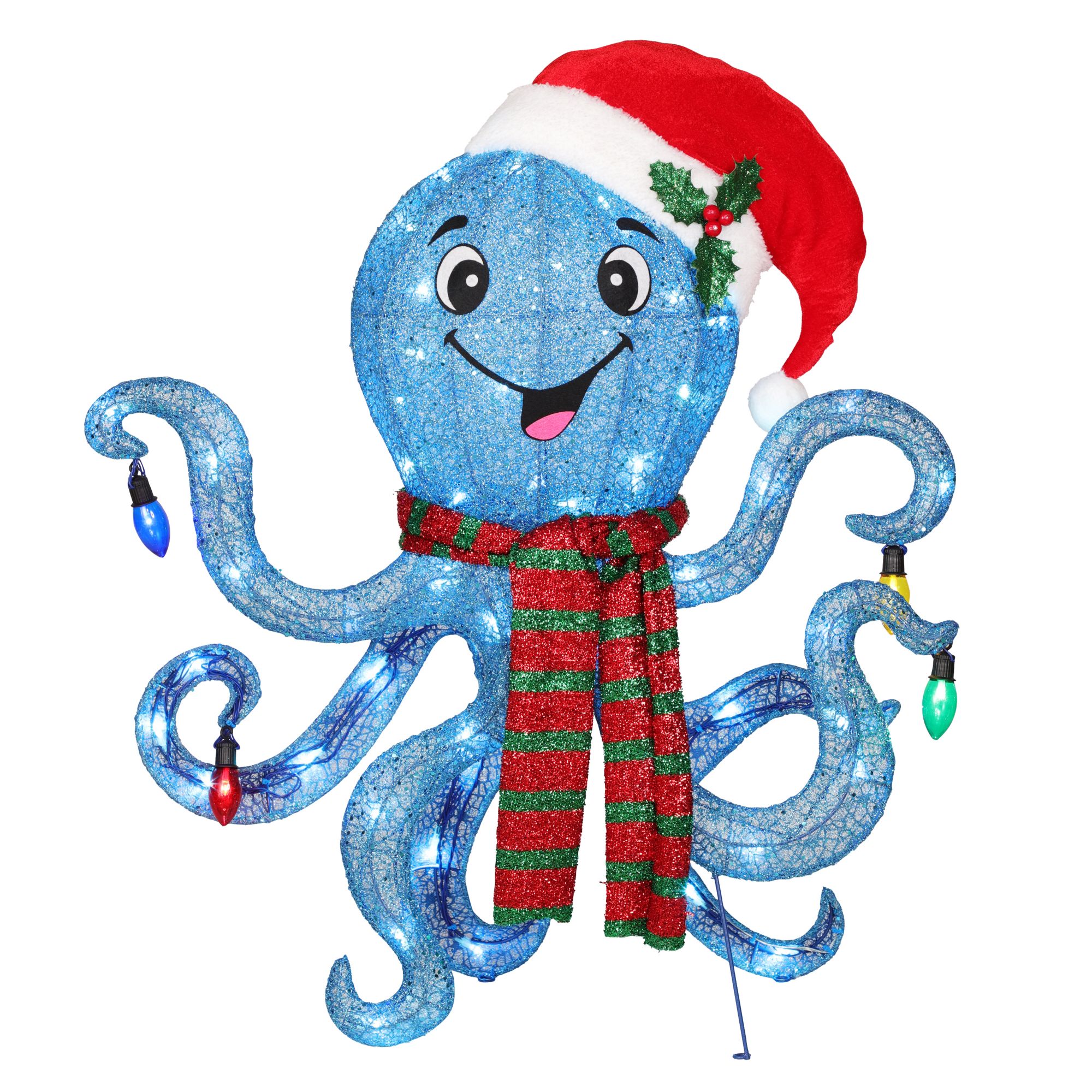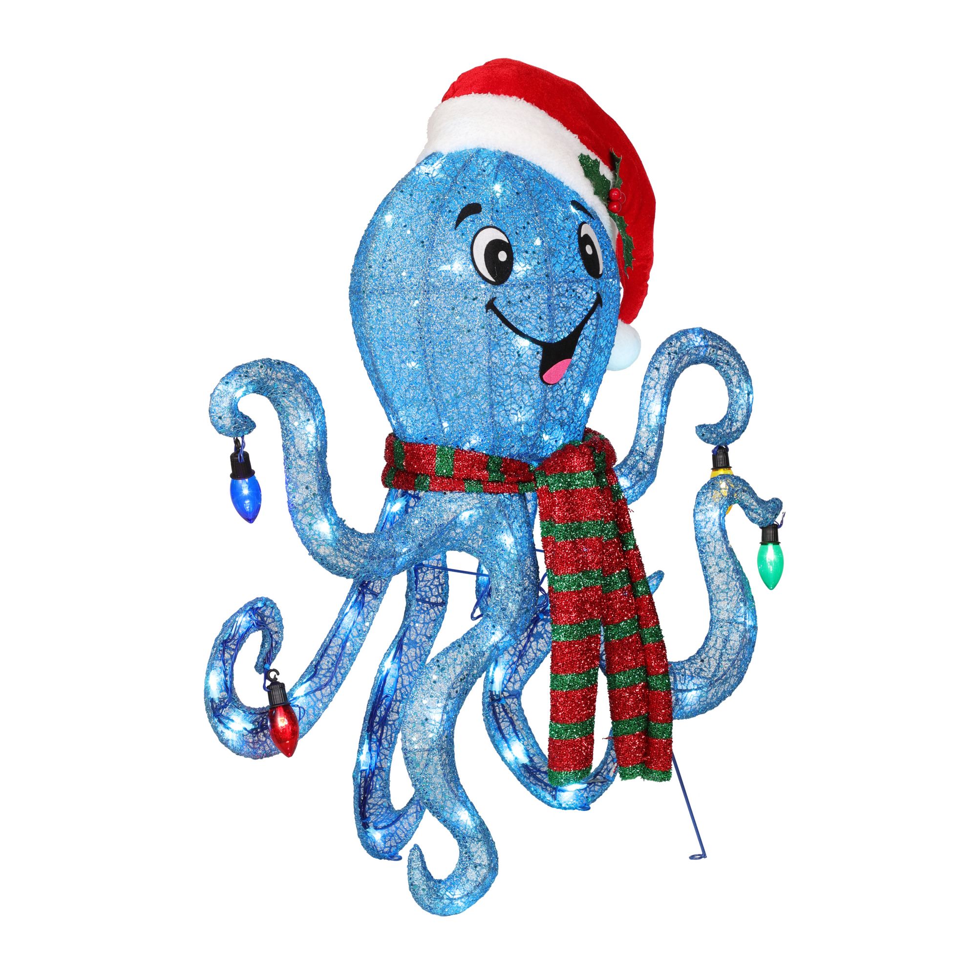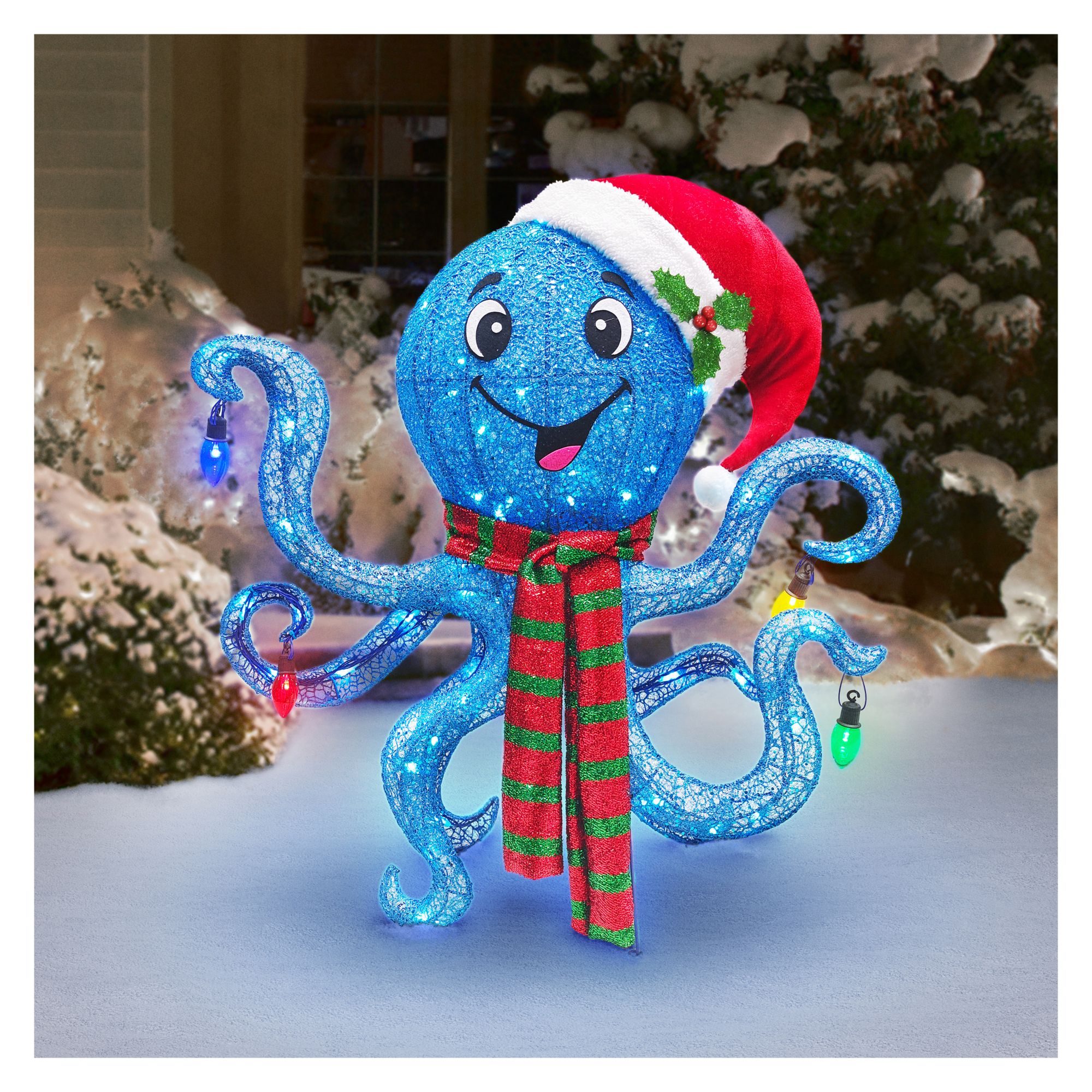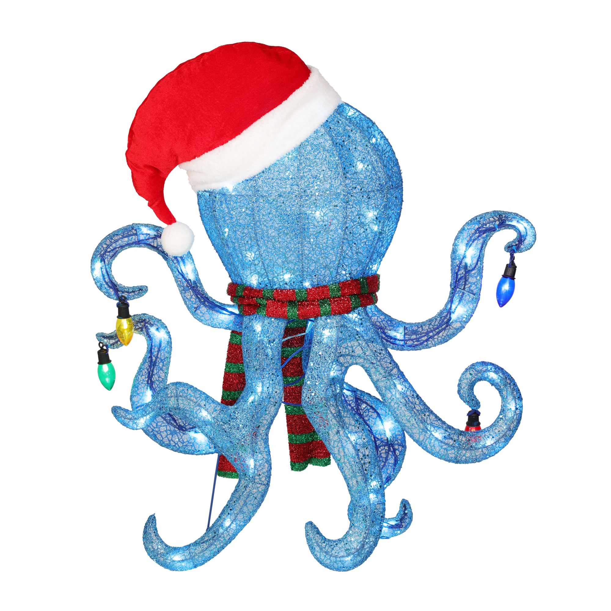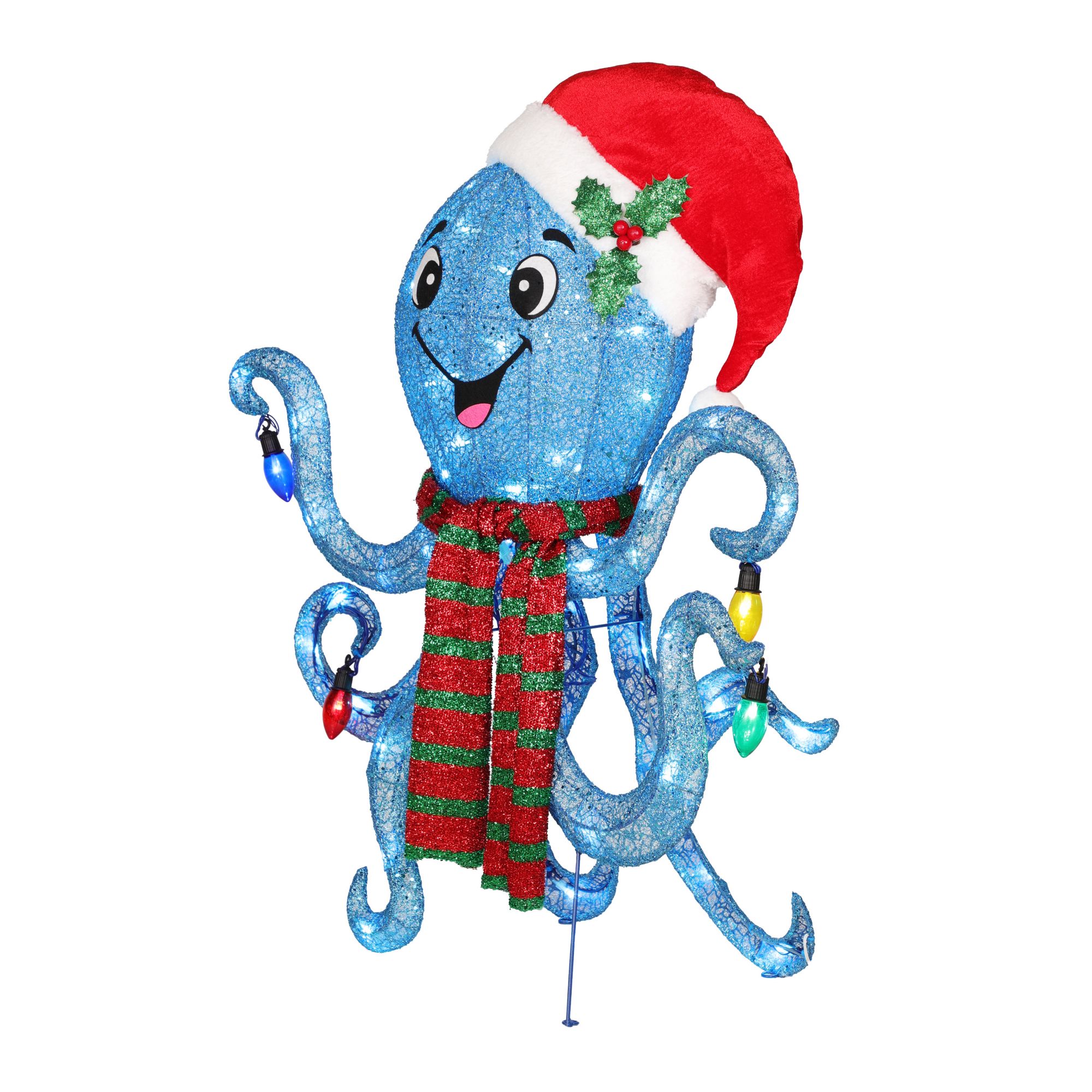 Includes 32" tall lighted Octopus with Christmas hat, 60 blue twinkling LED lights