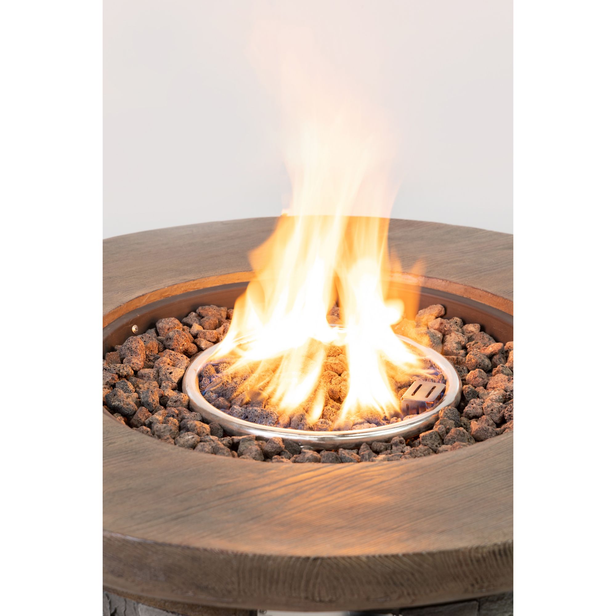 This Round Outdoor Wood/Stone Gas Fire Pit provides 50,000 BTU of heat, making it great for entertaining during cooler summer evenings. The unit made of magnesium oxide is resistant and its faux stone base will become a great focal point for any patio area. This round fire pit features 50,000 BTU heat output from a propane tank (not included) concealed by the decorative faux stone panel, uses a pulse ignition start and easy adjustment of flame with simple switch control, the included changing color lava rock enhances the feel and look of hot embers glowing in the fire. It is toasty enough to keep you warm well into the chilly fall season. The fire pit comes with a protective PVC cover and changing color lava rock.