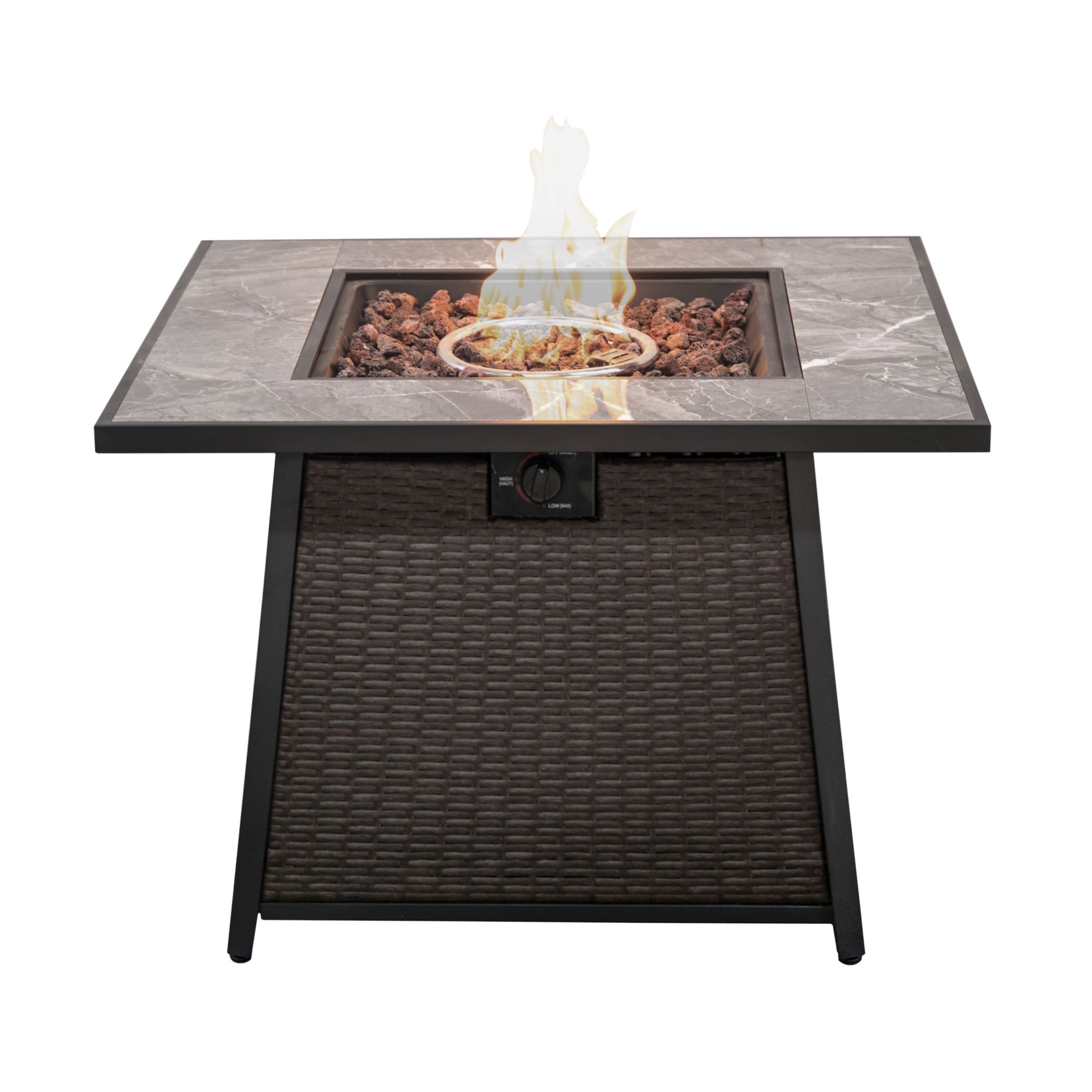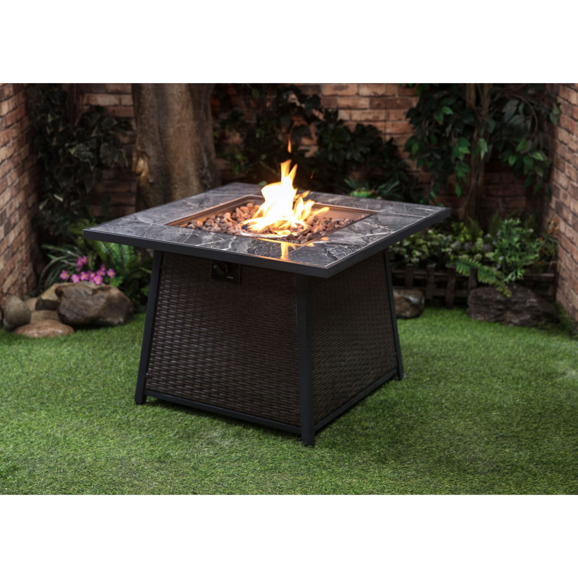 Woven wicker base and tile tabletop Produces 50,000 BTU of heart Metal cover and PVC cover 20lb propane tank not included Includes gas fire pit, lava rocks, metal cover, and PVC cover Warranty: 1 year