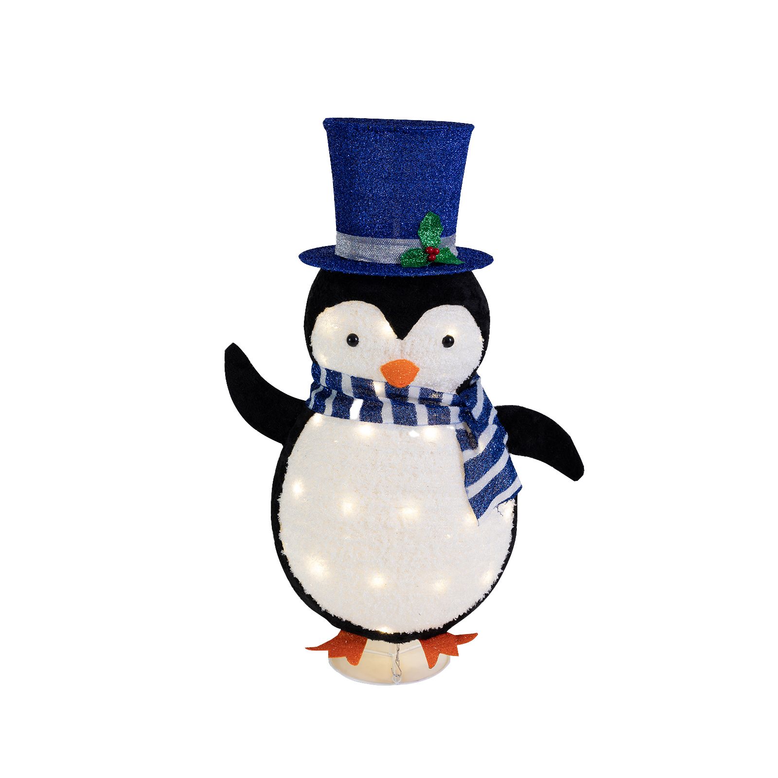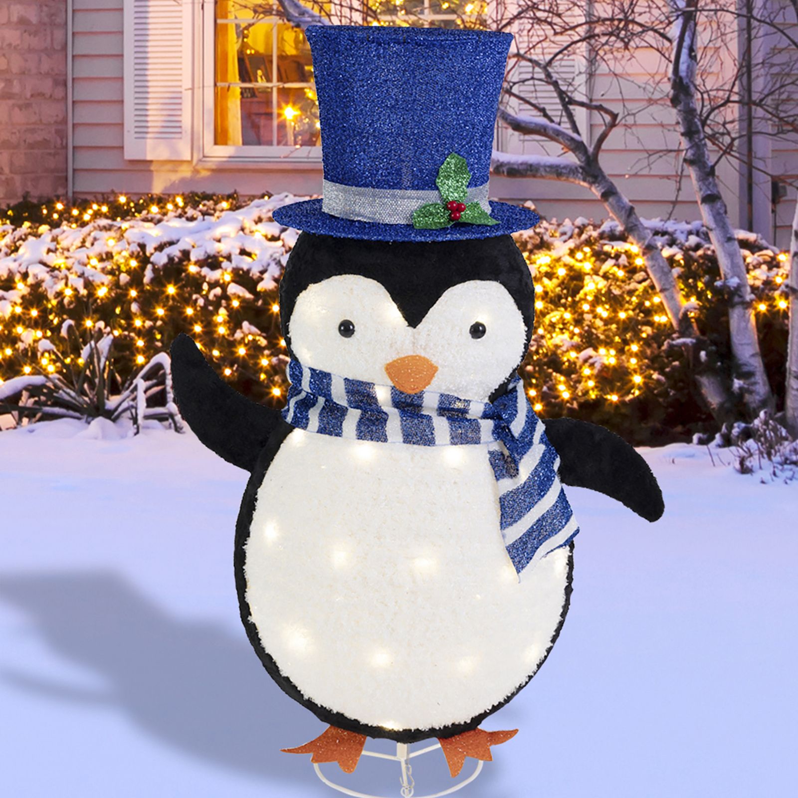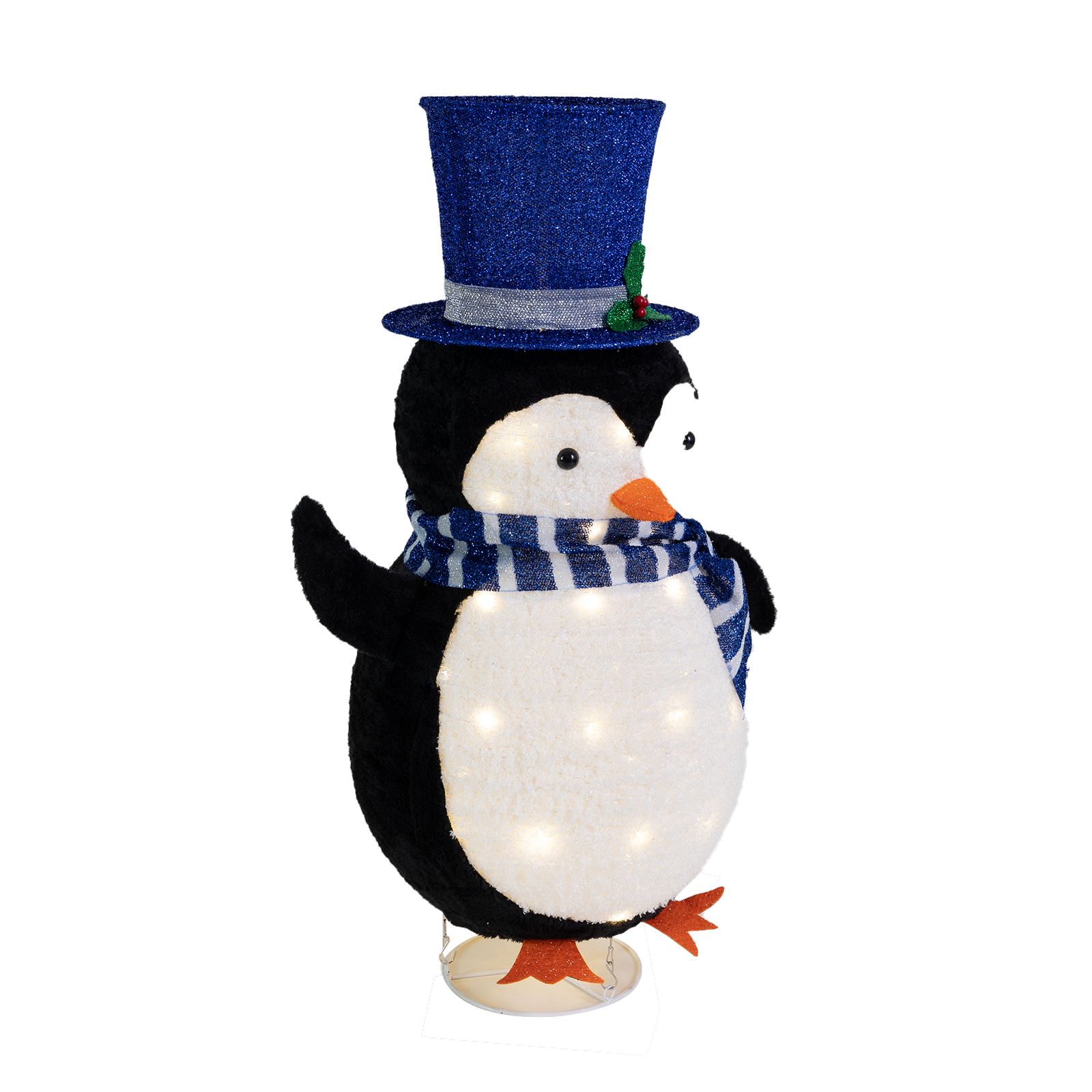 This charming collapsible lighted penguin is a delightful addition to your Christmas decor. This 3’ tall cheerful penguin brings the magic of the holiday season to life in a compact and captivating form. Crafted with festive appeal, this penguin showcases the iconic features that make him beloved worldwide. Dressed in a white and blue striped scarf and a blue silk hat with a sprig of holly, he embodies the spirit of the holiday season. It comes equipped with a convenient six-hour timer, allowing you to effortlessly set the 60 LED lights to automatically turn on for six hours before automatically shutting off, conserving energy and providing hassle-free operation. Designed with ease of use in mind, this penguin is collapsible and allows for convenient storage during the off-season.