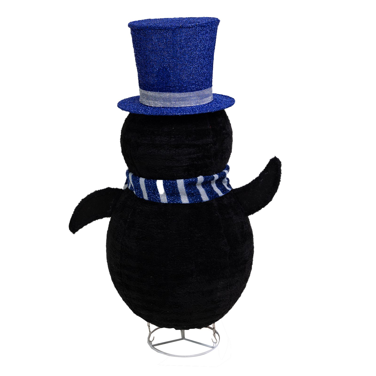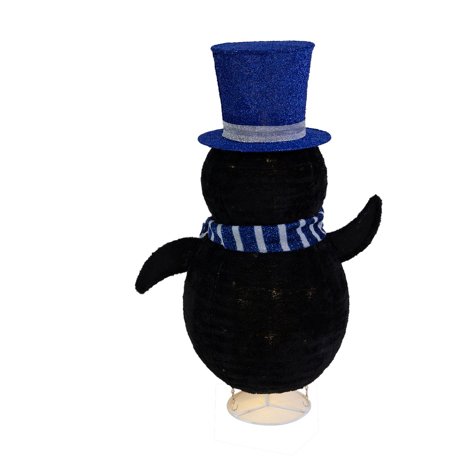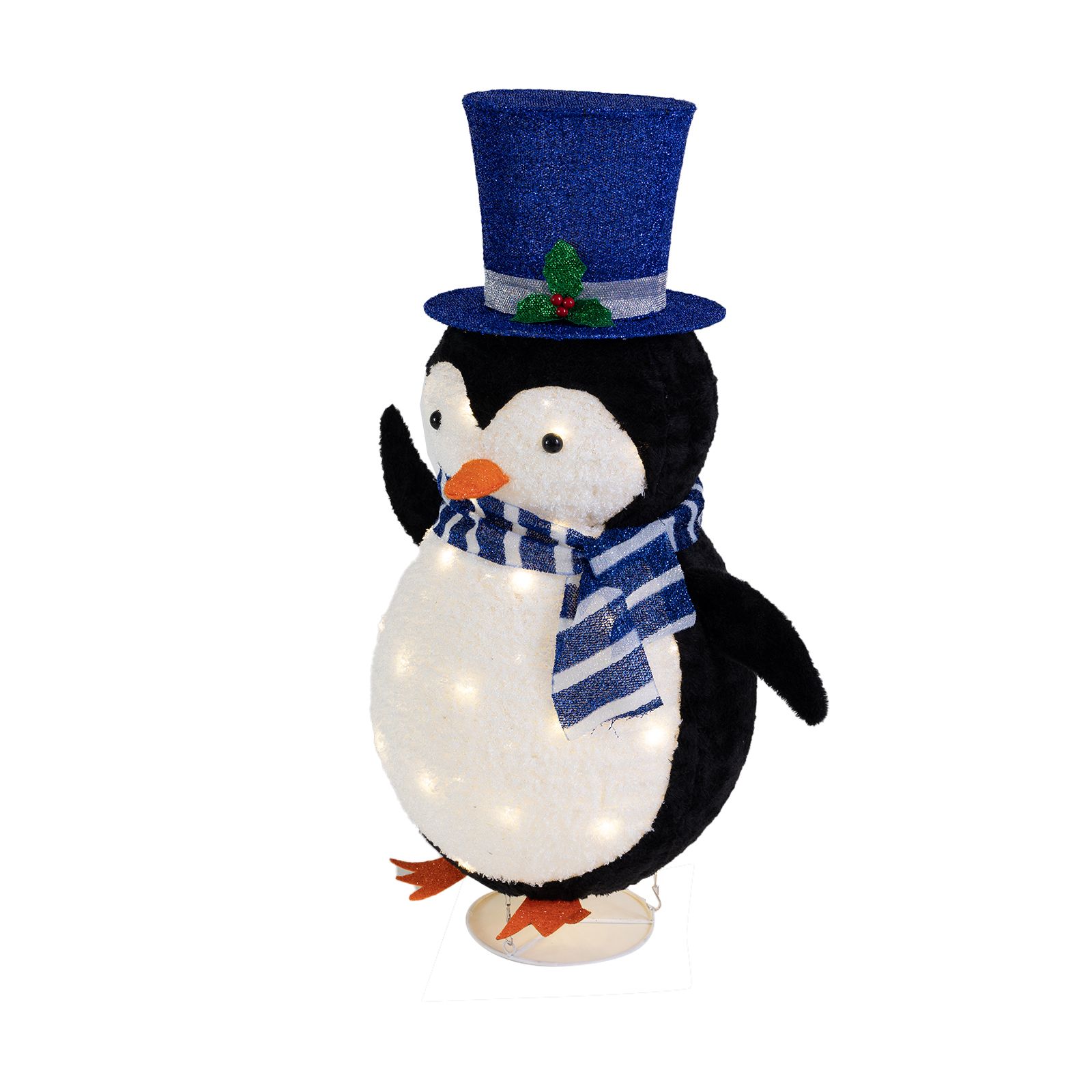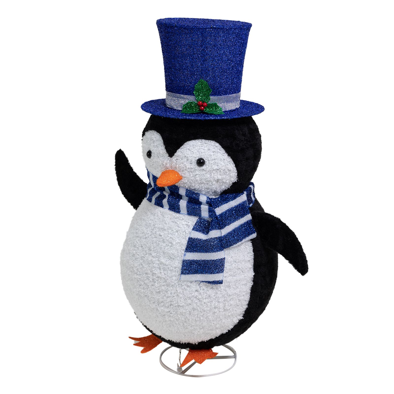 This charming collapsible lighted penguin is a delightful addition to your Christmas decor. This 3’ tall cheerful penguin brings the magic of the holiday season to life in a compact and captivating form. Crafted with festive appeal, this penguin showcases the iconic features that make him beloved worldwide. Dressed in a white and blue striped scarf and a blue silk hat with a sprig of holly, he embodies the spirit of the holiday season. It comes equipped with a convenient six-hour timer, allowing you to effortlessly set the 60 LED lights to automatically turn on for six hours before automatically shutting off, conserving energy and providing hassle-free operation. Designed with ease of use in mind, this penguin is collapsible and allows for convenient storage during the off-season.